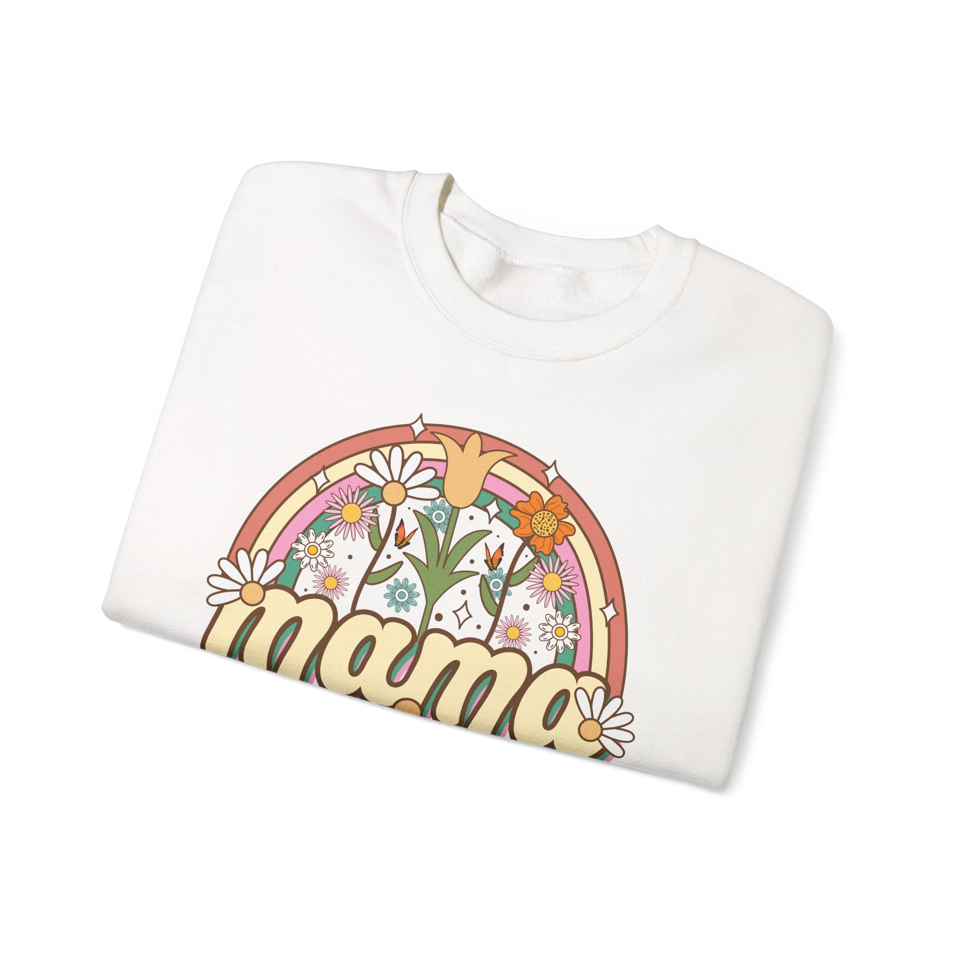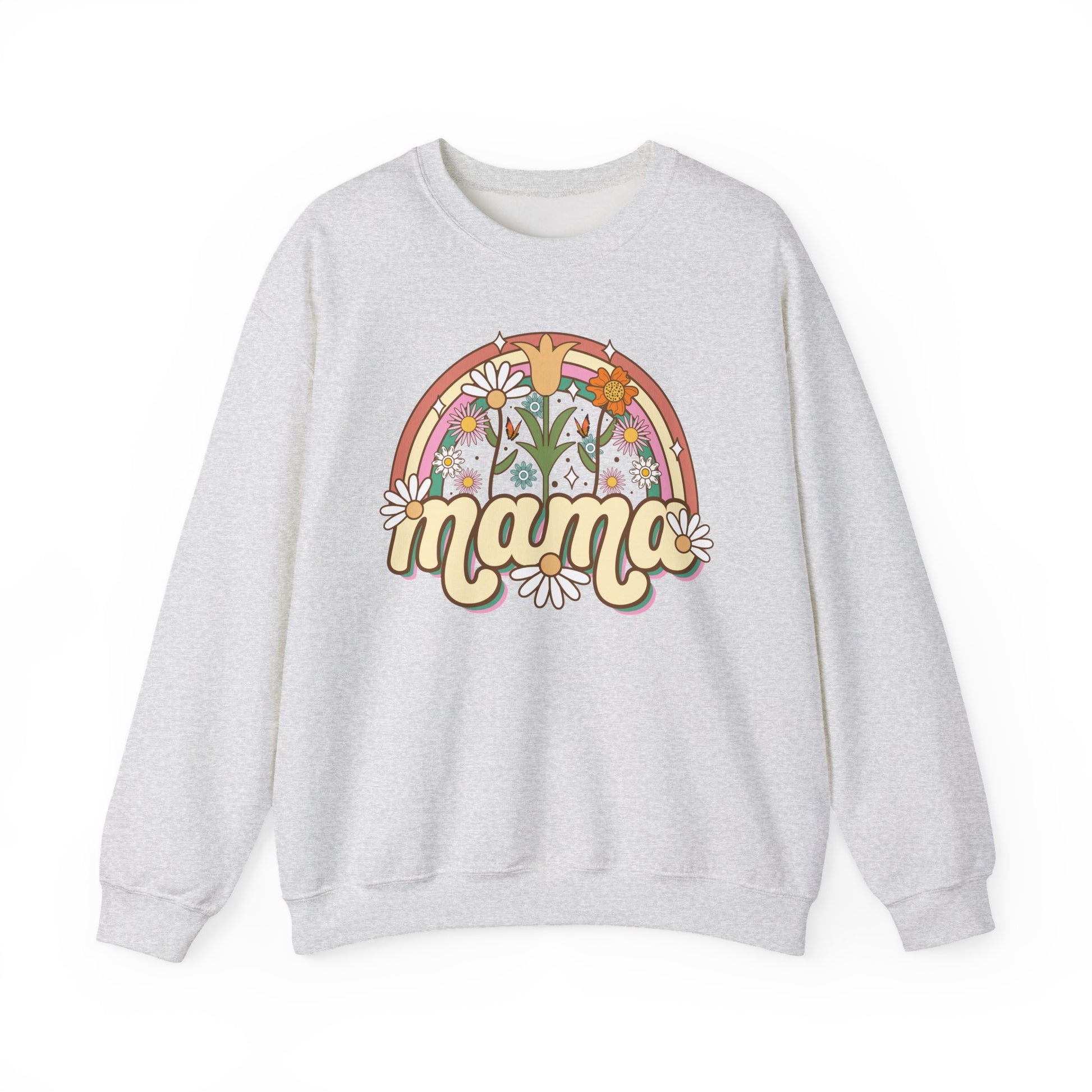 🌼🌈 Retro Floral Mama Sweatshirt – Vintage Rainbow Daisy Mom Crewneck