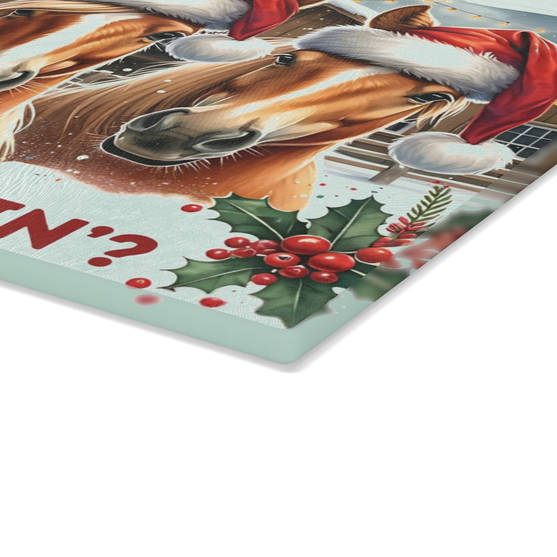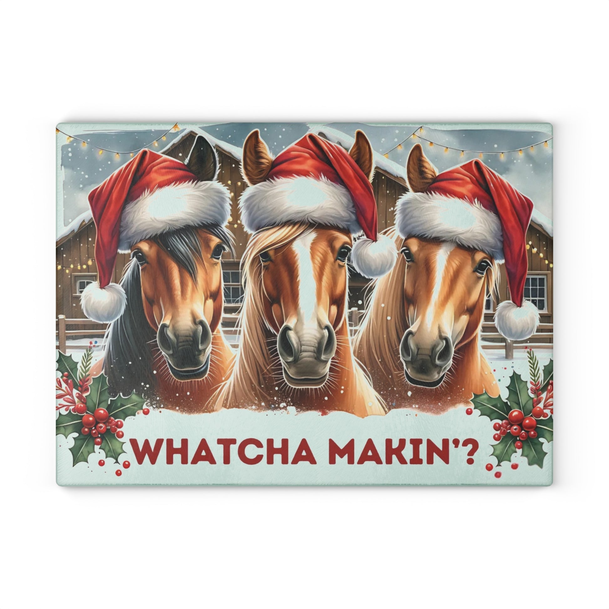 🐴🎄 “Whatcha Makin’?” Holiday Horses Glass Cutting Board – Cozy Charm for Your Kitchen