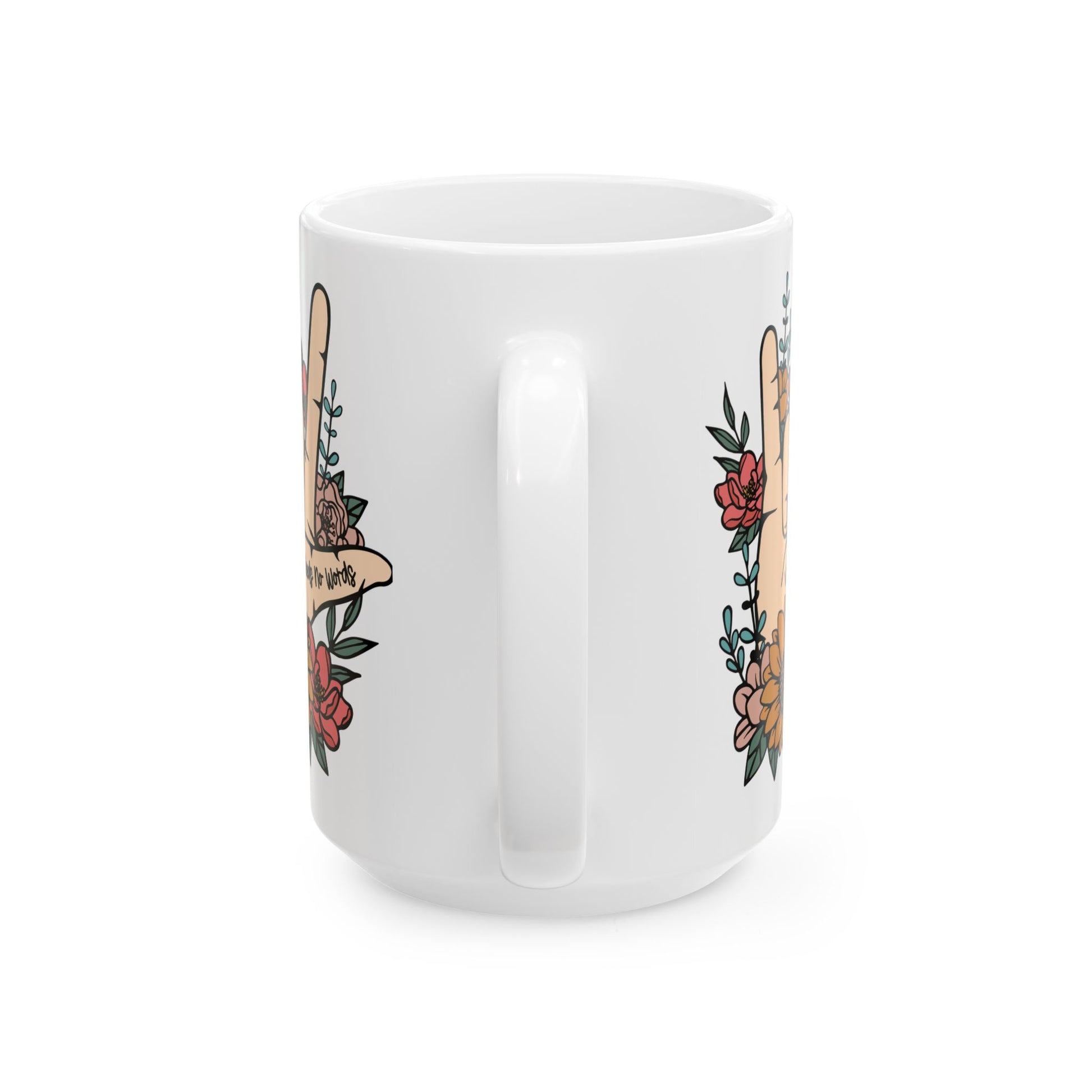 Expresa tu amor de una forma hermosa con esta vibrante taza "Love Needs No Words", que presenta el icónico gesto de señas "Te amo" rodeado de hermosas flores. ¡Un regalo perfecto para quienes aprecian tanto el poder del amor como la belleza de la lengua de señas!