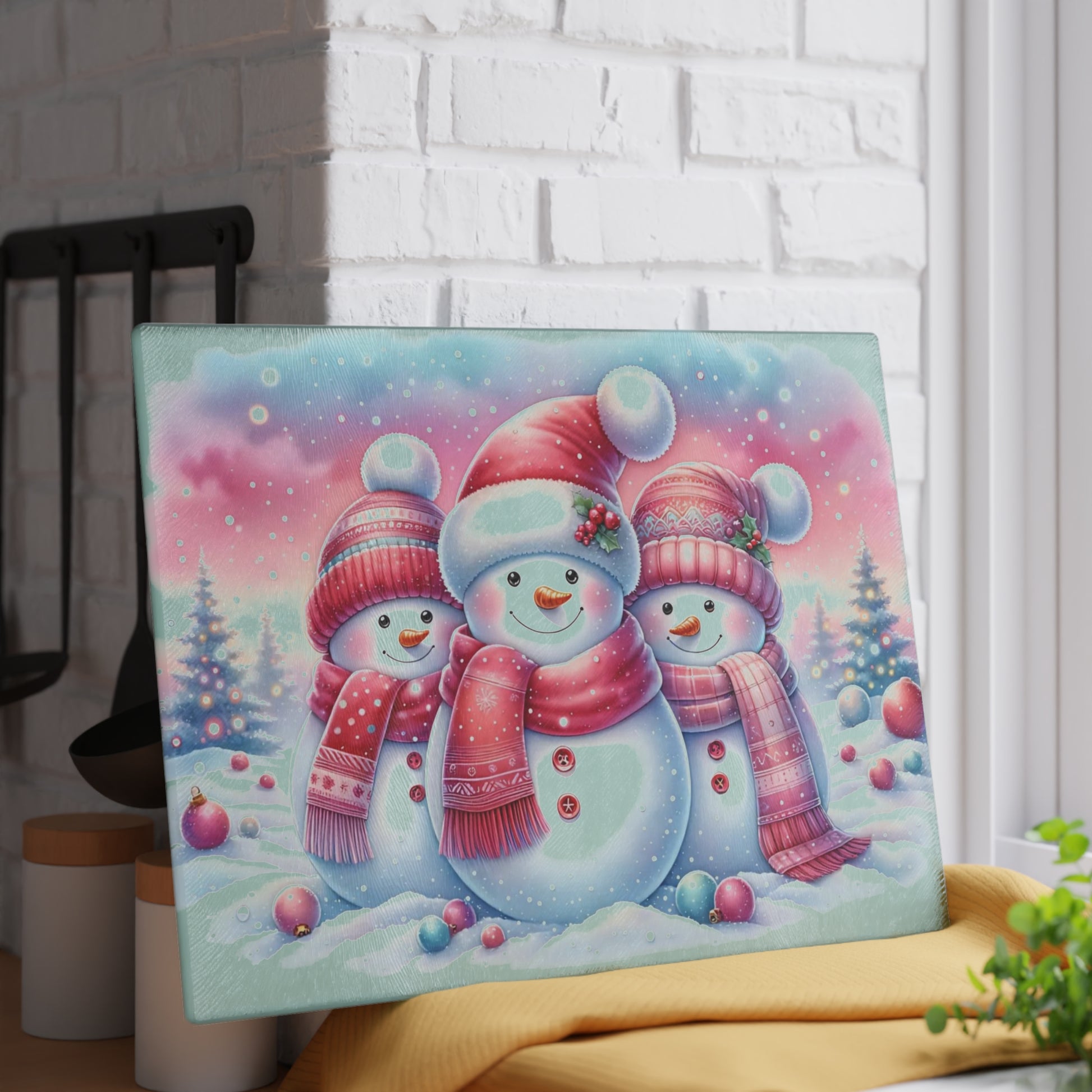 ⛄️🎀 “Pink Scarf Snowman Trio” Glass Cutting Board – Cozy Charm for Your Kitchen