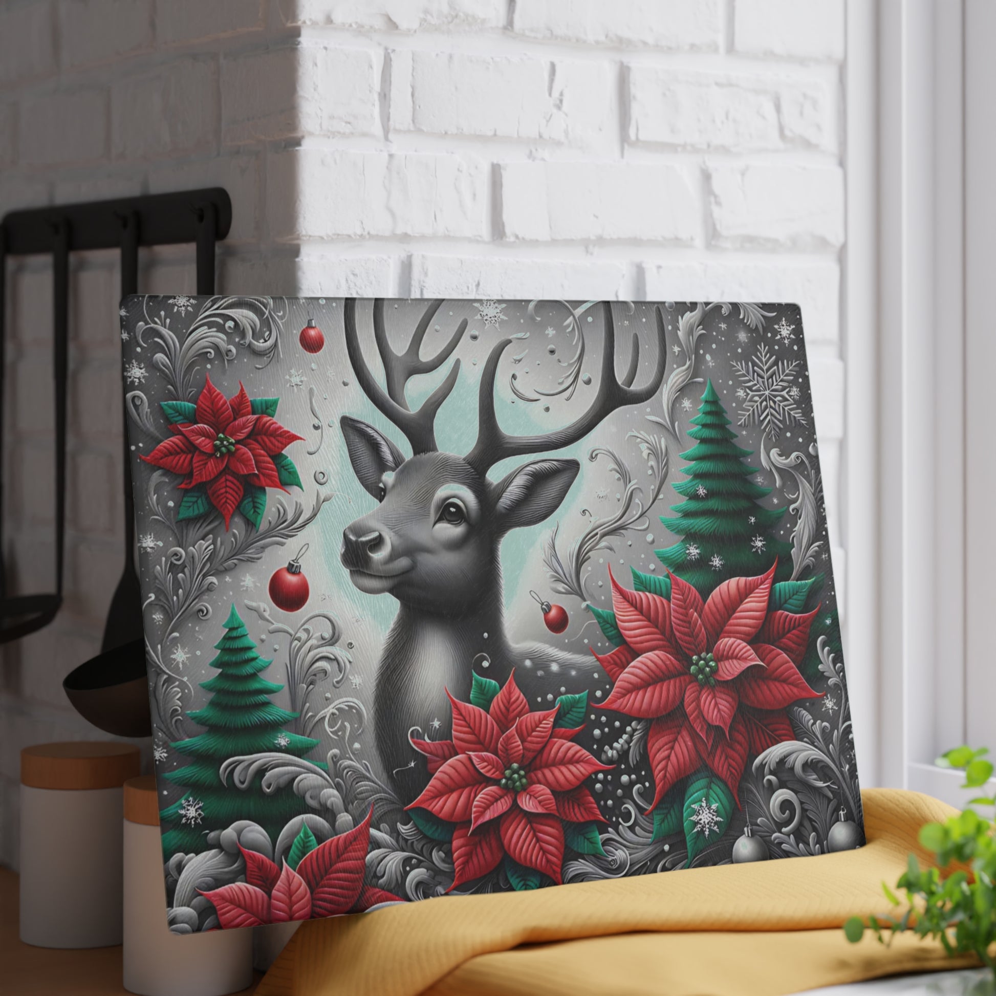 Add cozy lodge magic to your counters with our “Winter Woodland Deer” glass cutting board! A graceful black-and-silver deer stands amidst swirling snowflakes, emerald pines, and rich red poinsettias—perfect for holiday kitchens that love a refined, wintry vibe. Use it for chopping, charcuterie, or as a stunning seasonal display on an easel.
