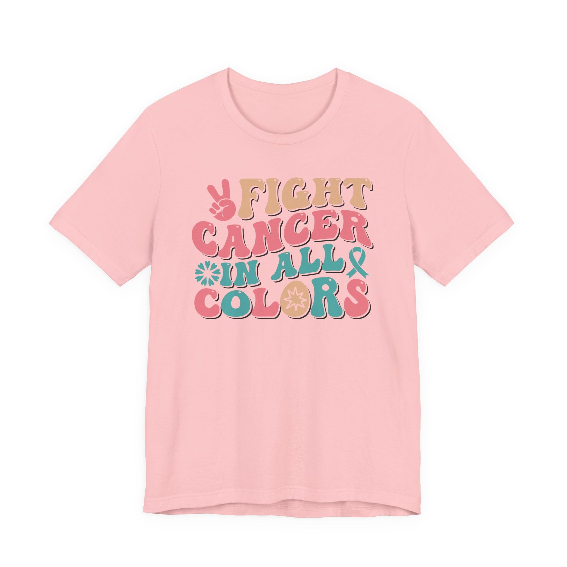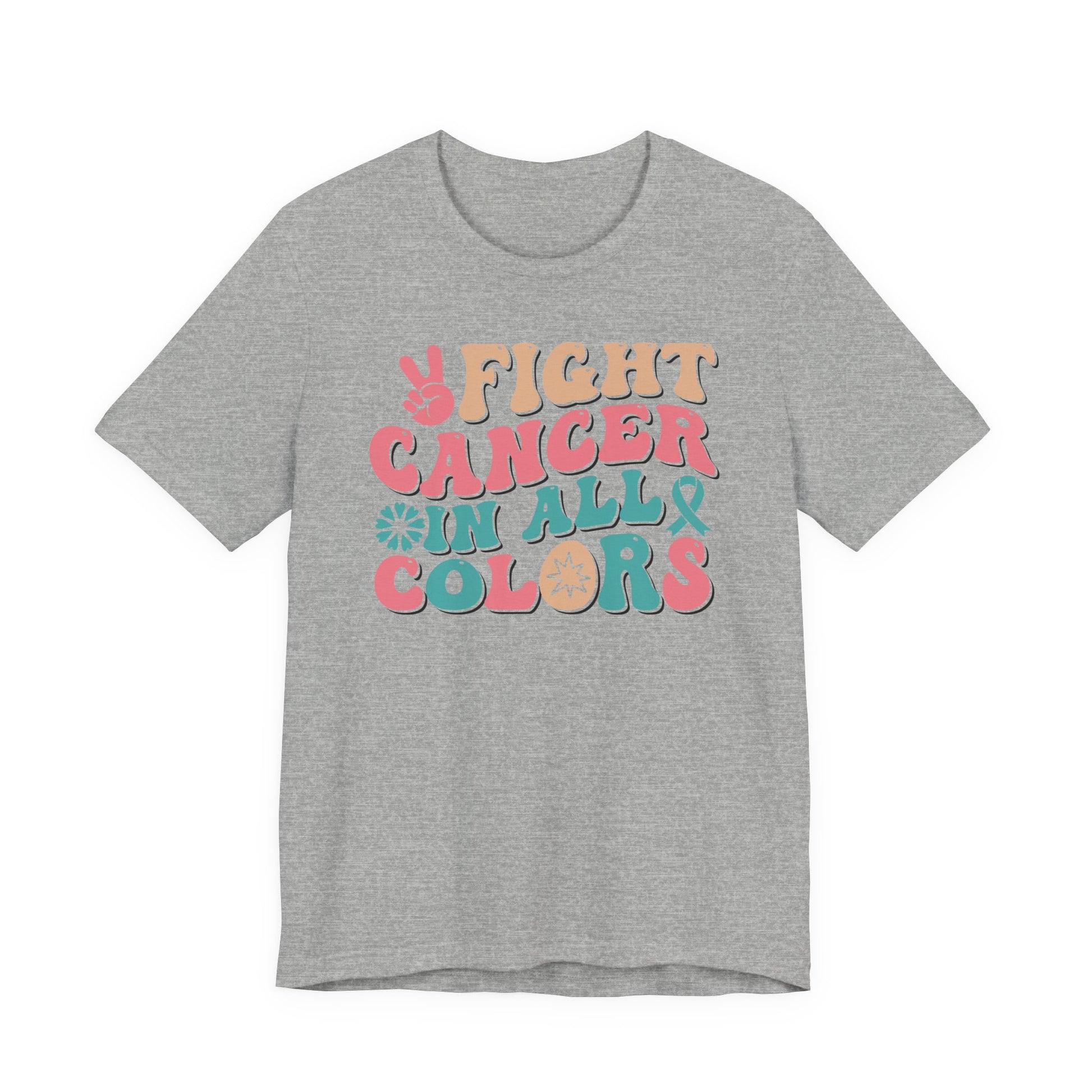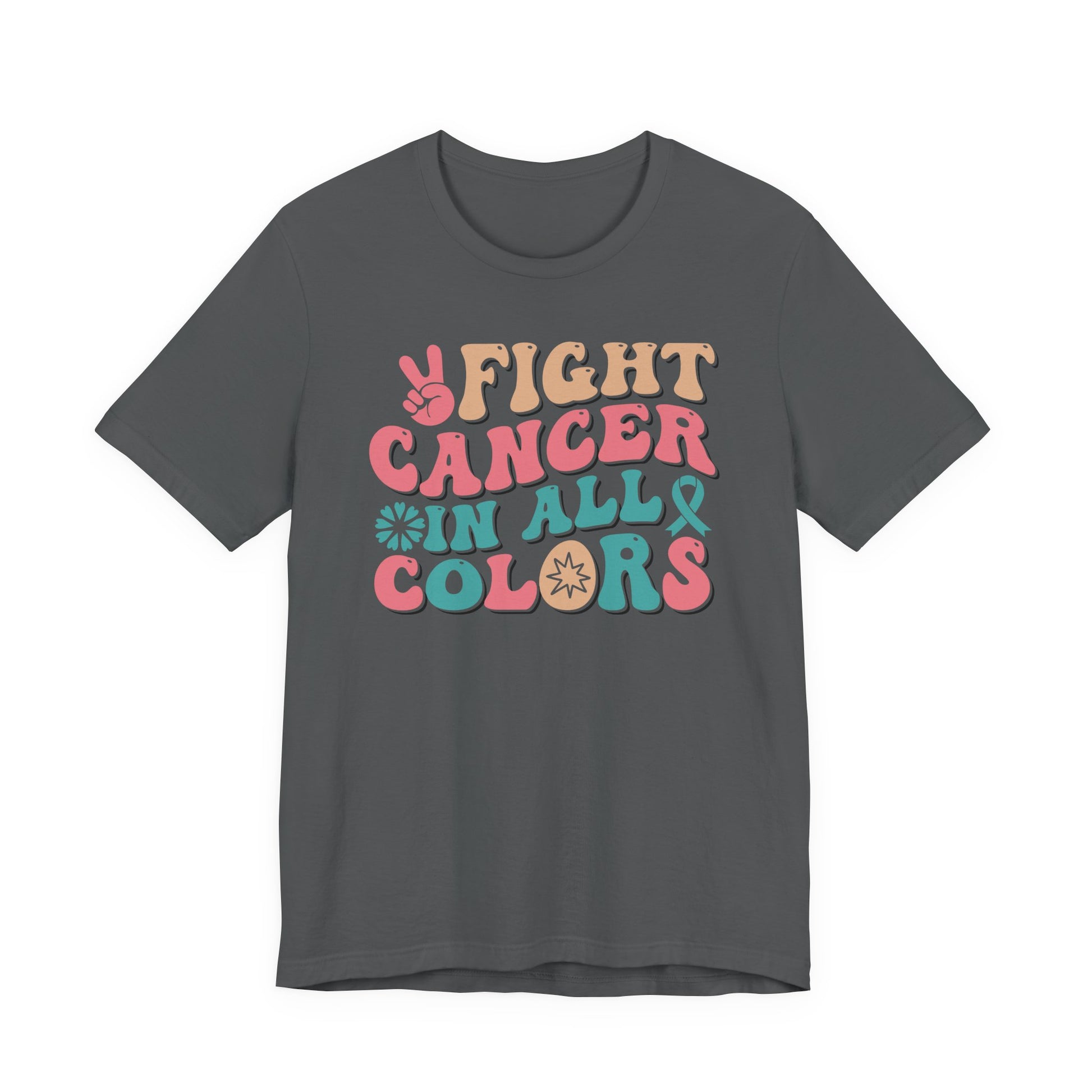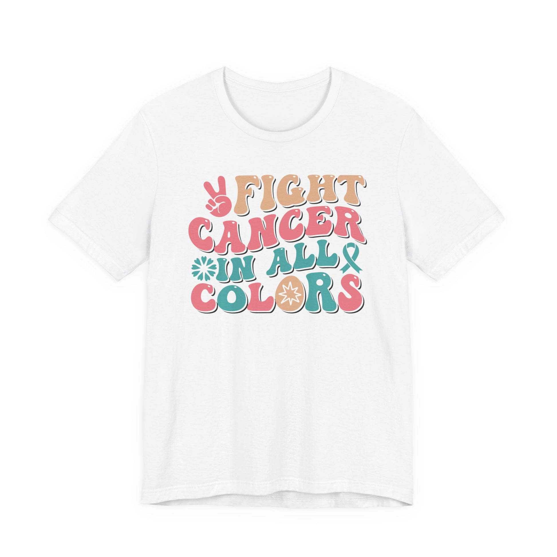 Celebrate strength, unity, and hope with this โFight Cancer in All Colorsโ T-shirt! Featuring bold retro lettering and vibrant hues, this empowering tee honors awareness for all cancers and ribbons. Perfect for survivors, fighters, supporters, and advocates, this shirt is a strong reminder that no matter the color of the ribbon, the fight is shared together.
