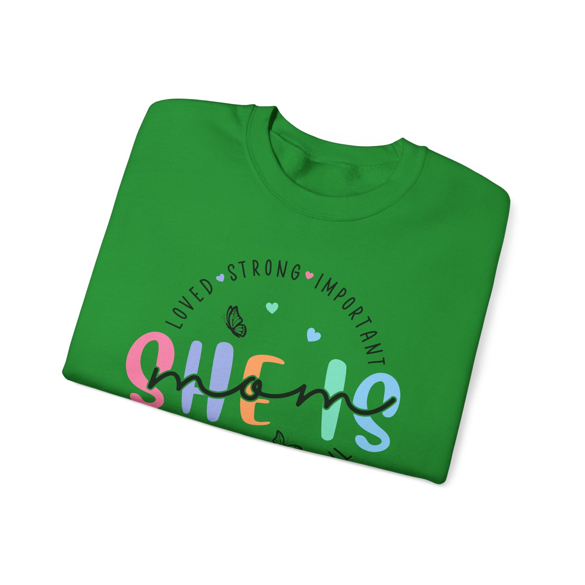 Celebrate strength, beauty, and everything that makes moms amazing with this โ€œShe Is Momโ€ sweatshirt. Featuring pastel lettering, delicate butterflies, and inspiring words like loved, strong, important, worthy, beautiful, this cozy crewneck wraps warmth around the heart. Perfect for everyday wear or as a meaningful gift, itโ€™s a stylish reminder of how powerful and loved moms truly are.