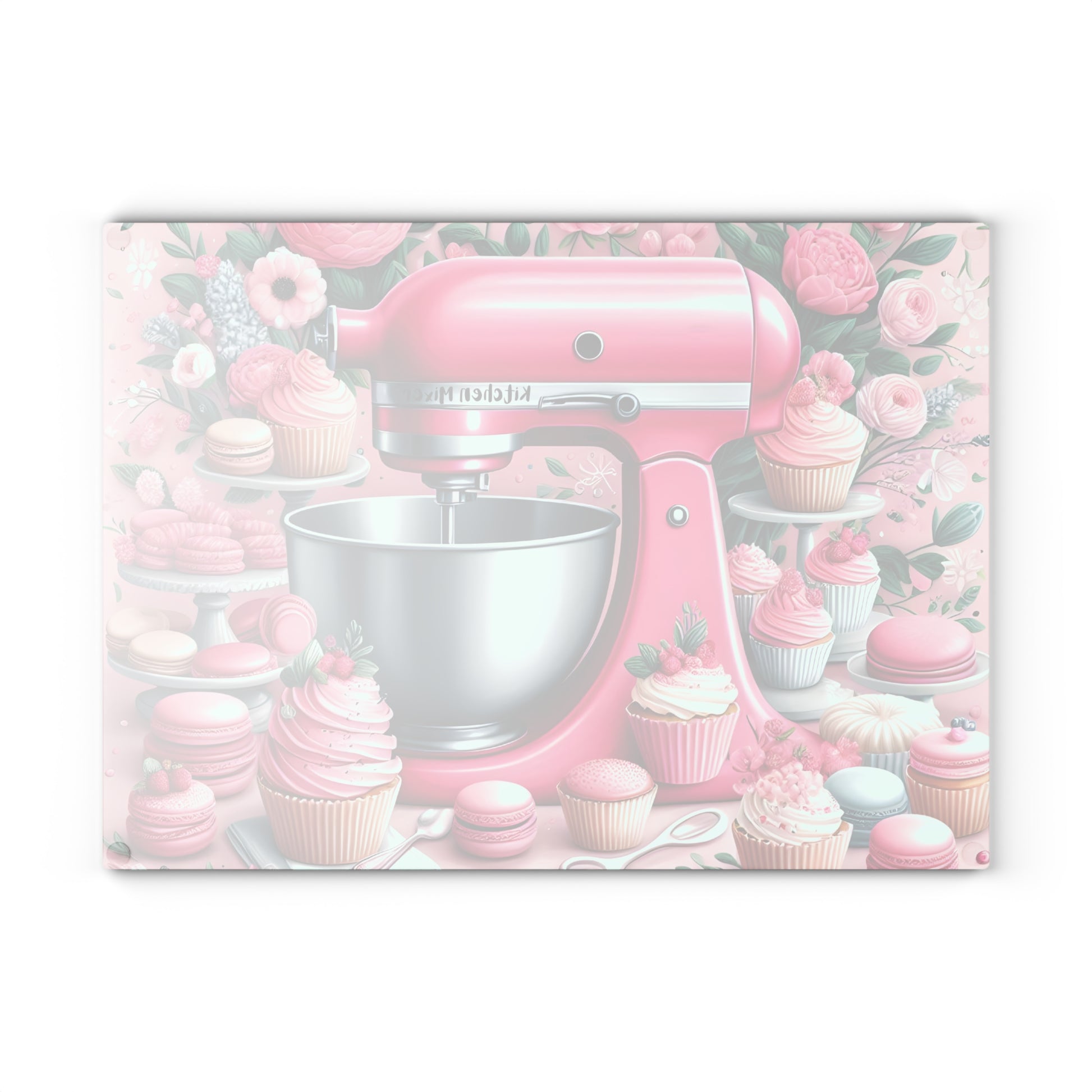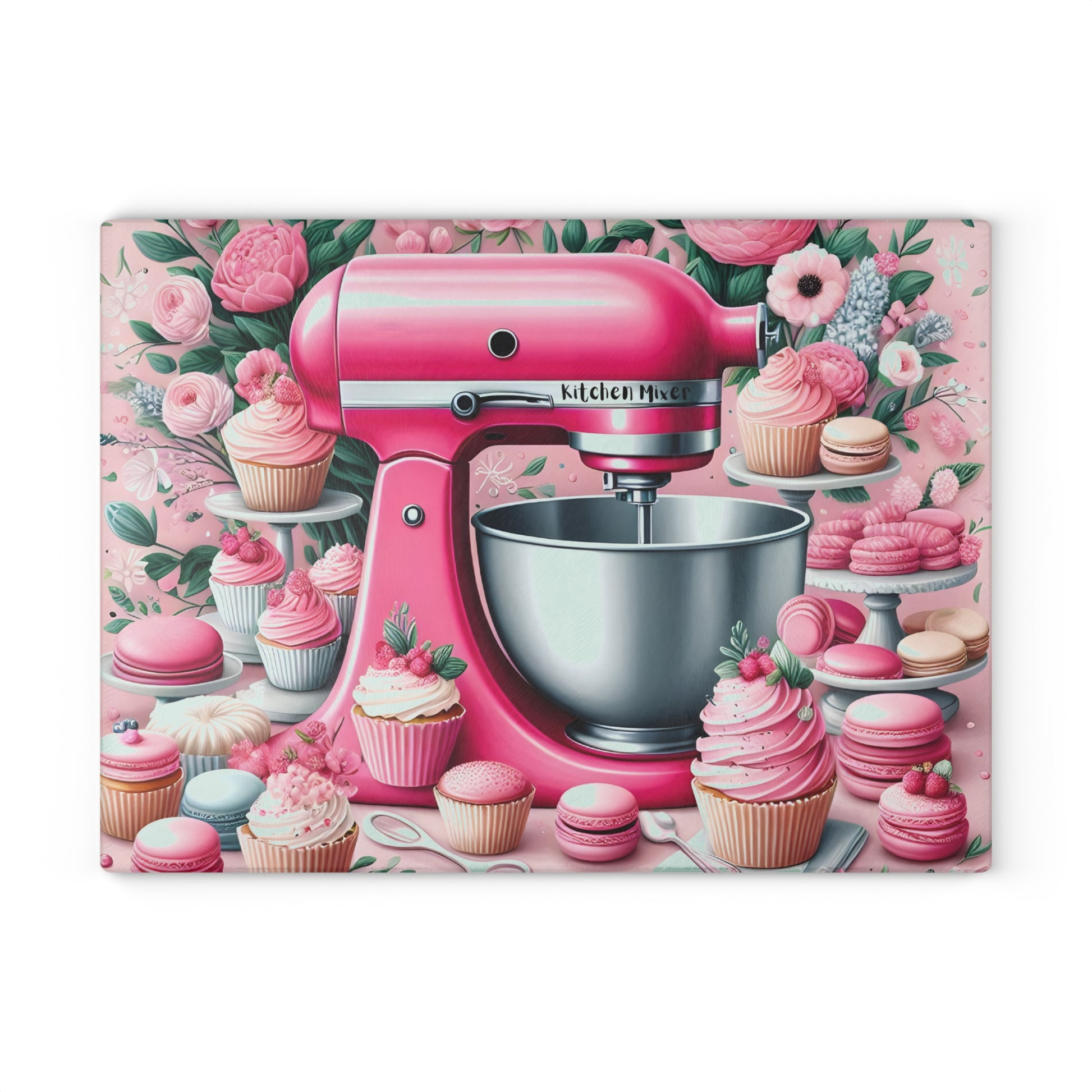 Add a touch of sweetness and style to your kitchen with this Pink Kitchen Mixer Cutting Board! Featuring a vibrant mixer surrounded by cupcakes, macarons, and flowers, this tempered glass board is the ultimate statement piece for bakers and dreamers alike. Whether youโ€™re prepping ingredients, serving treats, or simply displaying it as dรฉcor, this board brings baking joy and elegance to every corner of your home.
