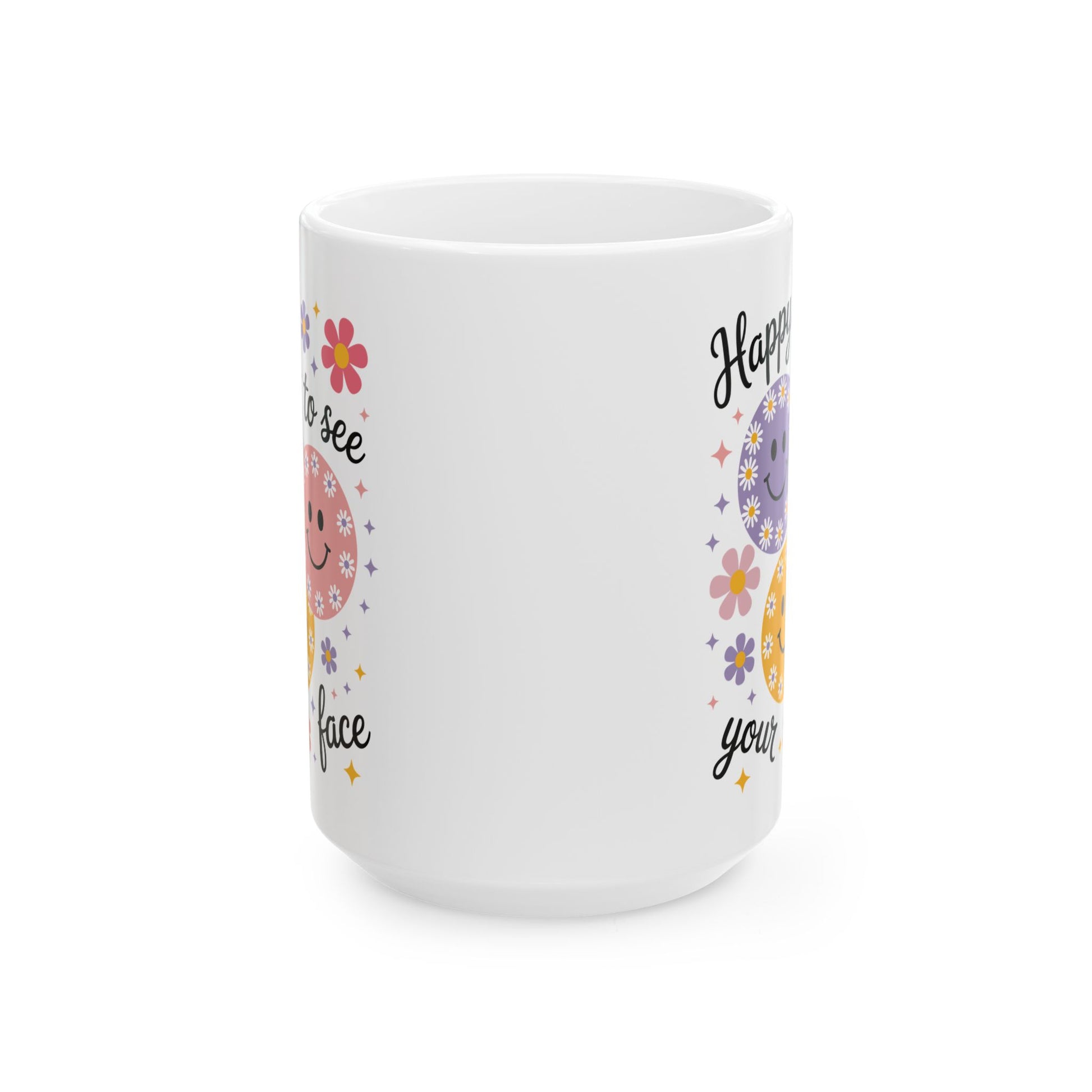 Brighten up every sip with a dose of positivity! This cheerful mug features colorful retro smiley faces decorated with daisies, surrounded by playful flowers and stars, along with the uplifting phrase โ€œHappy to See Your Face.โ€ Itโ€™s the perfect reminder to start your mornings with a smile and share happiness with others. Whether youโ€™re enjoying your coffee, tea, or hot cocoa, this mug adds charm, warmth, and good vibes to your day.