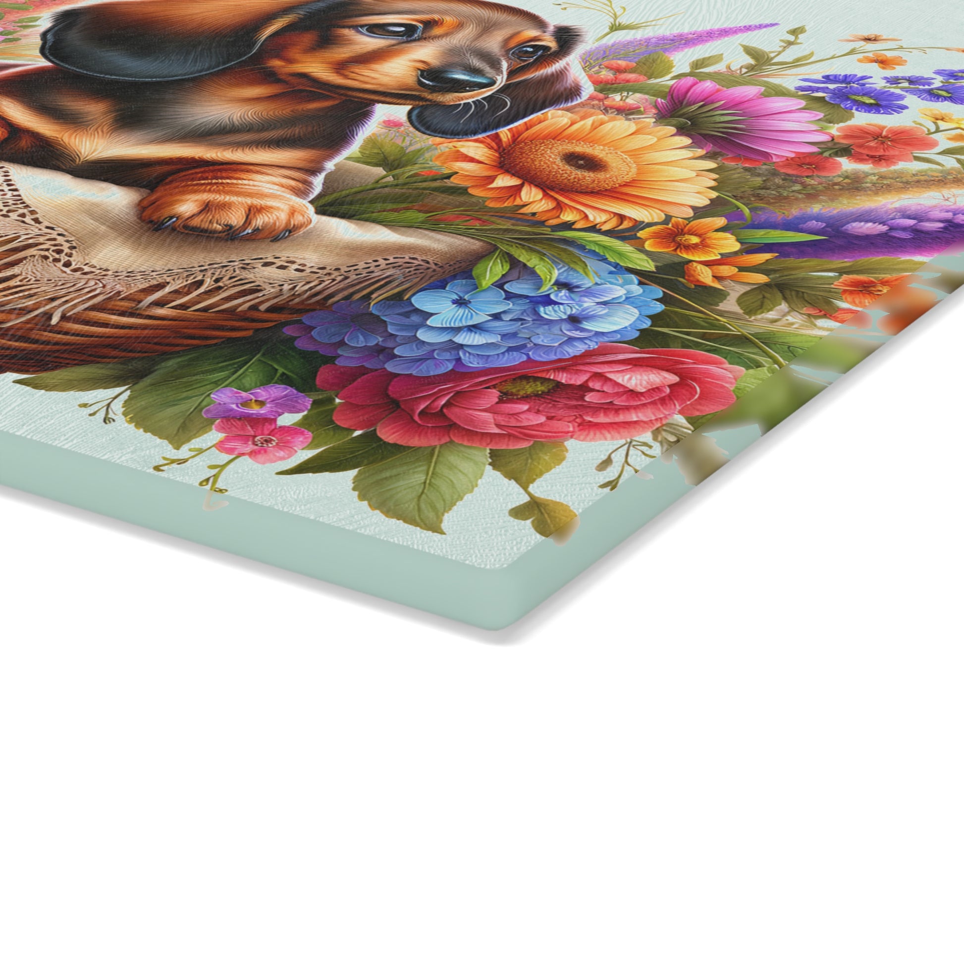 Add a playful yet elegant touch to your kitchen with this vibrant design featuring an adorable dachshund nestled in a blooming basket of colorful flowers. Perfect for dachshund lovers or anyone who enjoys bright, cheerful décor, this board brings personality and style to every meal prep or serving experience.