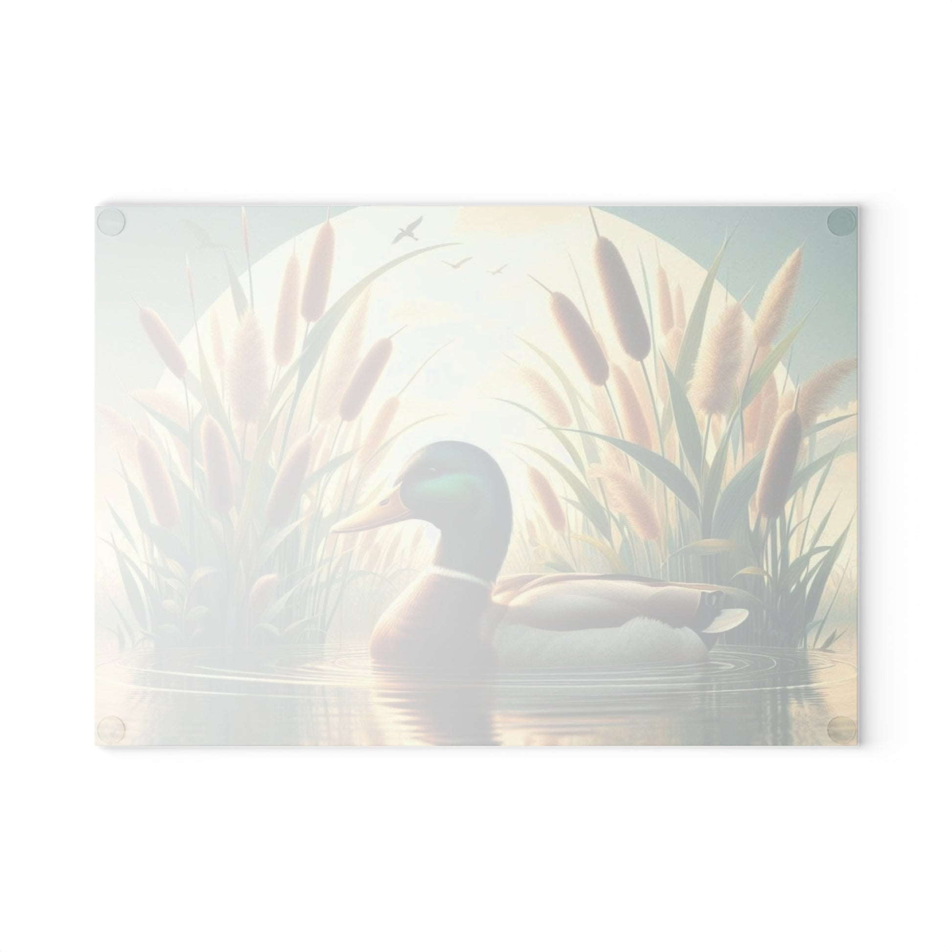 Bring calm, country charm into your kitchen with this tranquil glass cutting board featuring a beautifully detailed mallard floating among tall cattails and soft lake reflections. Warm golden sunlight filters through the reeds as distant birds glide across the sky, creating a peaceful nature scene perfect for rustic, lodge-style, farmhouse, or lake house décor. Whether used for meal prep or displayed on the counter, this board adds a serene touch to any space.