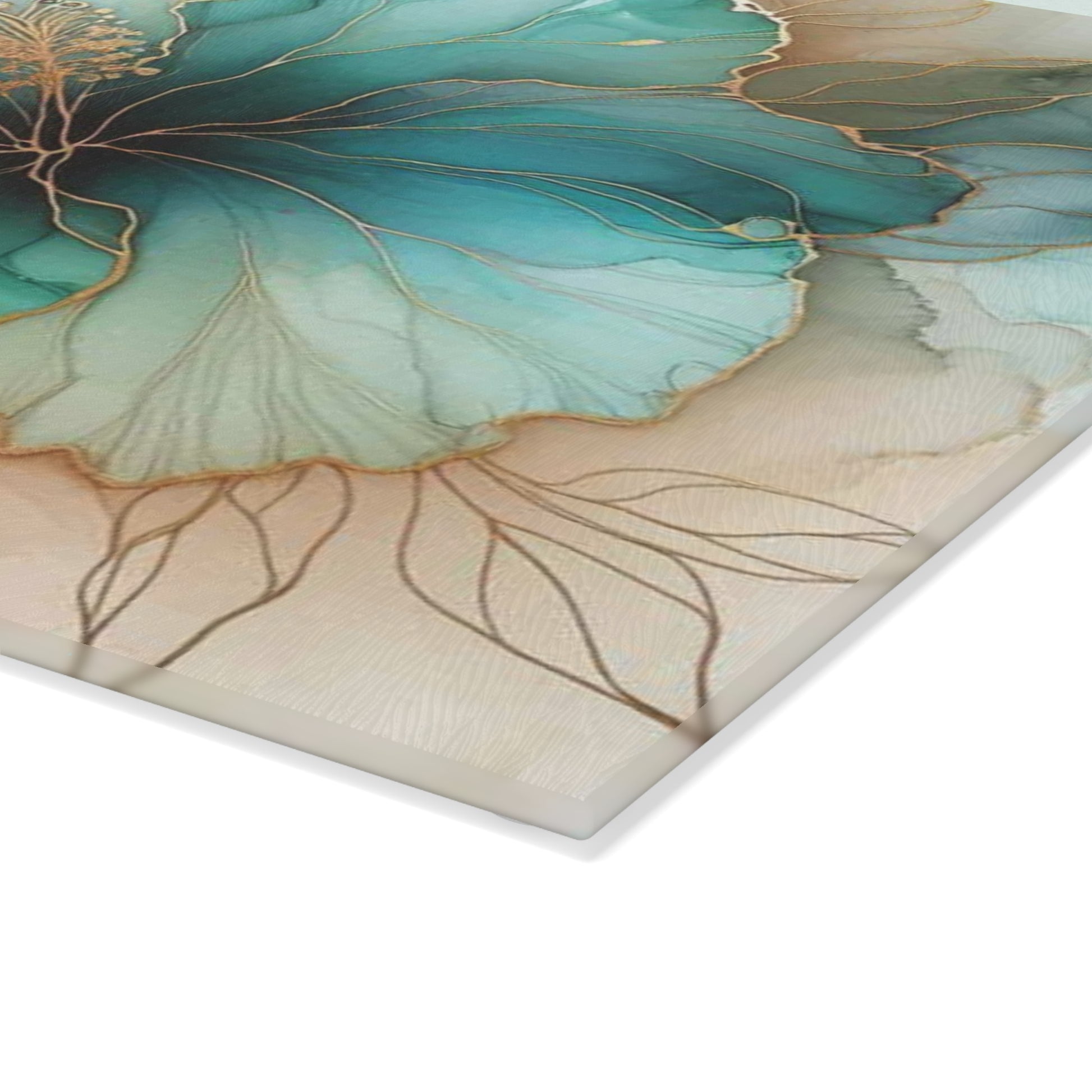 Bring elegant calm into your kitchen with this Teal Bloom Harmony Cutting Board. The soft watercolor-style floral design blends layered shades of teal, jade, cream, and warm beige, enhanced with subtle gold-line veining for a refined, modern look. Whether used for prepping meals or displayed as décor, this board adds natural beauty and sophistication to any kitchen space.
