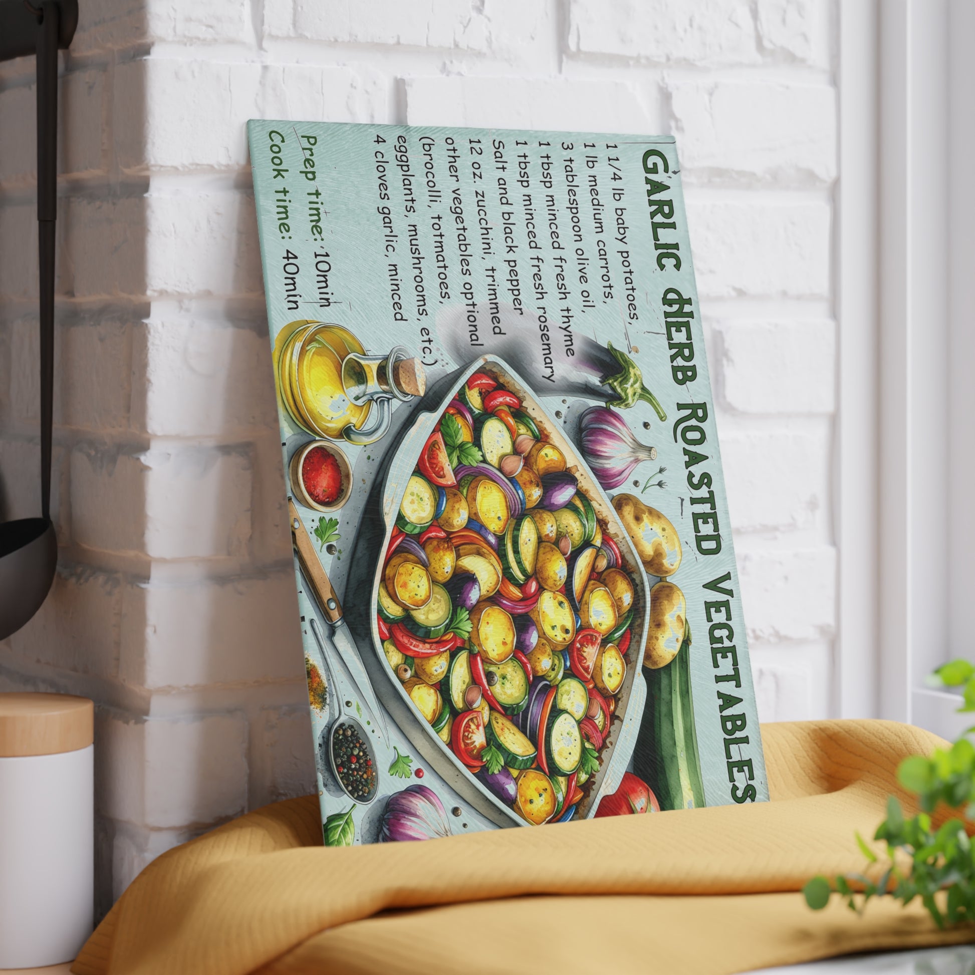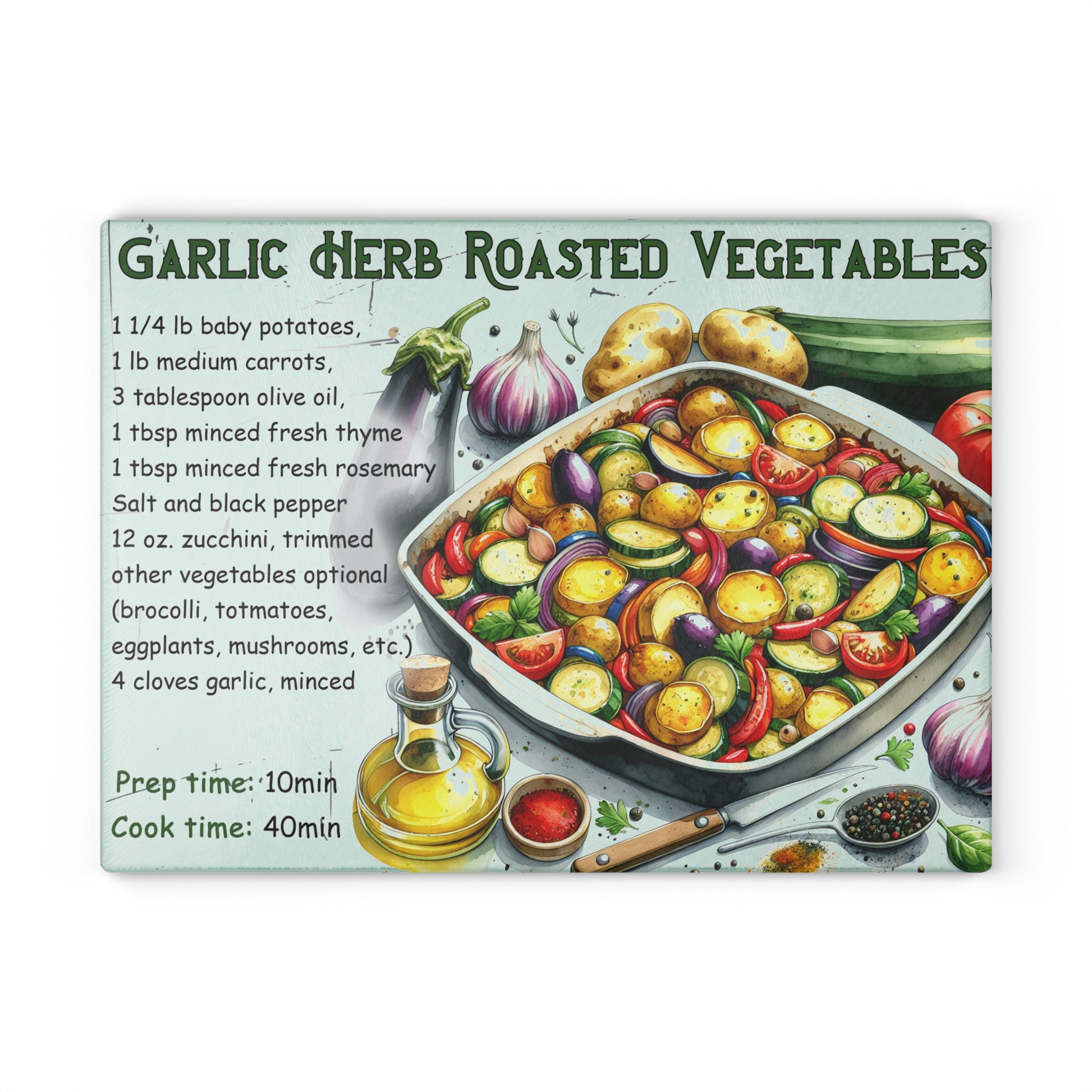 Bring vibrant flavors to your kitchen with this Garlic Herb Roasted Vegetables tempered glass cutting board. Featuring a colorful and detailed recipe design with fresh zucchini, carrots, potatoes, garlic, and herbs, this board is perfect for food lovers and home chefs. Functional and stylish, it doubles as a prep surface and a beautiful recipe display, making it an instant favorite in any kitchen.