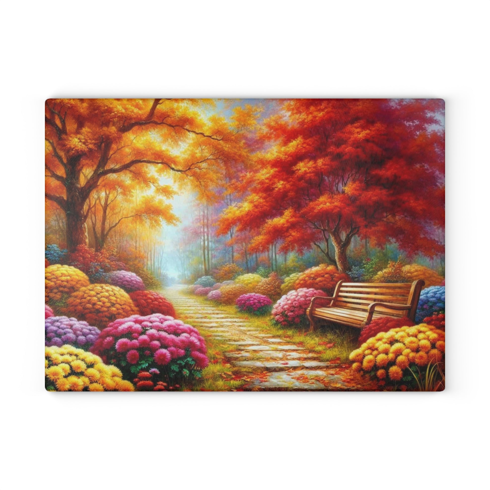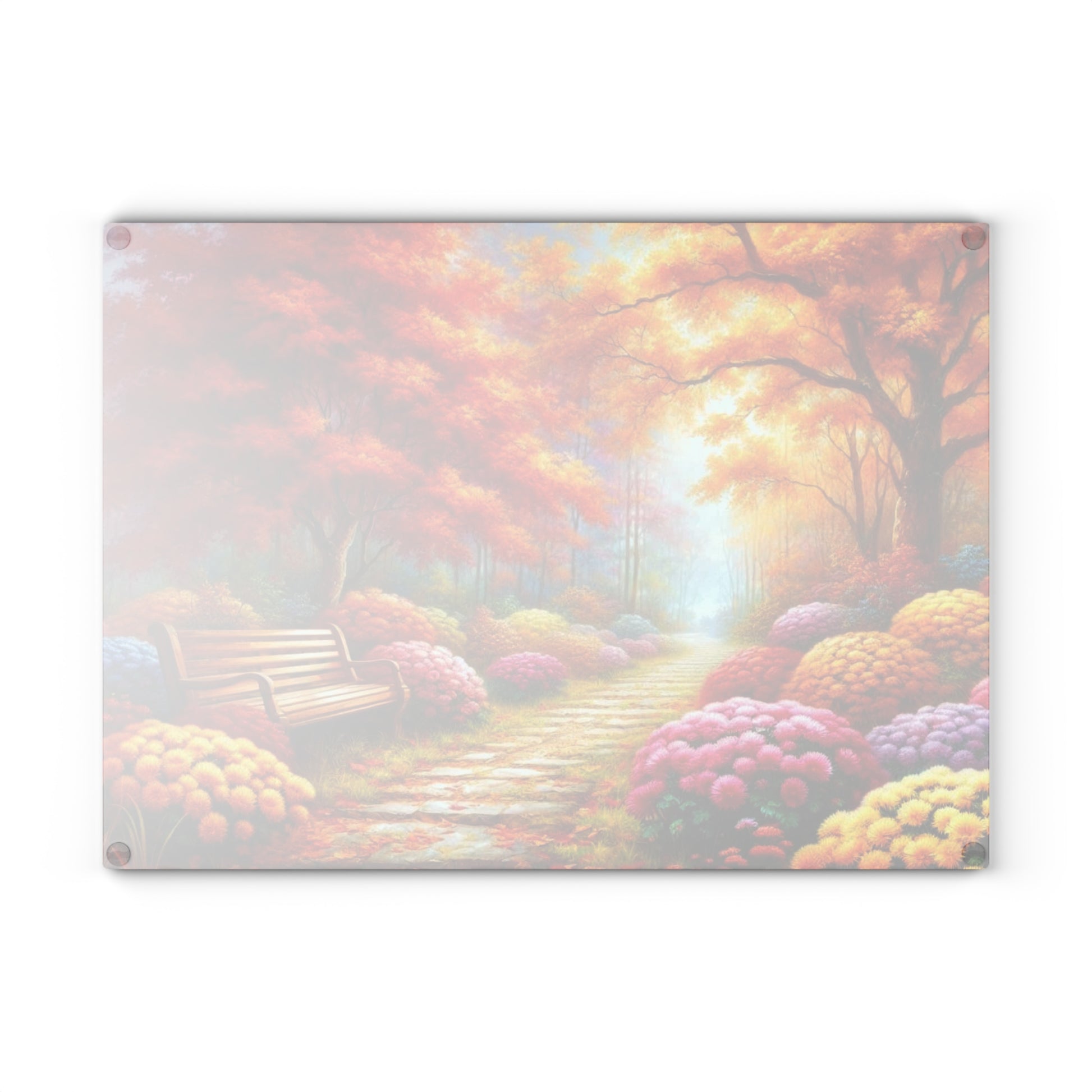🍁 Autumn Path & Park Bench – Cozy Fall Tempered Glass Cutting Board