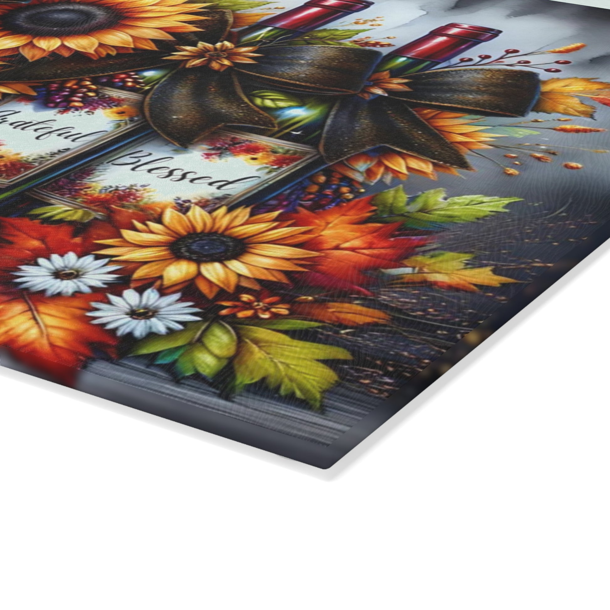 Celebrate cozy autumn vibes with this “Thankful • Grateful • Blessed” glass cutting board. A trio of festive wine bottles wrapped in big satin bows nestles among glowing sunflowers, berries, colorful leaves, and a harvest pumpkin—instant warmth for your fall kitchen display and holiday gatherings.