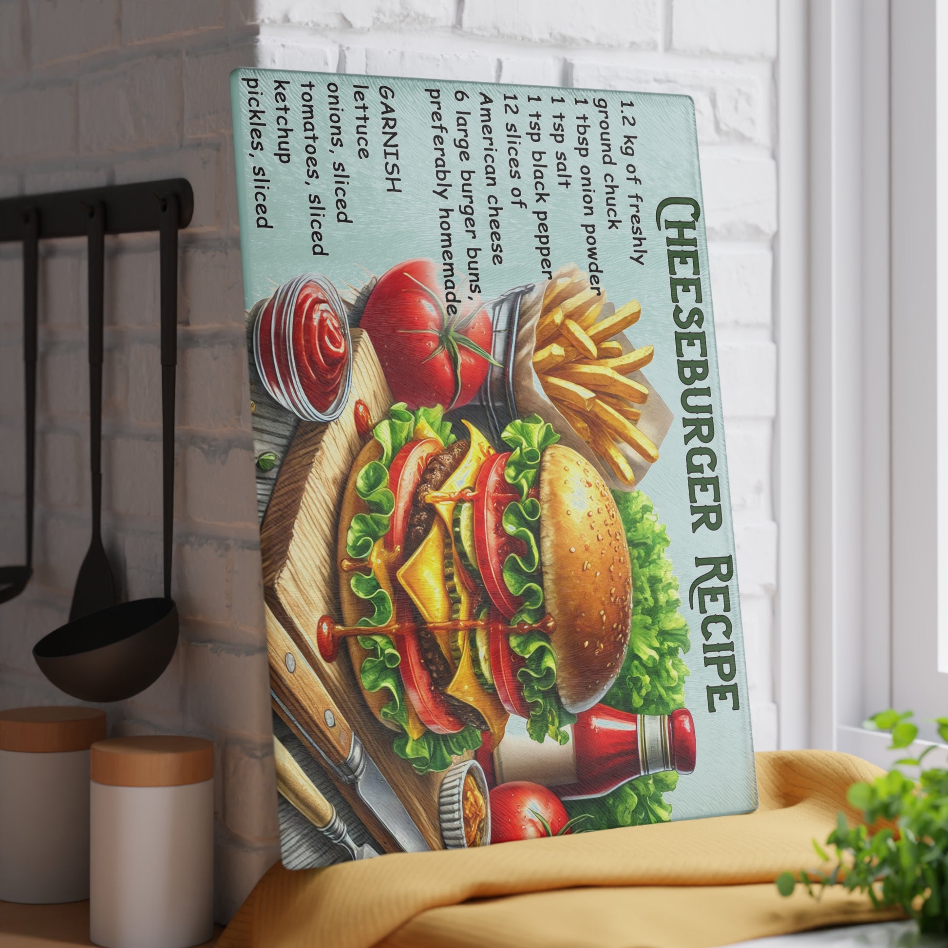 Bring bold flavor and fun to your kitchen with this eye-catching tempered glass cutting board featuring a vibrant cheeseburger recipe design! Perfect for burger nights, family barbecues, or adding a pop of personality to your countertop décor, this board is as practical as it is stylish. Whether you’re prepping ingredients for your next cookout or simply displaying it as a kitchen accent, this cheeseburger recipe cutting board is a true conversation starter.