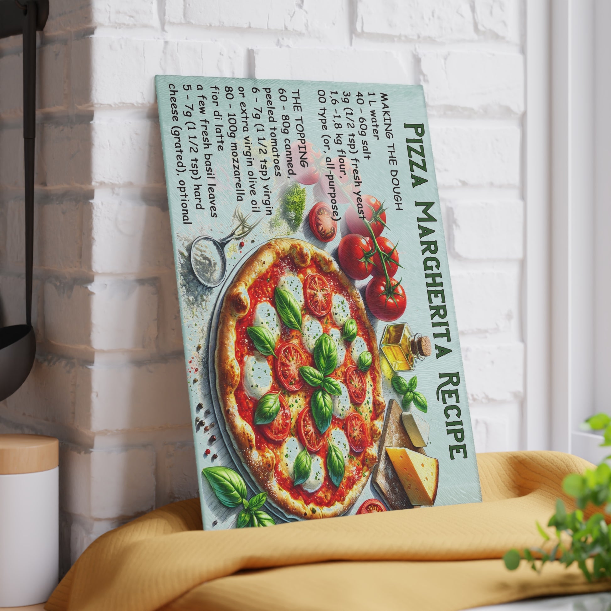 Bring the flavors of Italy to your kitchen with this vibrant tempered glass cutting board featuring a stunning Pizza Margherita recipe design. Perfect for pizza night, family gatherings, or simply adding a delicious splash of color to your countertop dรฉcor, this cutting board blends functionality with a stylish, authentic Italian aesthetic.