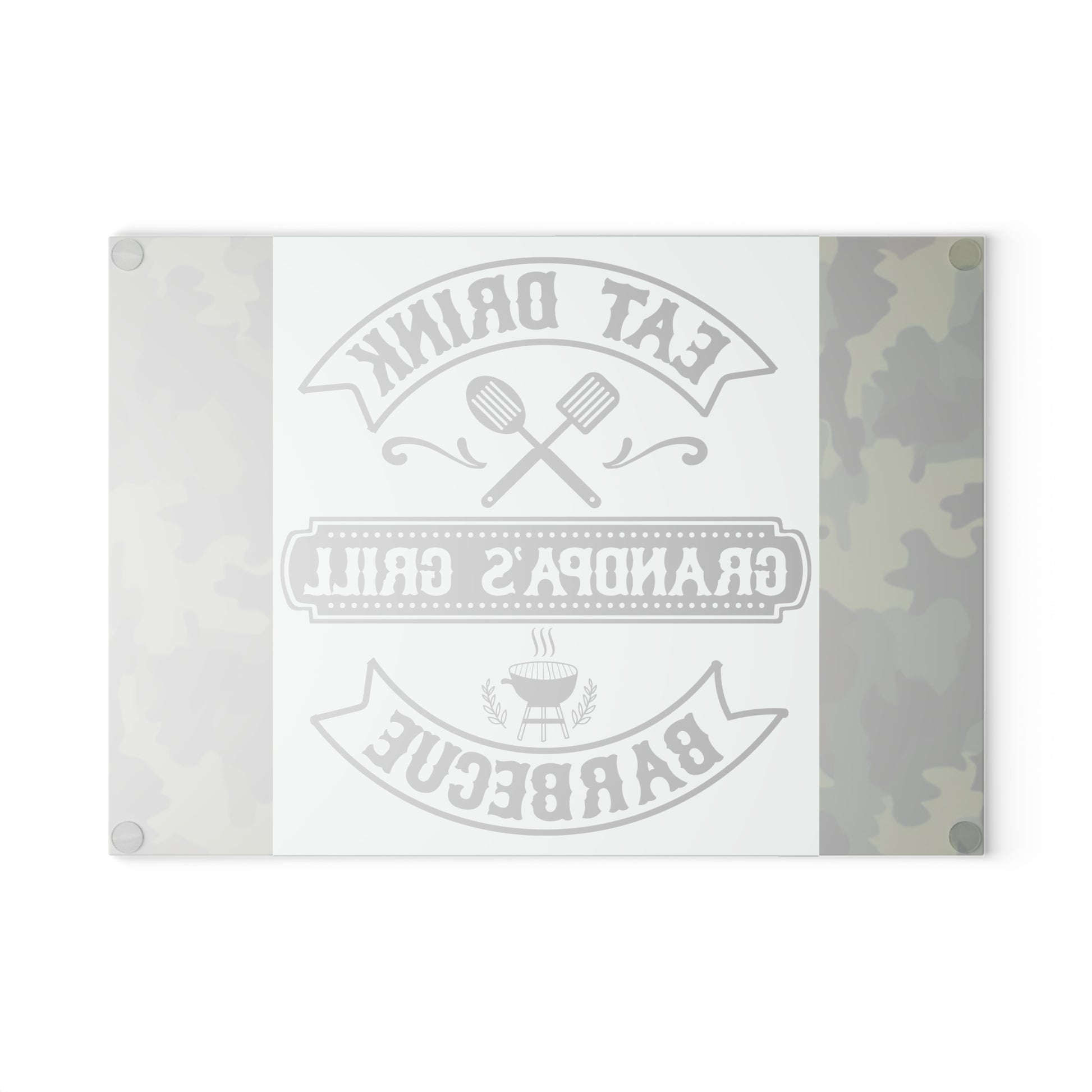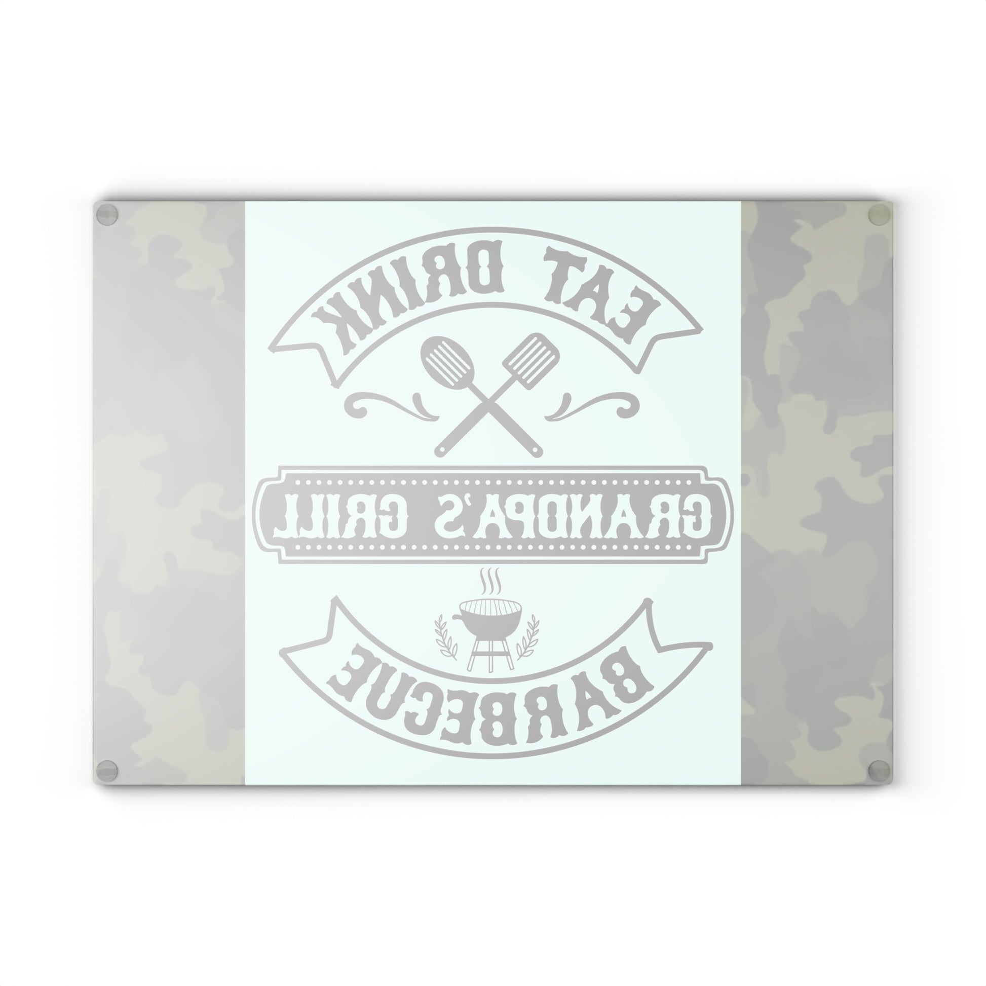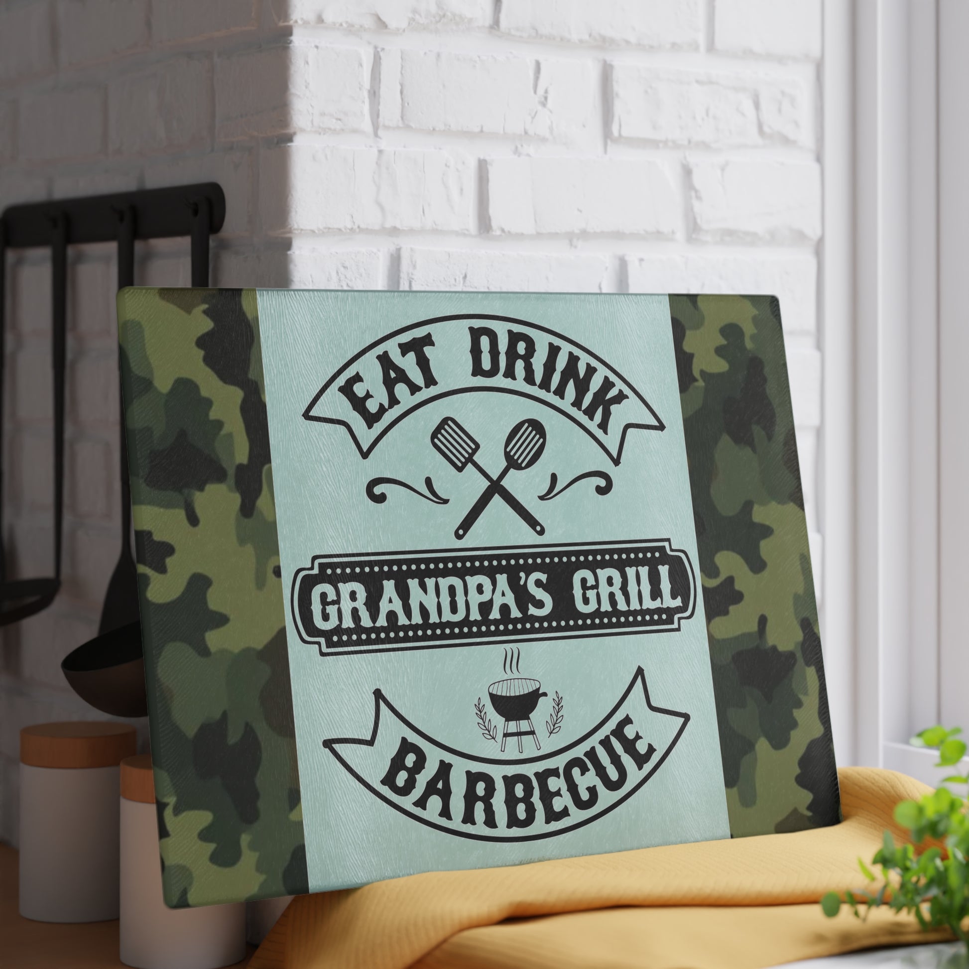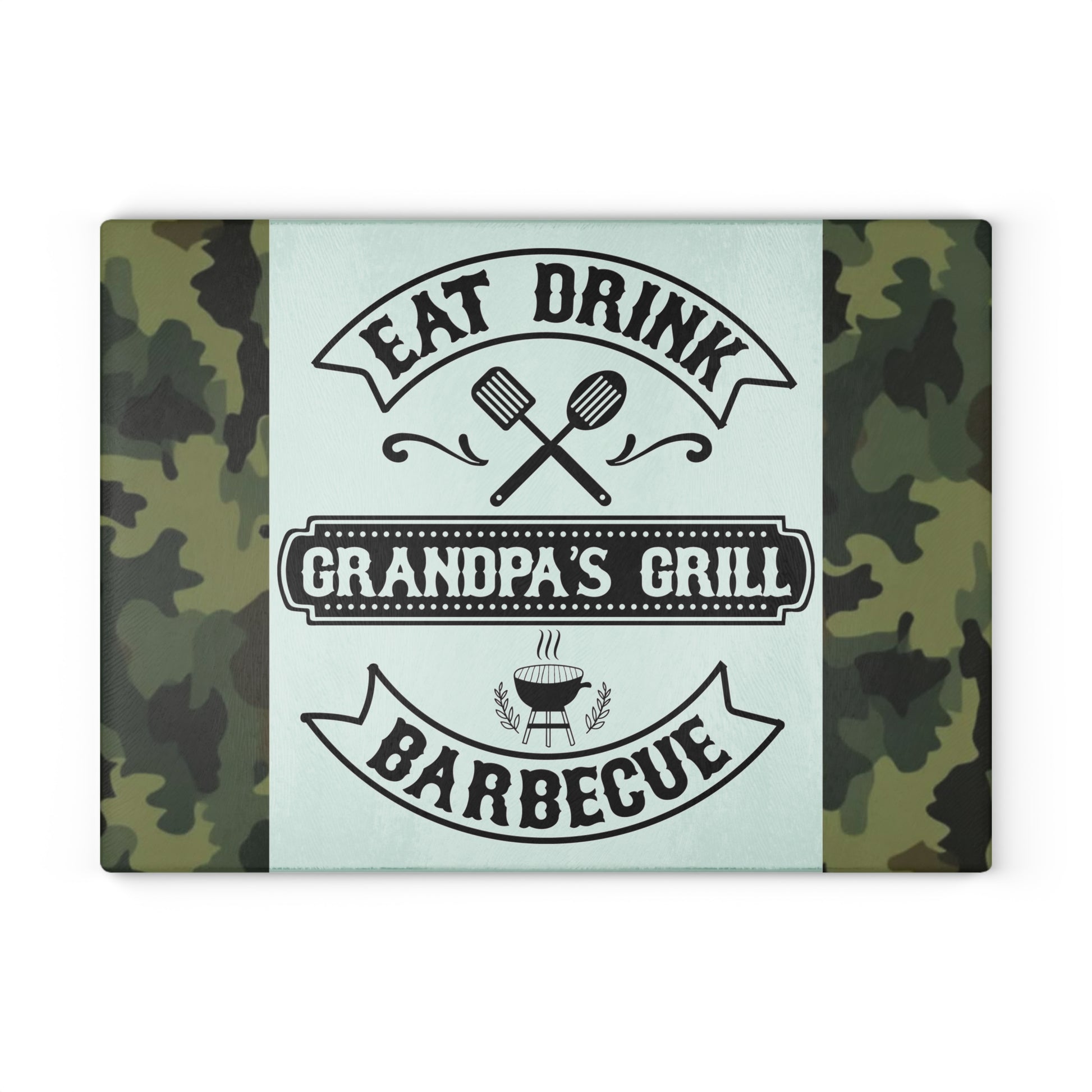 🍖🔥 EAT DRINK GRANDPA’S GRILL BARBEQUE – Camo Glass Cutting Board for Backyard Kings 🧢🍔