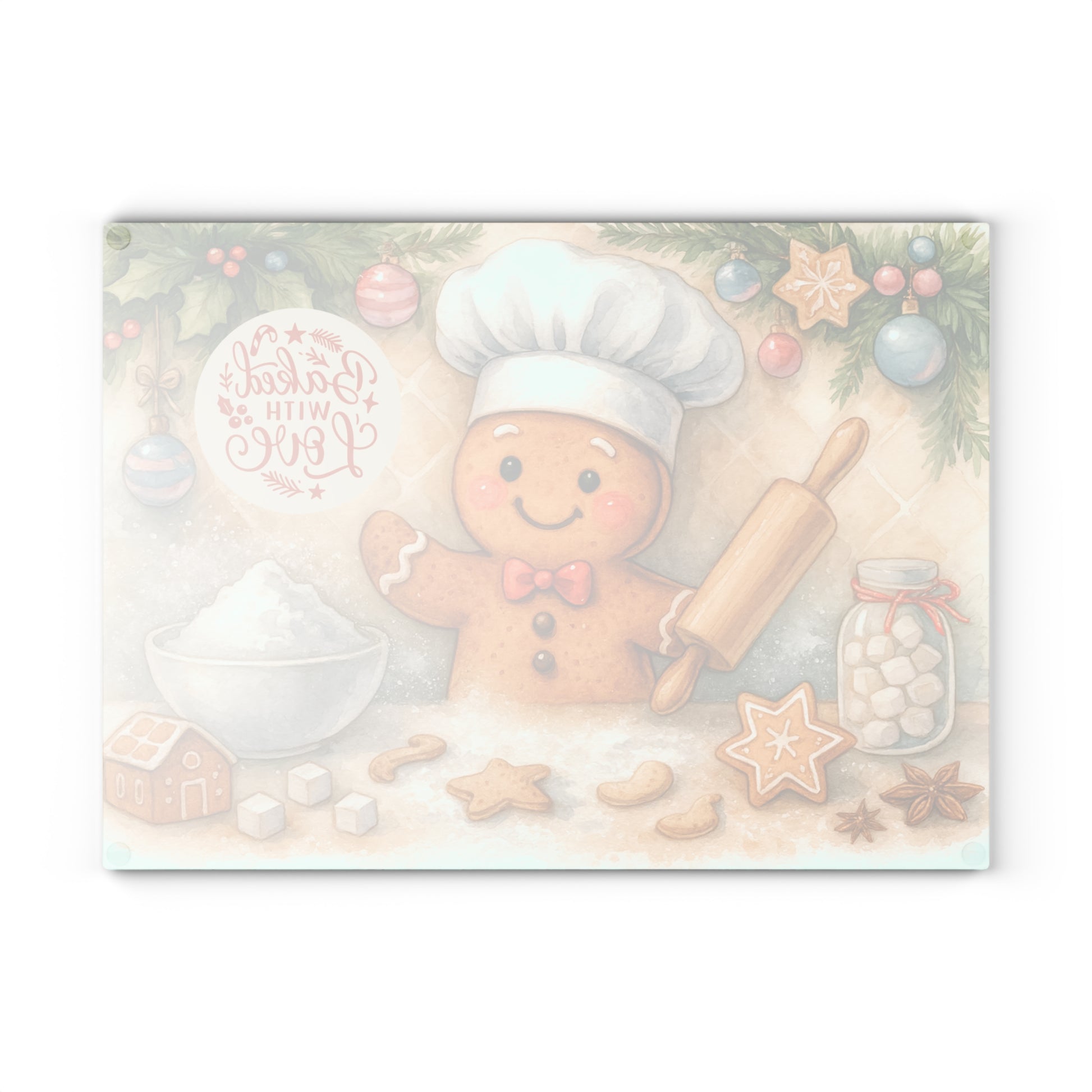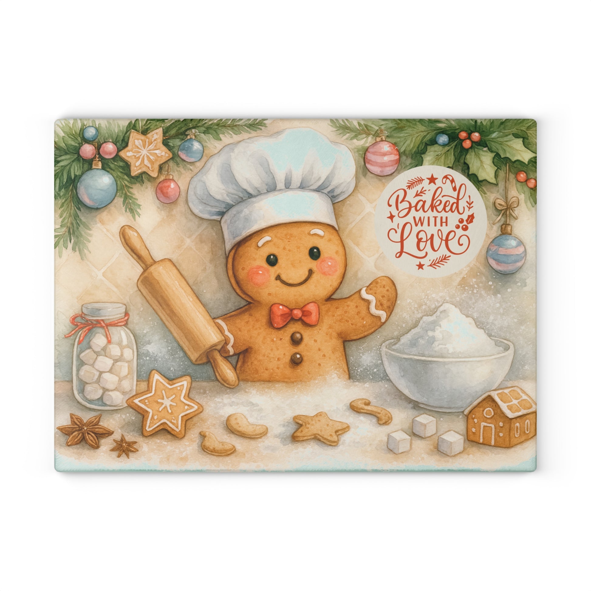 Bring the joy of holiday baking into your kitchen with this Gingerbread Chef Tempered Glass Cutting Board. Featuring a cheerful gingerbread cookie dressed as a baker with a rolling pin, surrounded by cookies, sugar, and festive decorations, this design is as sweet as the treats youโ€™ll be preparing. The phrase โ€œBaked with Loveโ€ adds the perfect heartwarming touch, making it ideal for seasonal celebrations, family baking days, or gifting to a loved one.