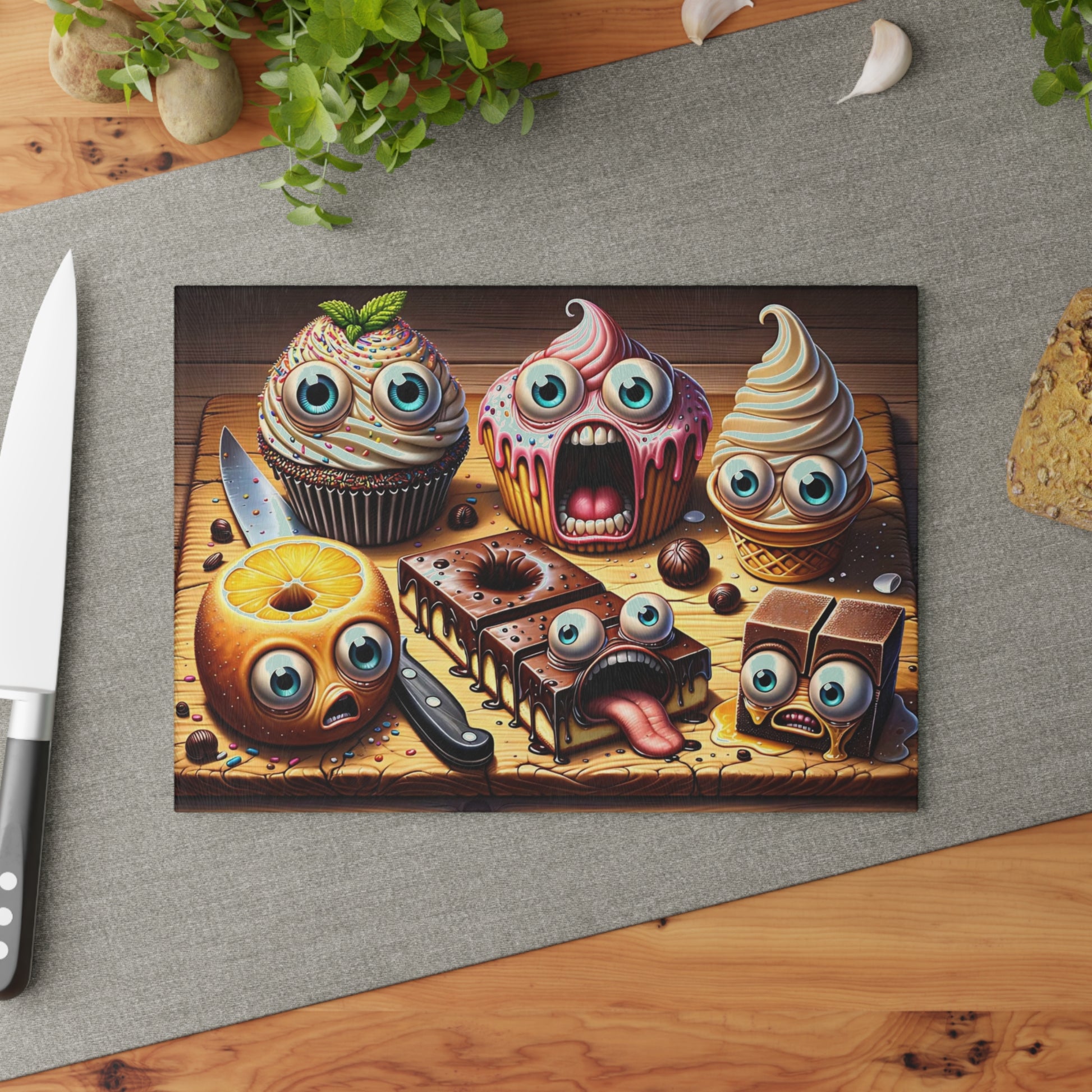 🍰🤣 “Sweet Squad Shenanigans” Glass Cutting Board – Fun Dessert Vibes for Your Kitchen