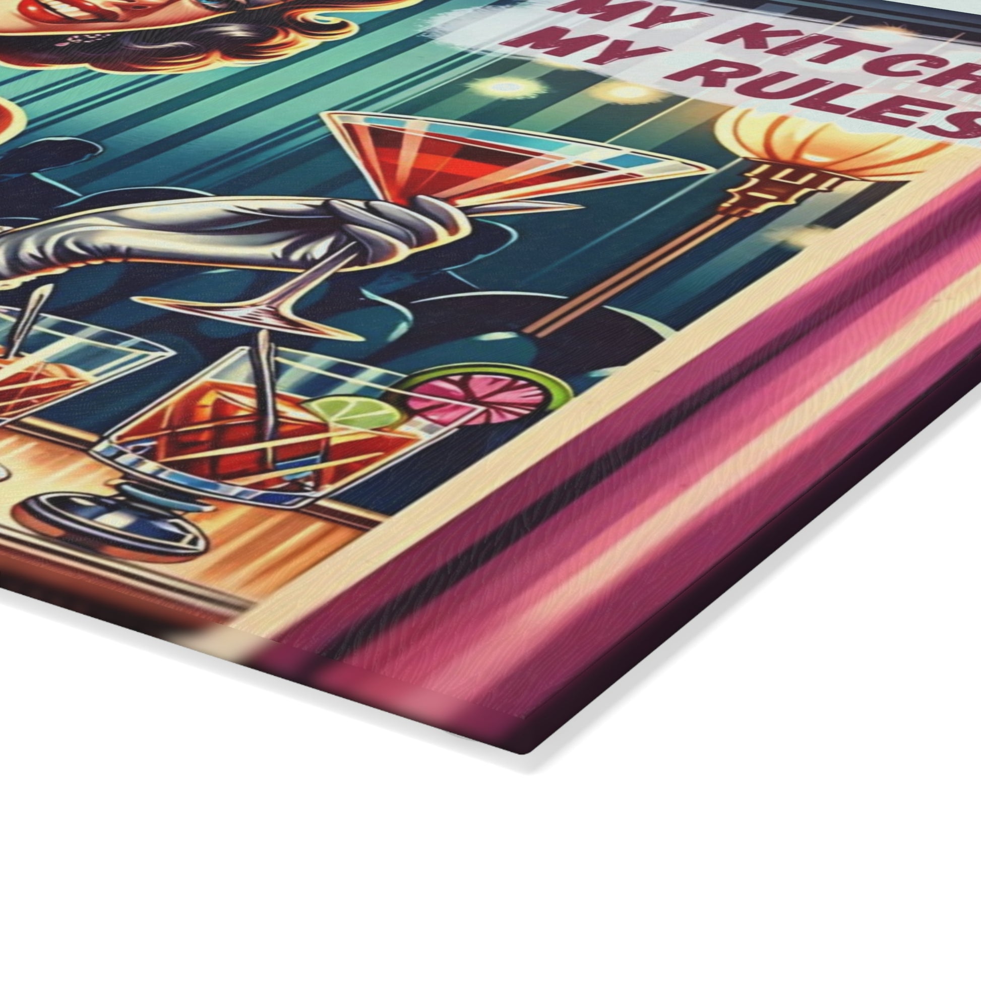 🍸💋 “My Kitchen, My Rules!” Retro Glam Glass Cutting Board – Sassy Vintage Bar Vibes