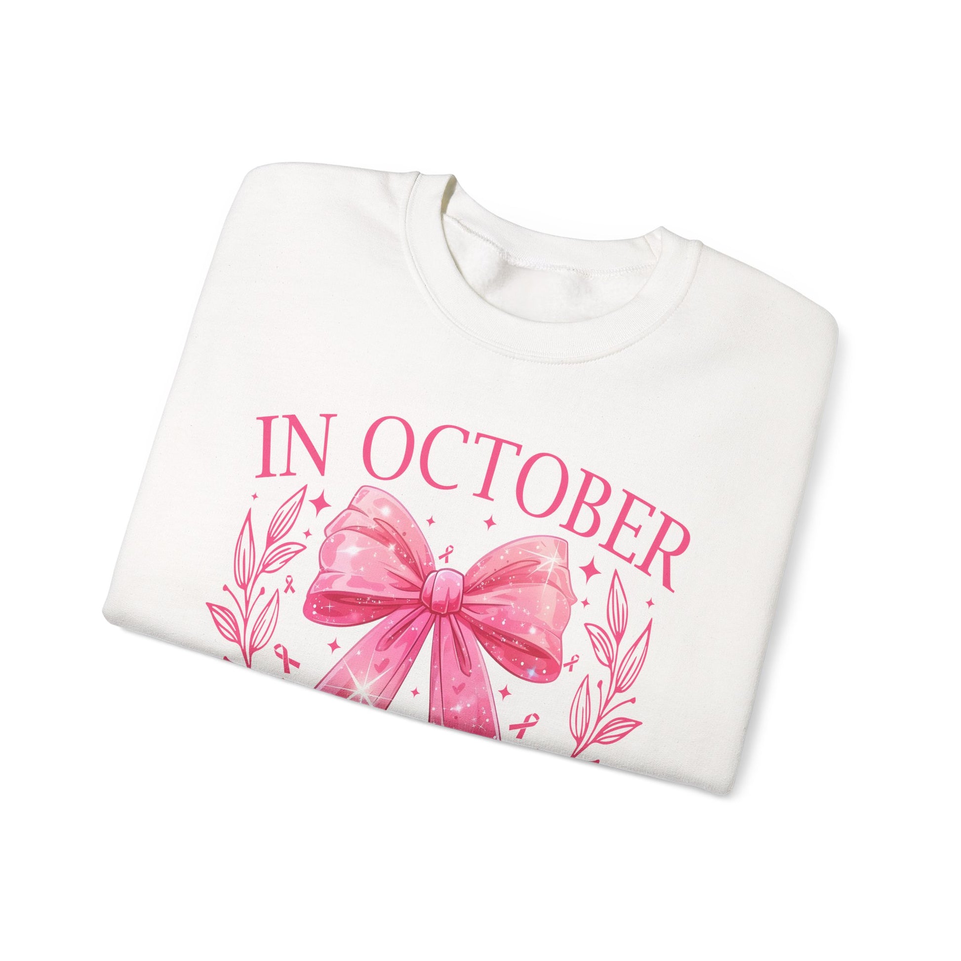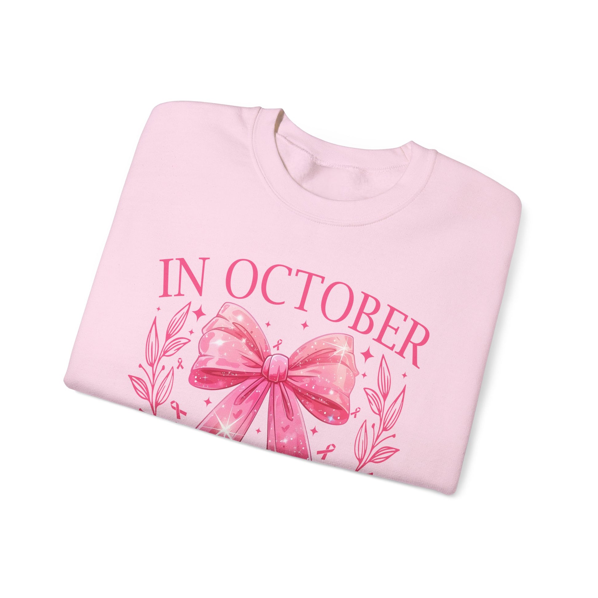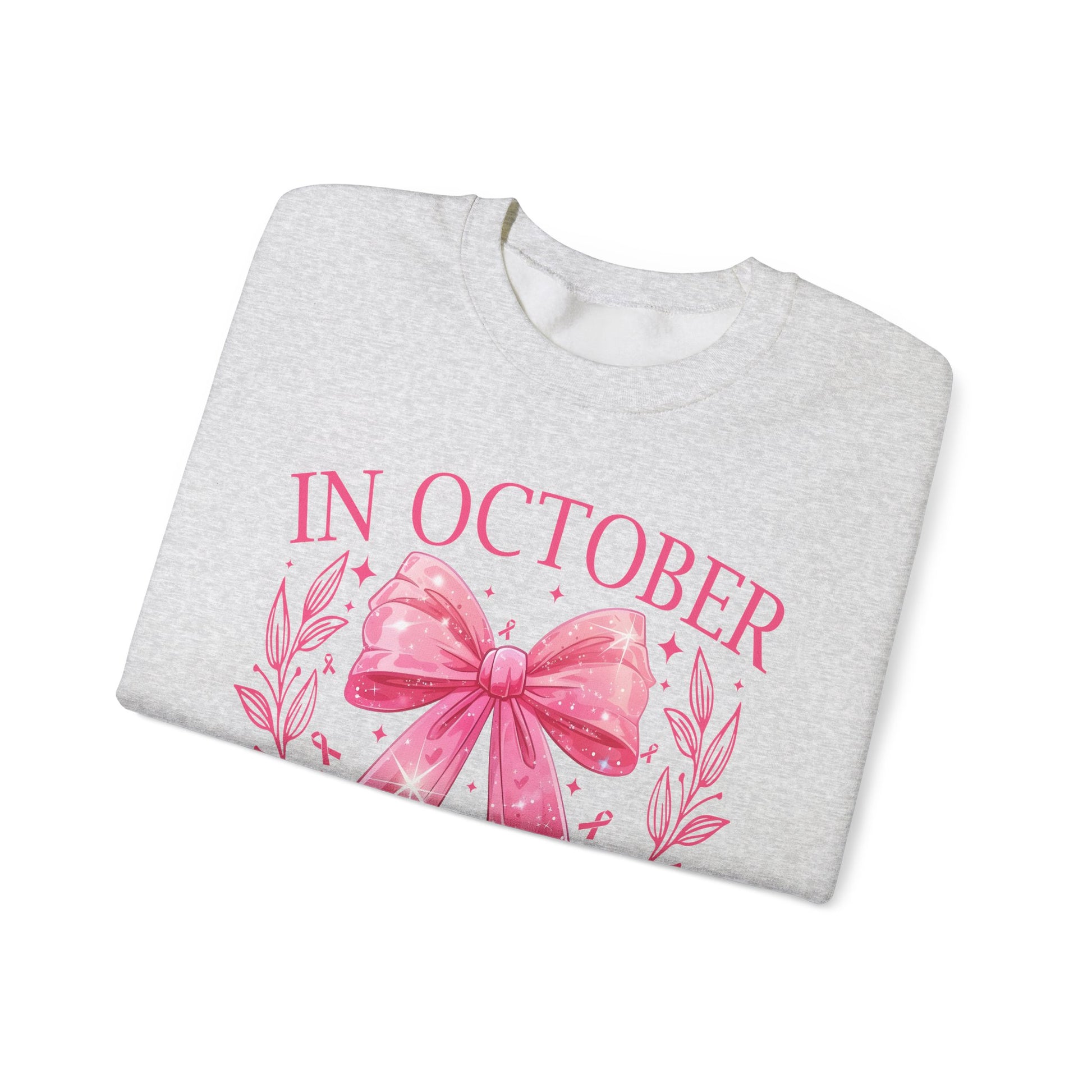 ๐ŸŽ€โœจ In October We Wear Pink Sweatshirt โ€“ Elegant Bow Breast Cancer Awareness Crewneck