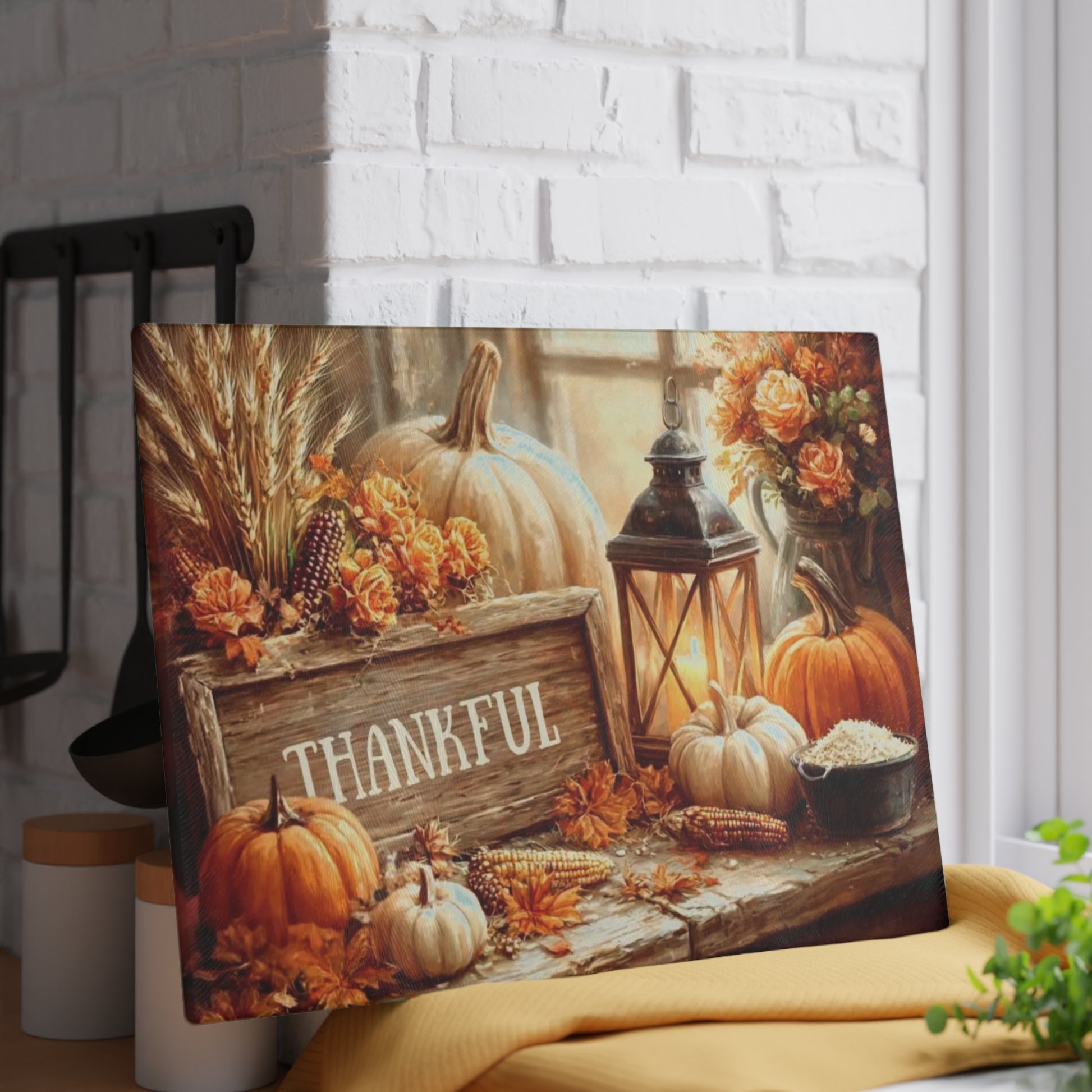 Add a bold touch of seasonal personality to your kitchen with this warm “Thankful Autumn Vignette” glass cutting board! Pumpkins, wheat, florals, pinecones, and a glowing lantern frame a rustic “THANKFUL” sign—bringing comfort, color, and charm to any cooking space. Perfect for anyone who loves classic fall style and wants a countertop conversation starter.