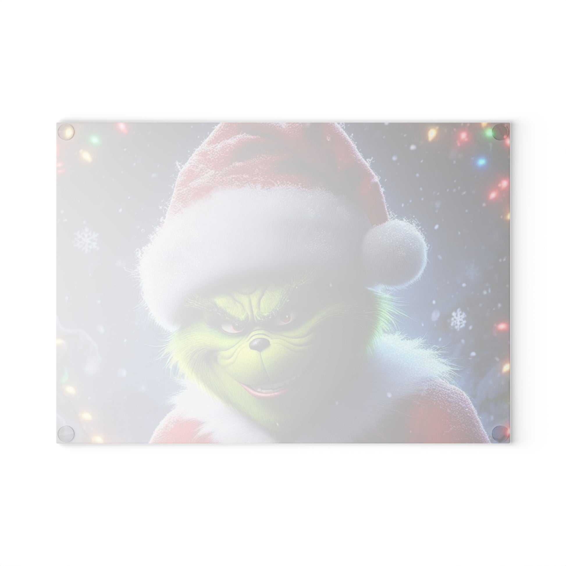Bring cheeky holiday charm to your kitchen with this festive cutting board featuring a sly green character in a Santa suit and snowy backdrop. Perfect for adding a playful twist to your Christmas hosting or gifting, this design pops with holiday lights and a frosty winter night scene. A must-have for those who love a bold and mischievous twist on traditional decor!