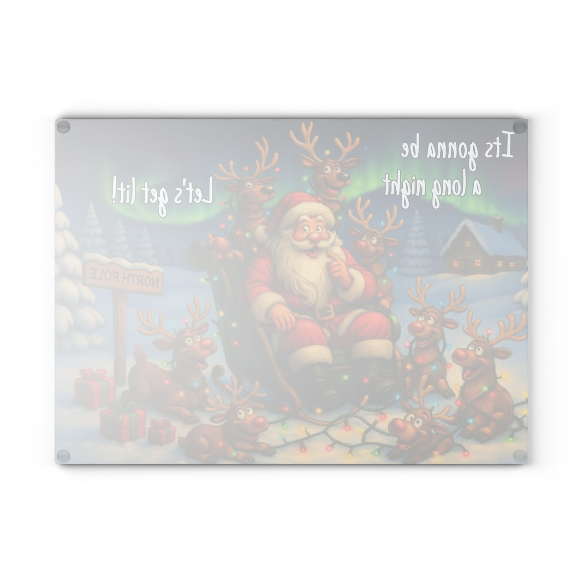 Light up your kitchen with this playful “Let’s Get Lit” glass cutting board featuring Santa and his reindeer crew surrounded by twinkling lights at the North Pole. This cheerful design brings holiday joy, cozy charm, and a dash of humor to your home—perfect for anyone who loves festive kitchen décor with personality.