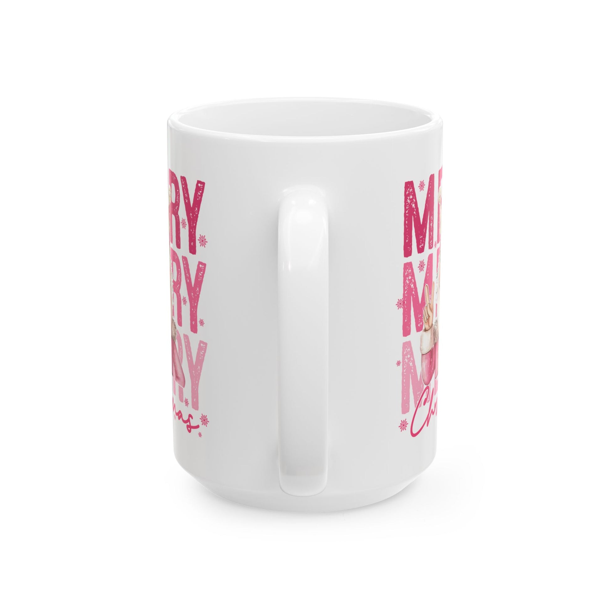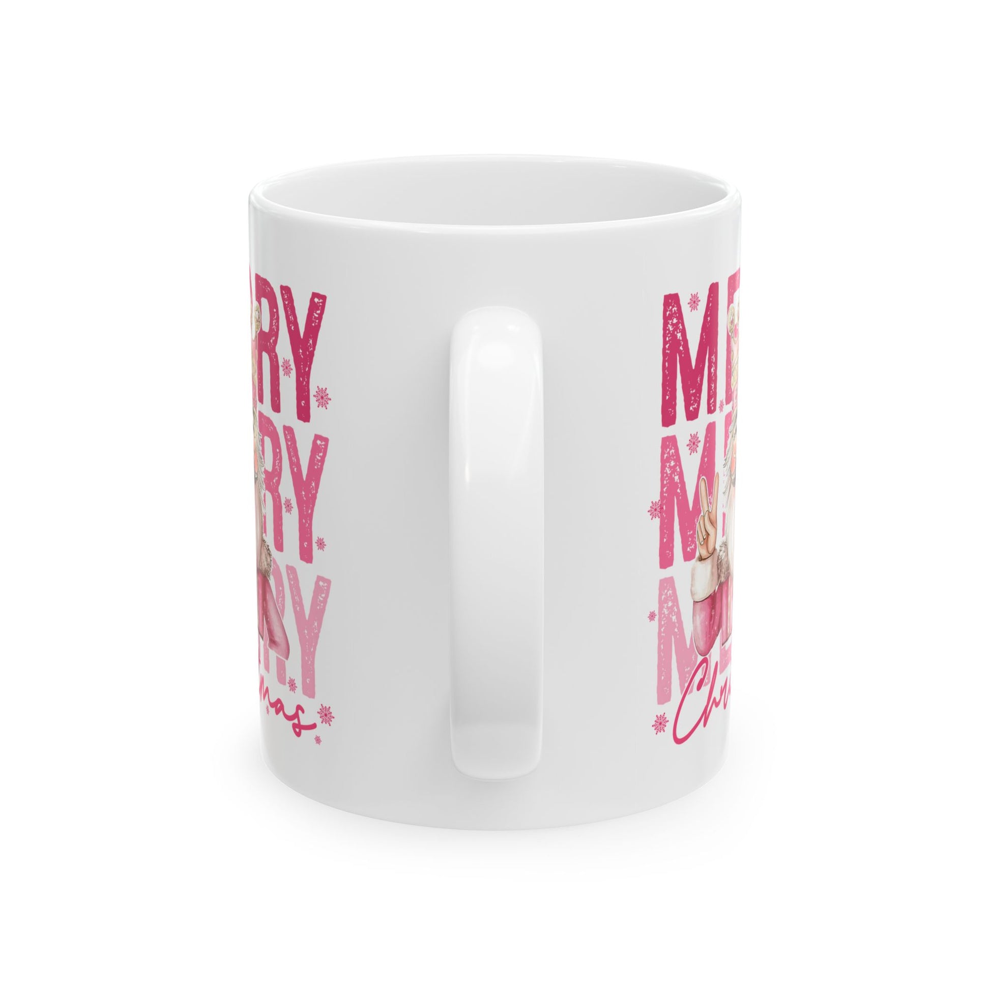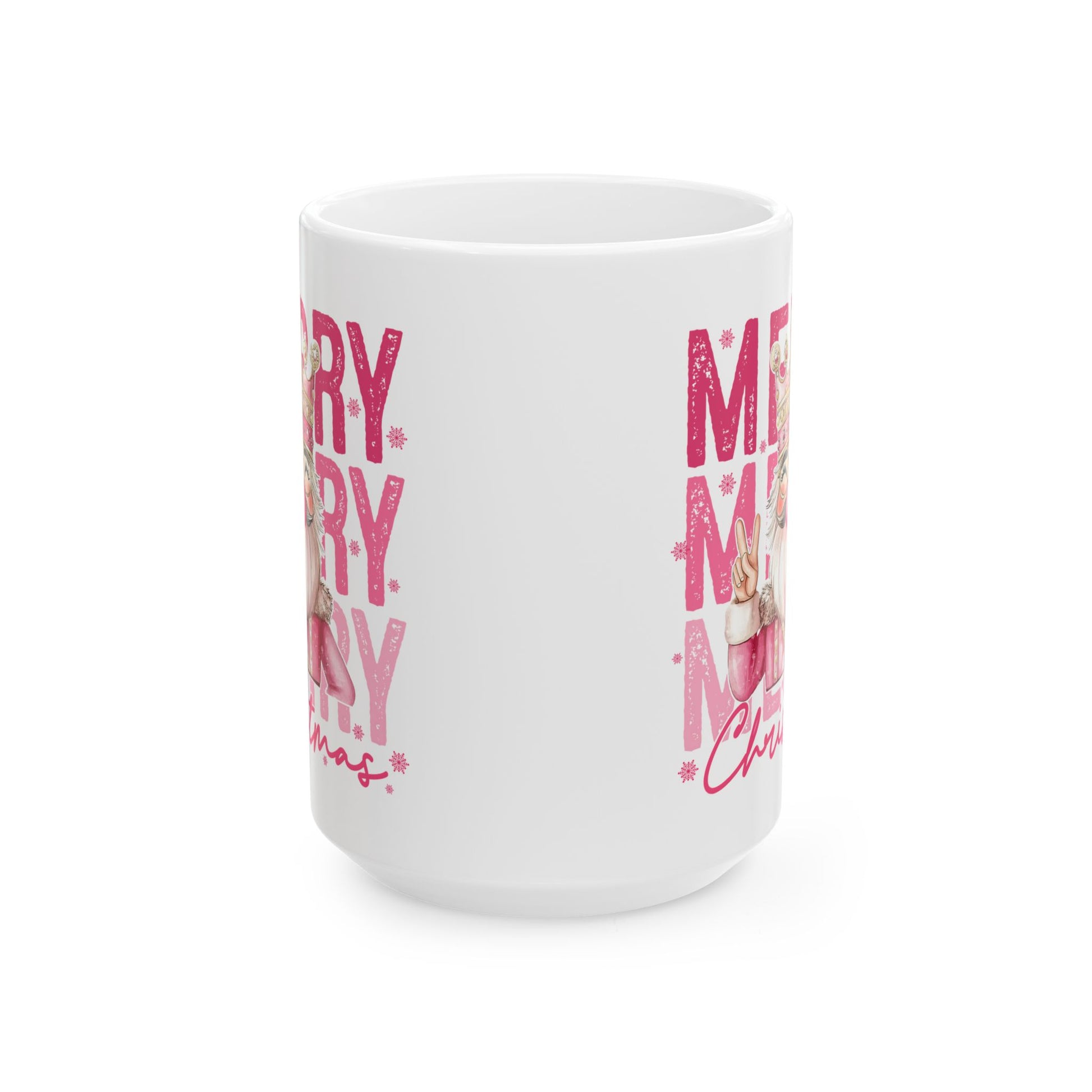 Get festive in the sassiest way possible with our โMerry Merry Merry Christmasโ mug featuring the trendiest Santa around! Dressed in fabulous pink with a crown, glasses, and a peace sign, this jolly guy is ready to sleigh your morning routine. Whether you're sipping hot cocoa by the tree or gifting some sparkle to your holiday crew, this merry mug brings fun, fashion, and cheer to every cup!
