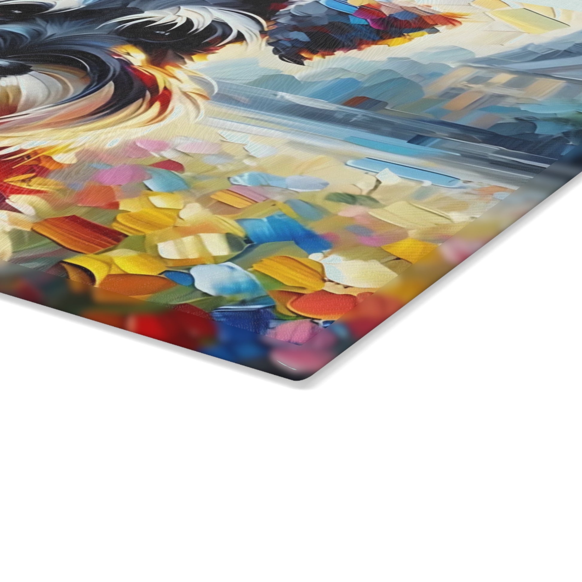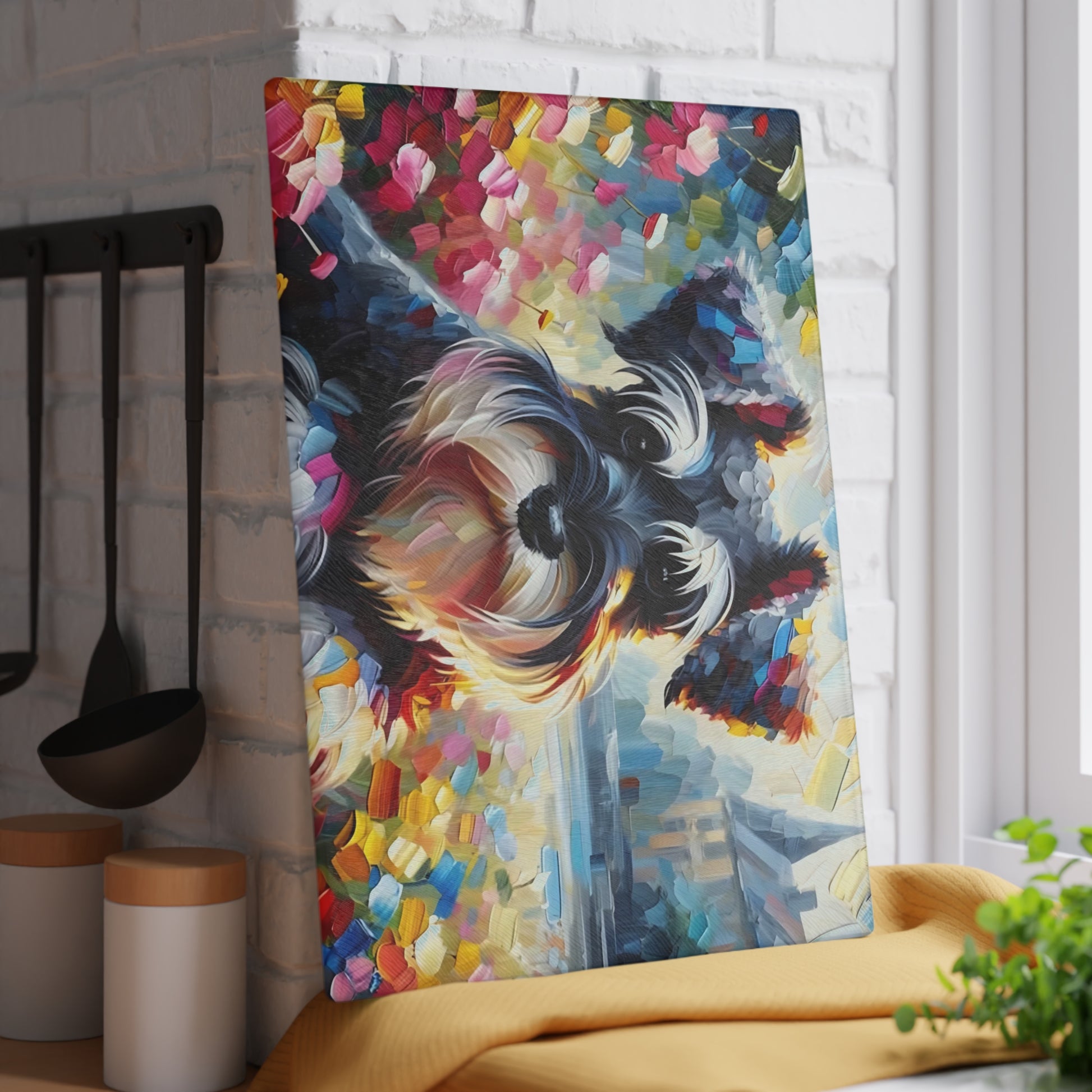 Brighten your kitchen with this eye-catching cutting board featuring a vibrant Schnauzer in a field of flowers, painted in a bold, artistic style. The expressive eyes and rich color palette bring personality and joy to your countertop, making it a conversation piece and a functional accessory all in one. Whether prepping a meal or using it as a decorative serving tray, this piece adds flair and fun to any dog loverβs home.