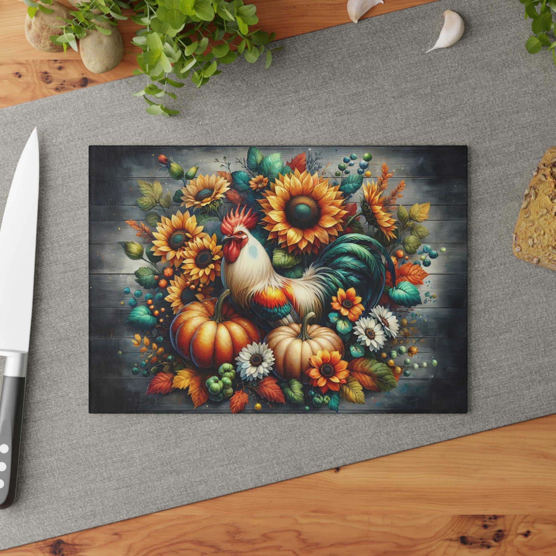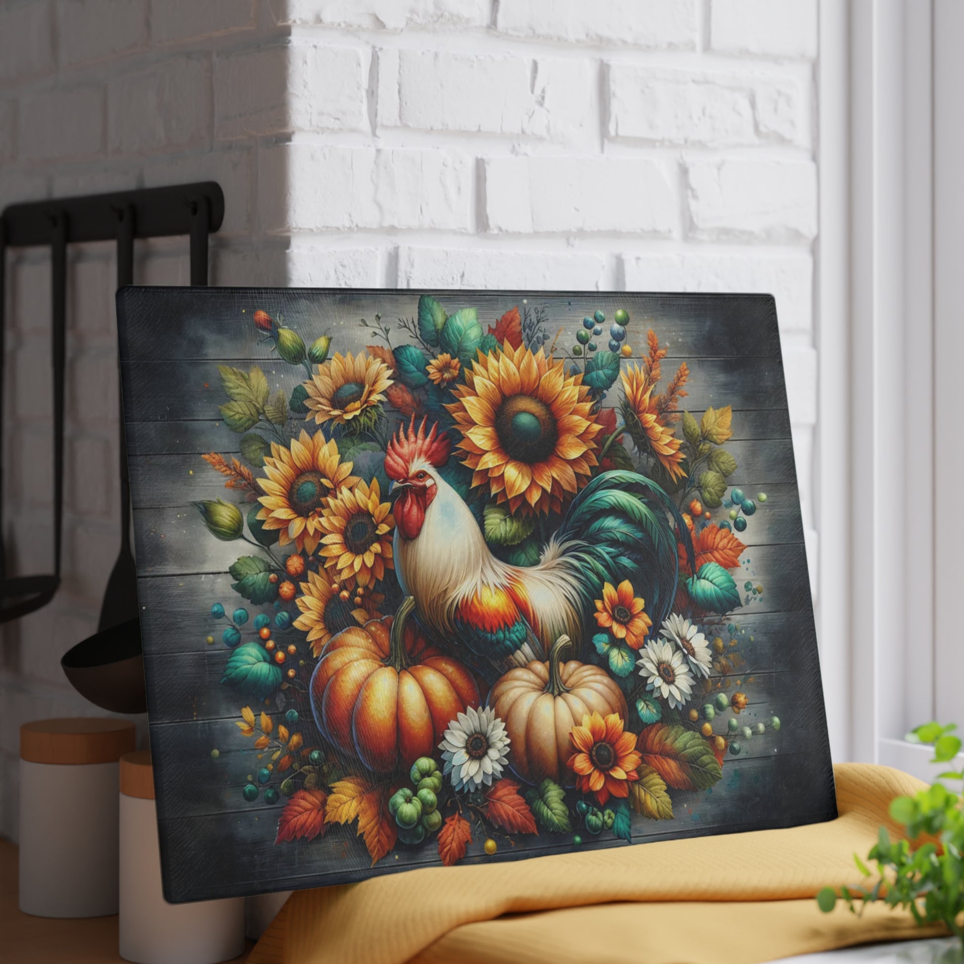🐓🌻 “Harvest Rooster & Sunflowers” Glass Cutting Board – Cozy Autumn Charm for Your Kitchen