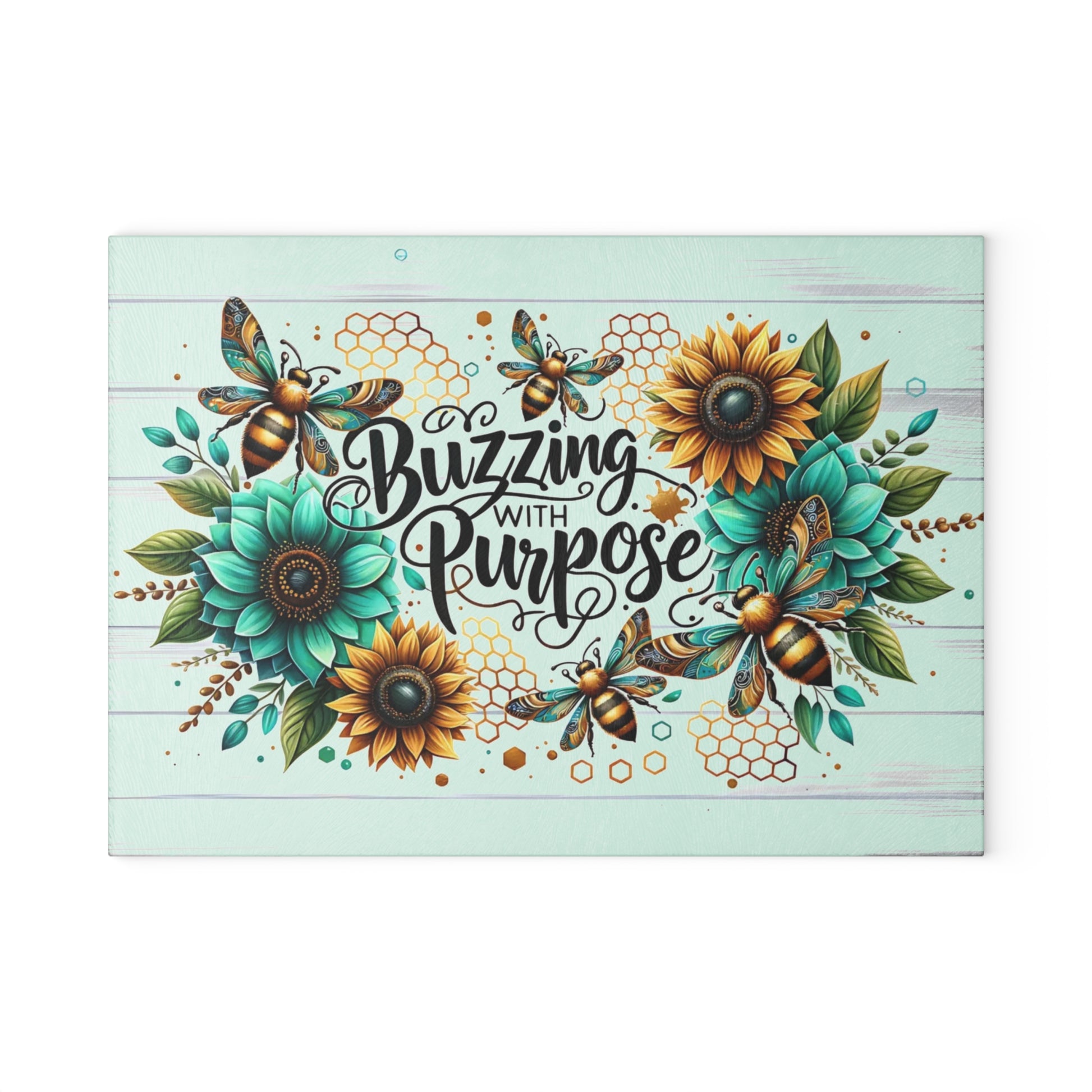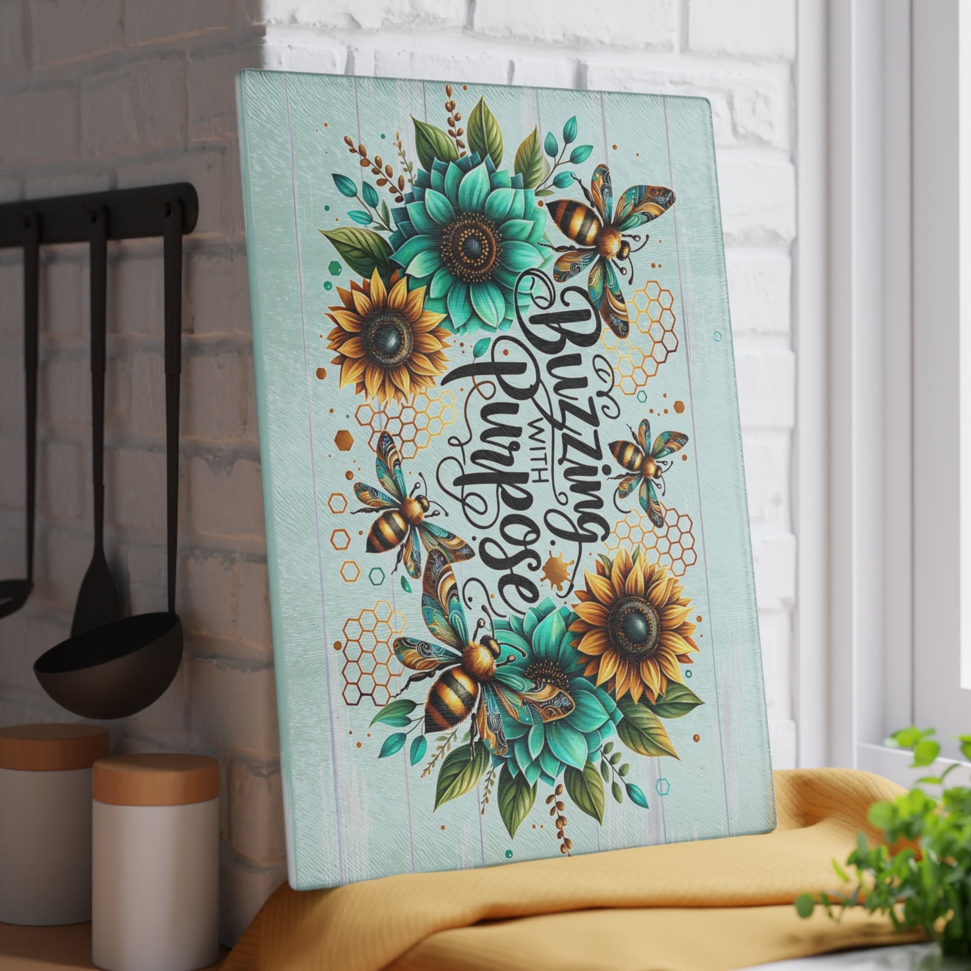 Add bright, cheerful energy to your kitchen with this Buzzing with Purpose glass cutting board. The artwork features golden sunflowers, teal florals, and detailed honeybees surrounding a positive, inspiring message that brings warmth to any countertop. Whether used for meal prep, serving snacks, or displayed as décor, this piece blends artistry with everyday function.