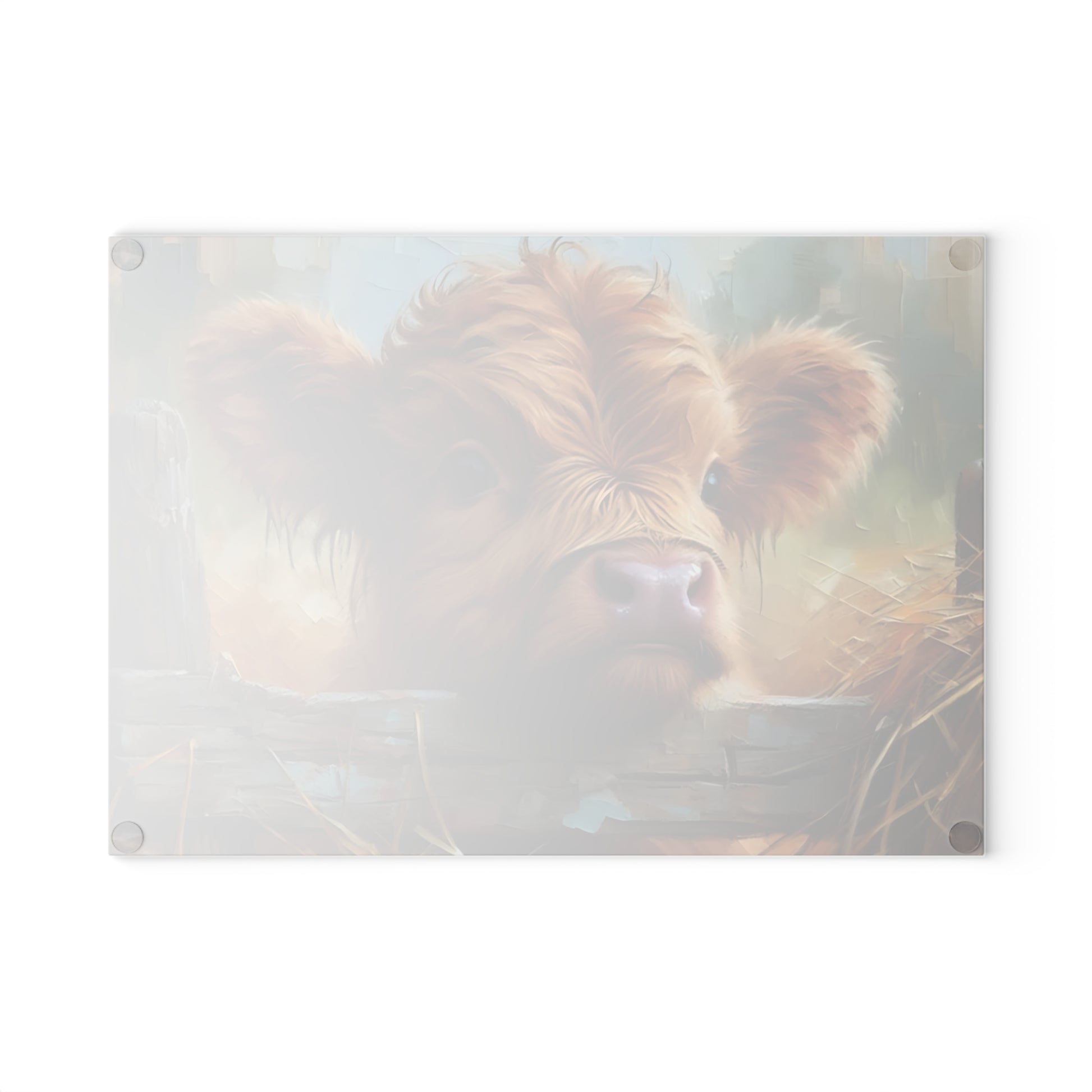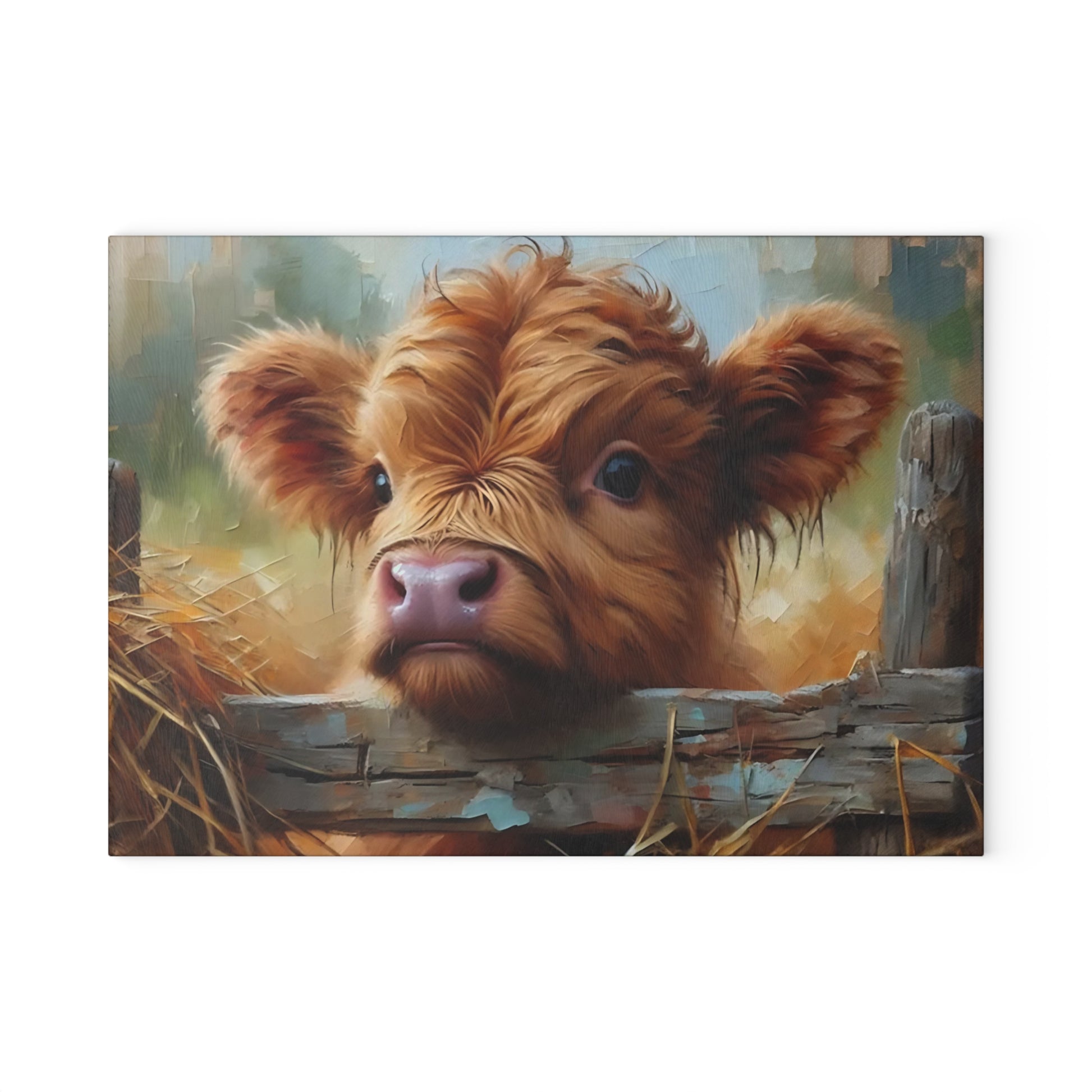 This delightful cutting board features a sweet Highland calf peeking over a wooden fence, surrounded by golden hay and painted in a warm, rustic style. Its expressive eyes and soft fur bring a gentle countryside warmth to your kitchen dรฉcor. Whether youโre prepping dinner or simply displaying it for guests, this charming calf design adds a comforting, pastoral vibe to any space.