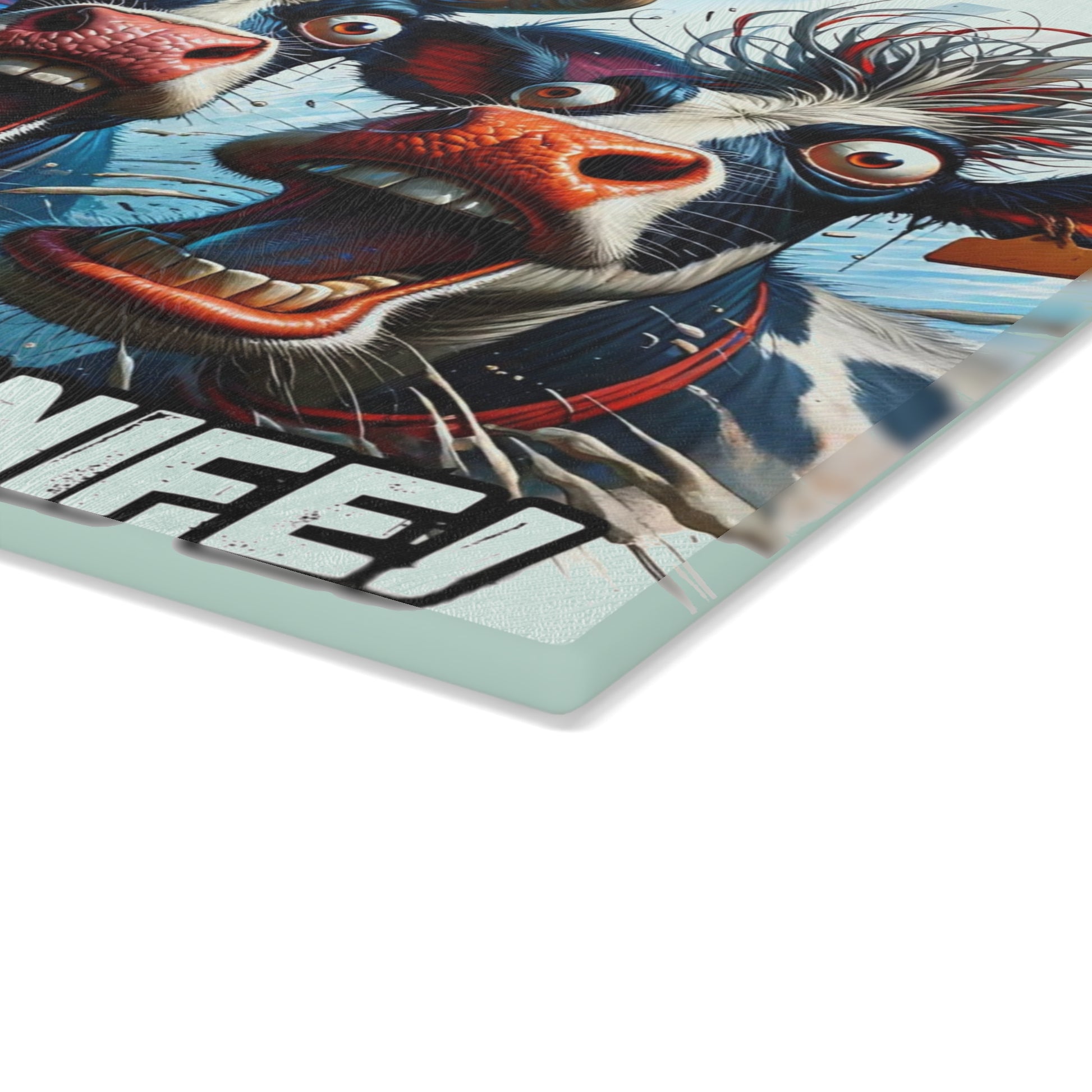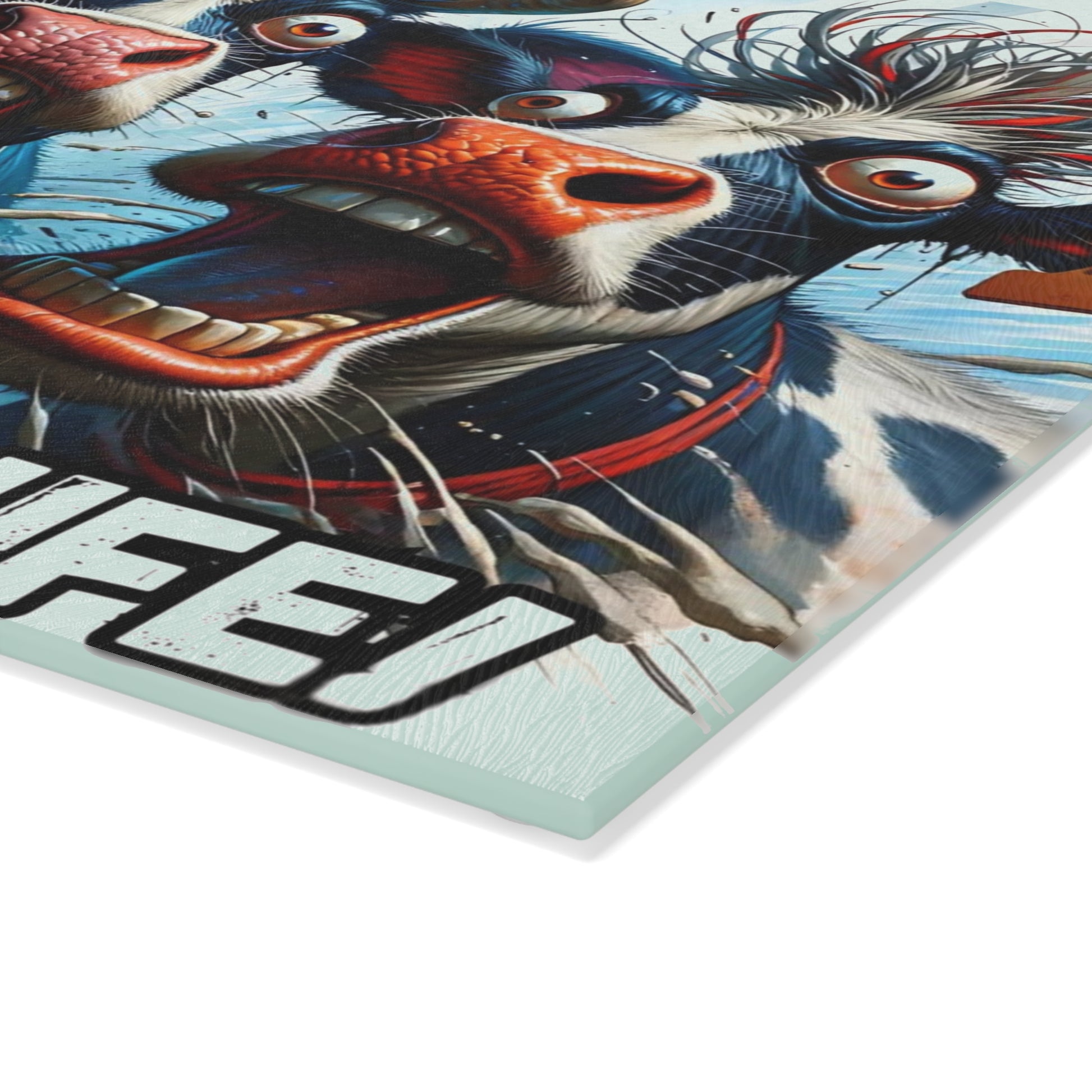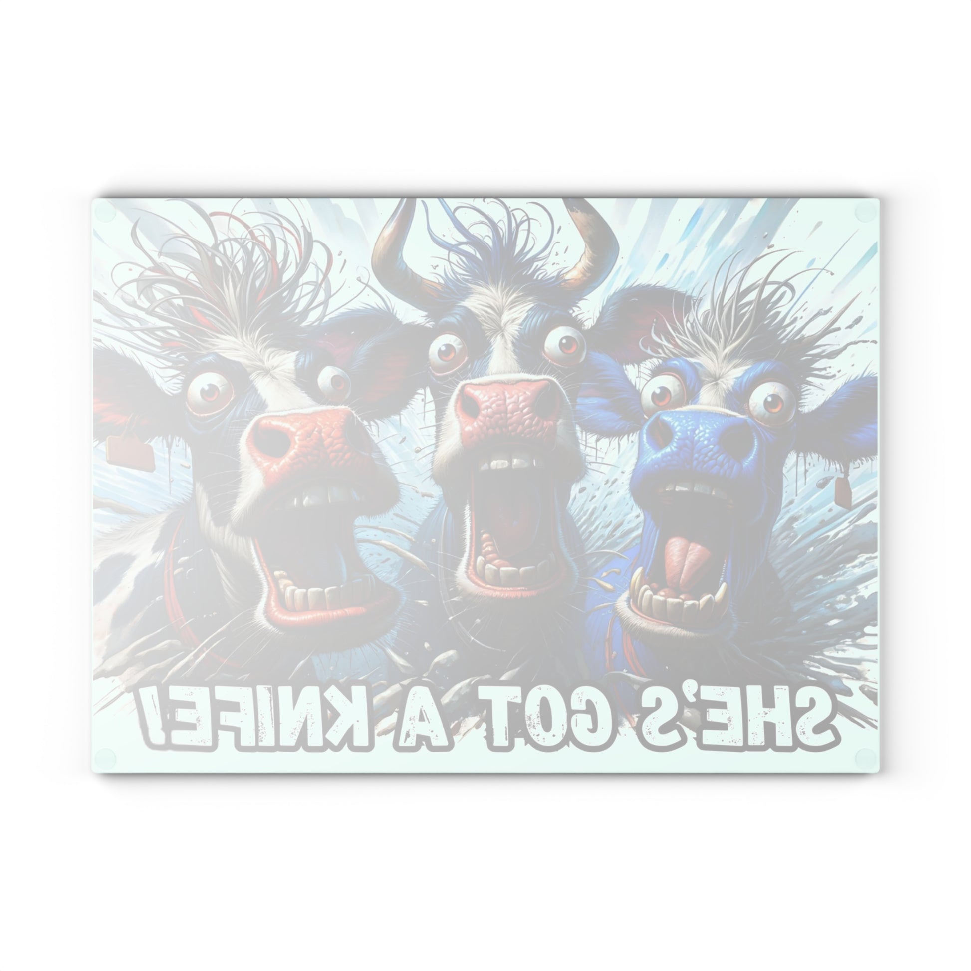 🐮🔪 “She’s Got a Knife!” Glass Cutting Board – Hilarious Farmhouse Horror Vibes