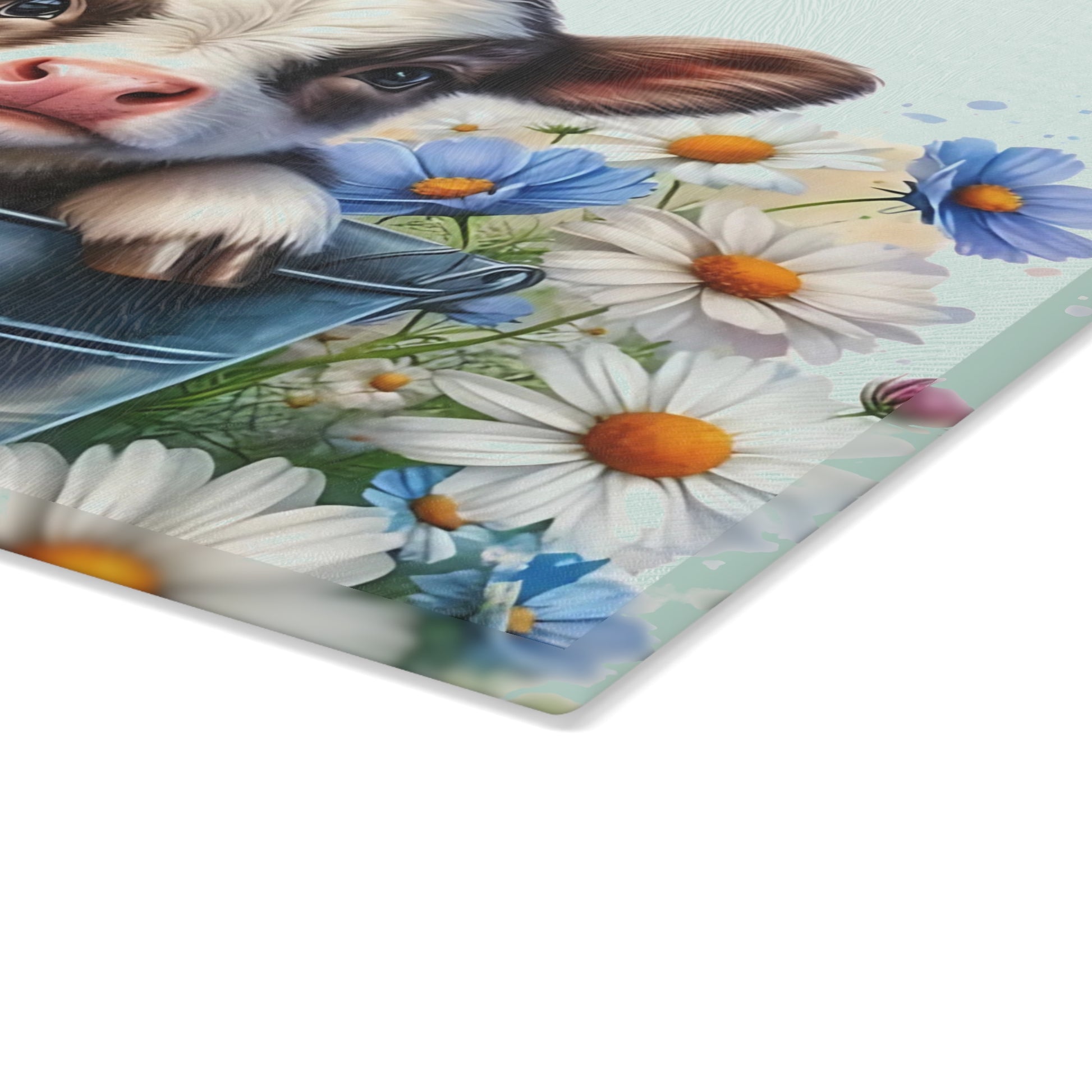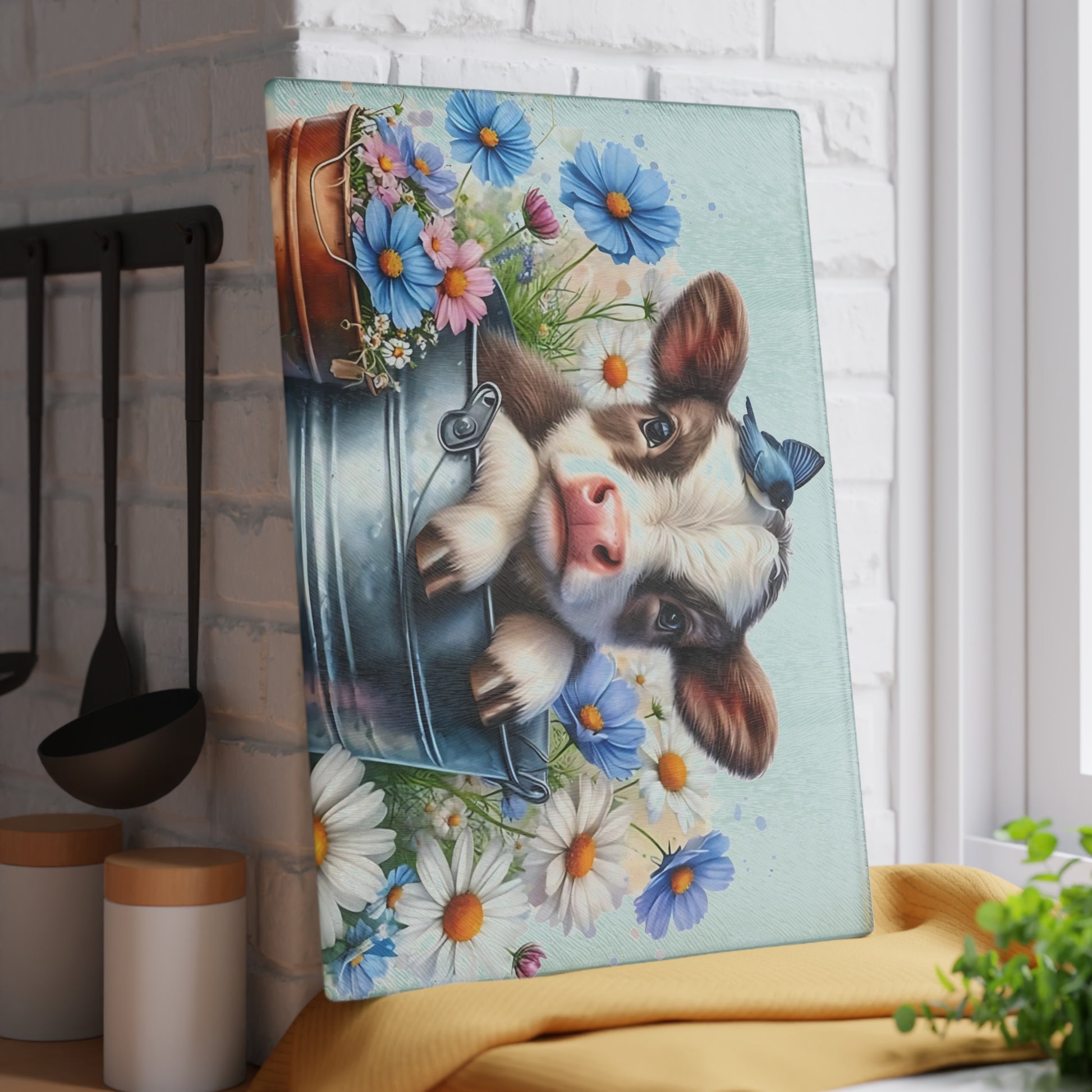 ๐Ÿฎ Baby Cow in Bucket with Blue Daisies Cutting Board โ€“ Farmhouse Charm for Your Kitchen ๐ŸŒผ