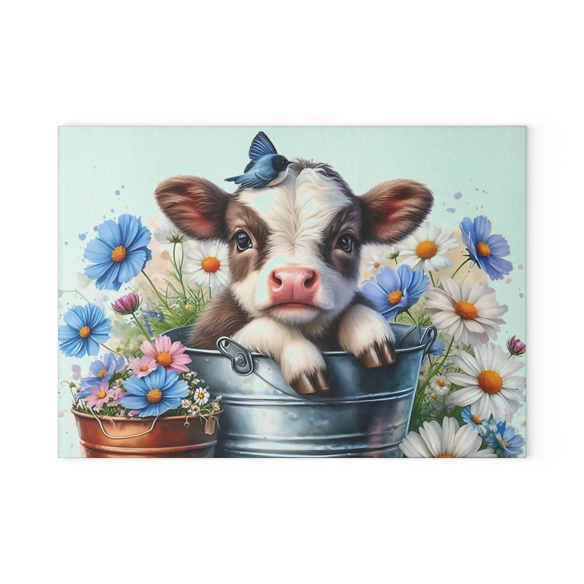 Add rustic sweetness to your kitchen with this adorable baby cow cutting board! Featuring a precious calf nestled in a metal bucket surrounded by bright blue daisies, white wildflowers, and a tiny bird perched playfully on its head, this board captures the pure charm of farm life. A delightful addition for farmhouse decor fans, animal lovers, and anyone who appreciates whimsical rustic art.
