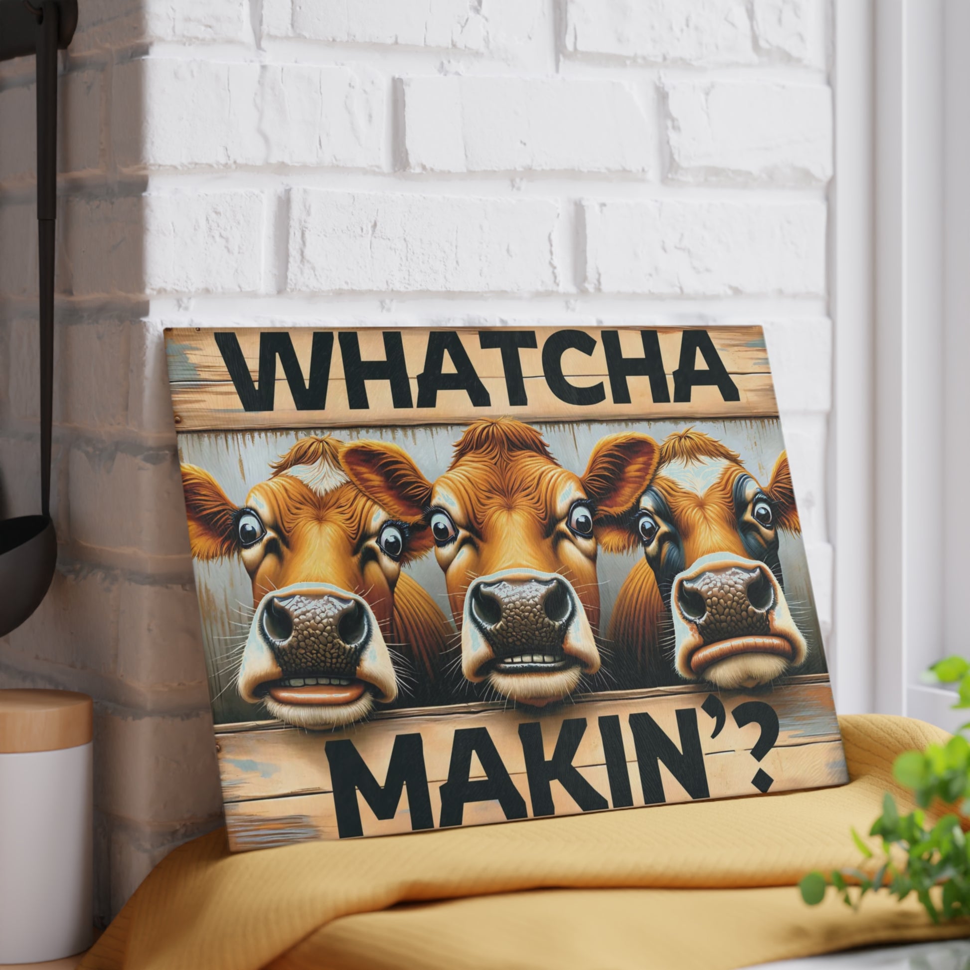 Add a bold touch of personality to your kitchen with this fun “Whatcha Makin’?” glass cutting board! Featuring three curious cows peeking over rustic planks with a big bold headline, this design brings warmth, humor, and charm to any cooking space. It’s perfect for anyone who loves playful country style and wants a countertop piece that always starts a conversation.