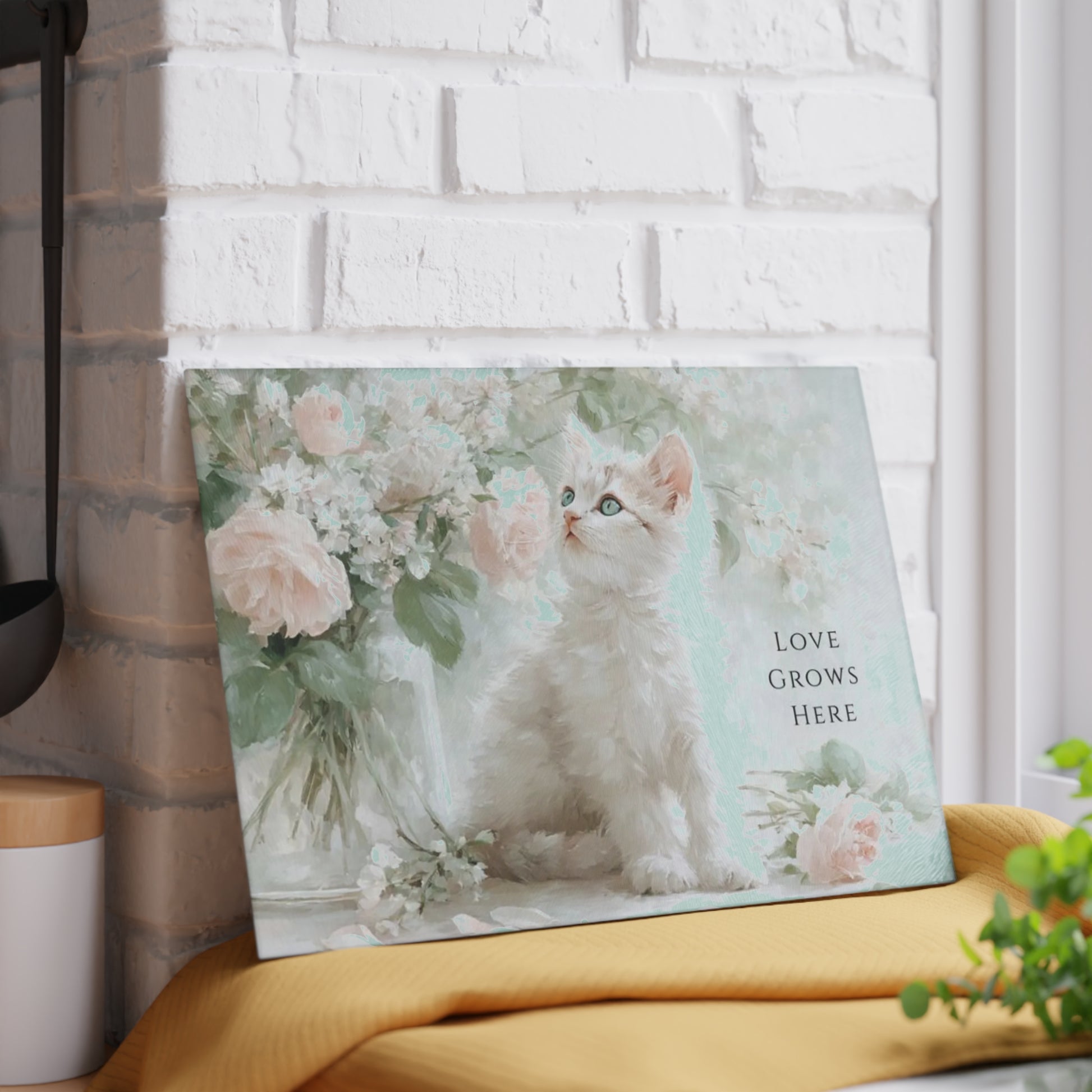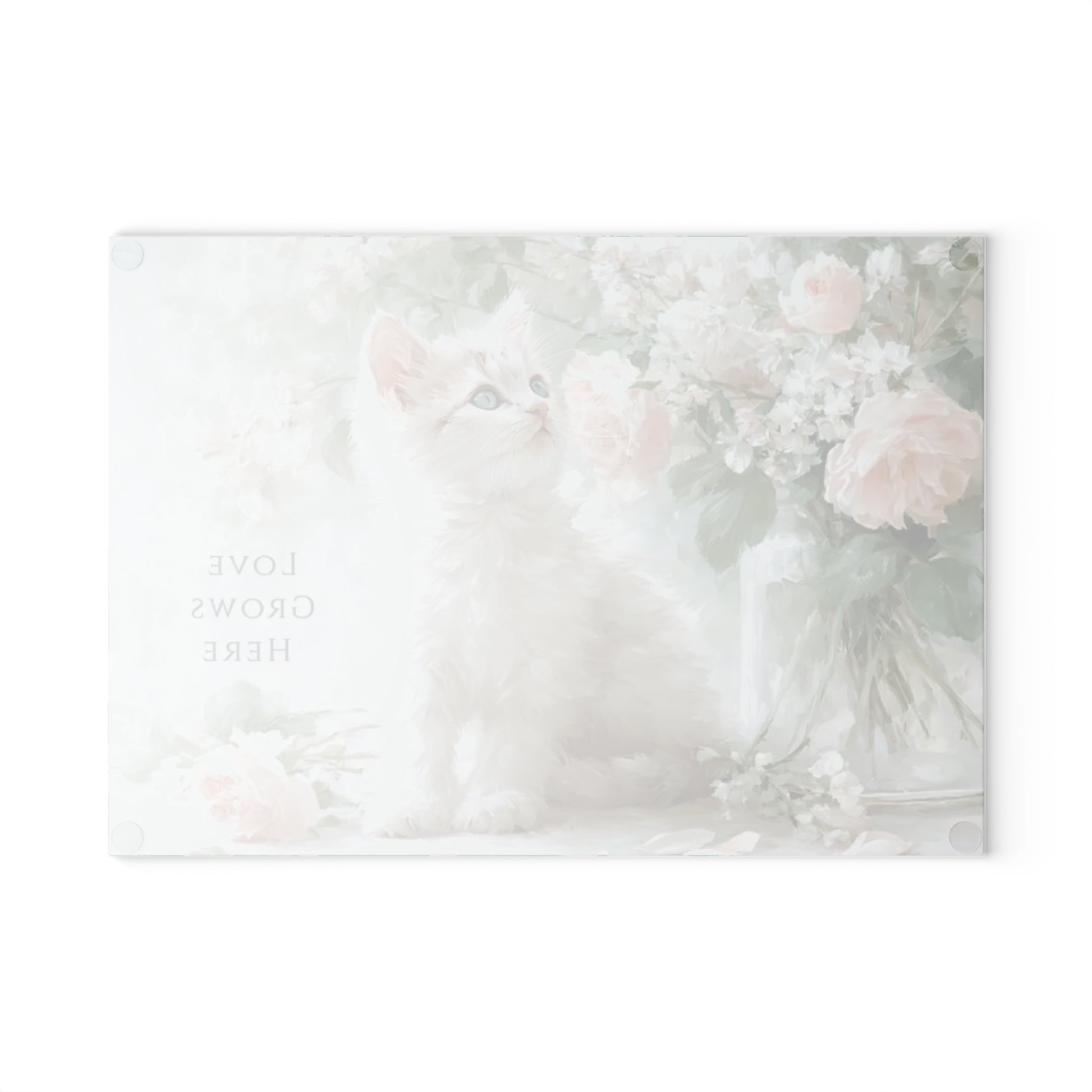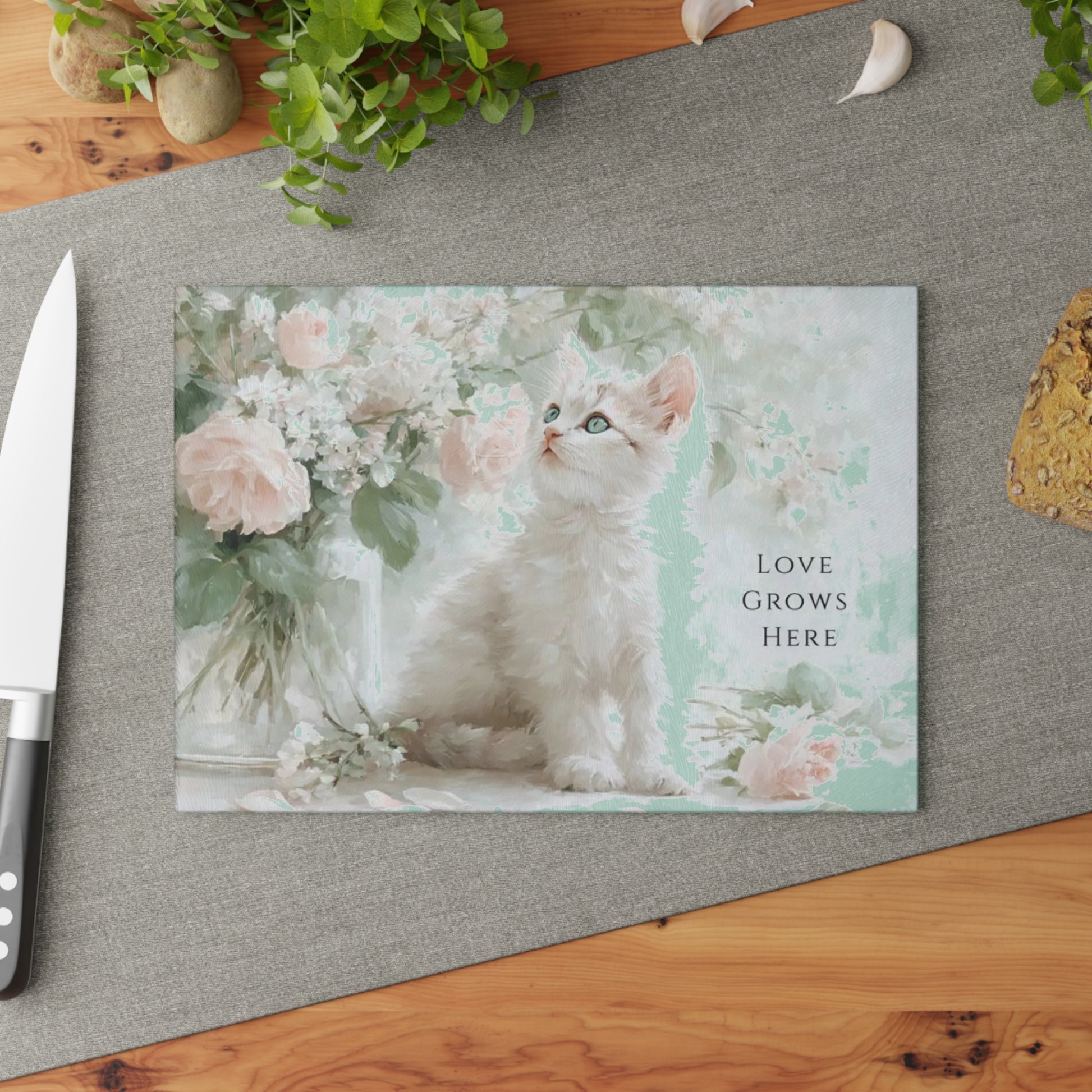 Bring gentle romance and timeless beauty into your kitchen with this “Love Grows Here” glass cutting board. Featuring a fluffy white kitten nestled beside blush roses and fresh greenery on a soft mint background, this design creates a calm, welcoming atmosphere that blends cottage charm with refined elegance. Whether used as a functional surface or styled on your counter, this piece adds warmth and personality to any space.