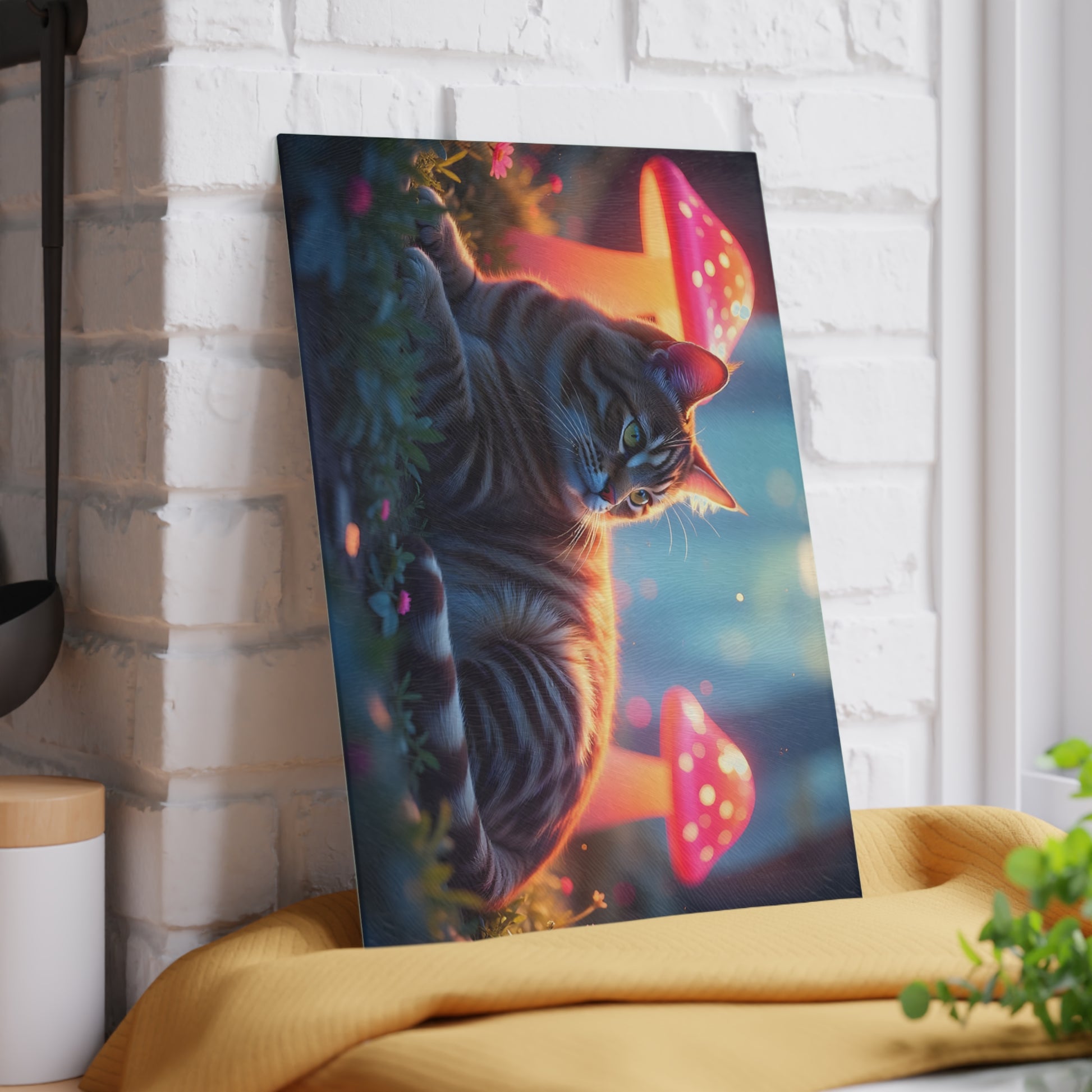 Step into a whimsical world with this Cat and Mushroom tempered glass cutting board. Featuring a curious cat lounging in a magical forest of glowing mushrooms, this board is perfect for cat lovers and fans of enchanting, fairy-tale-inspired dรฉcor. Functional and artistic, itโs a captivating piece for your kitchen or as a unique gift.