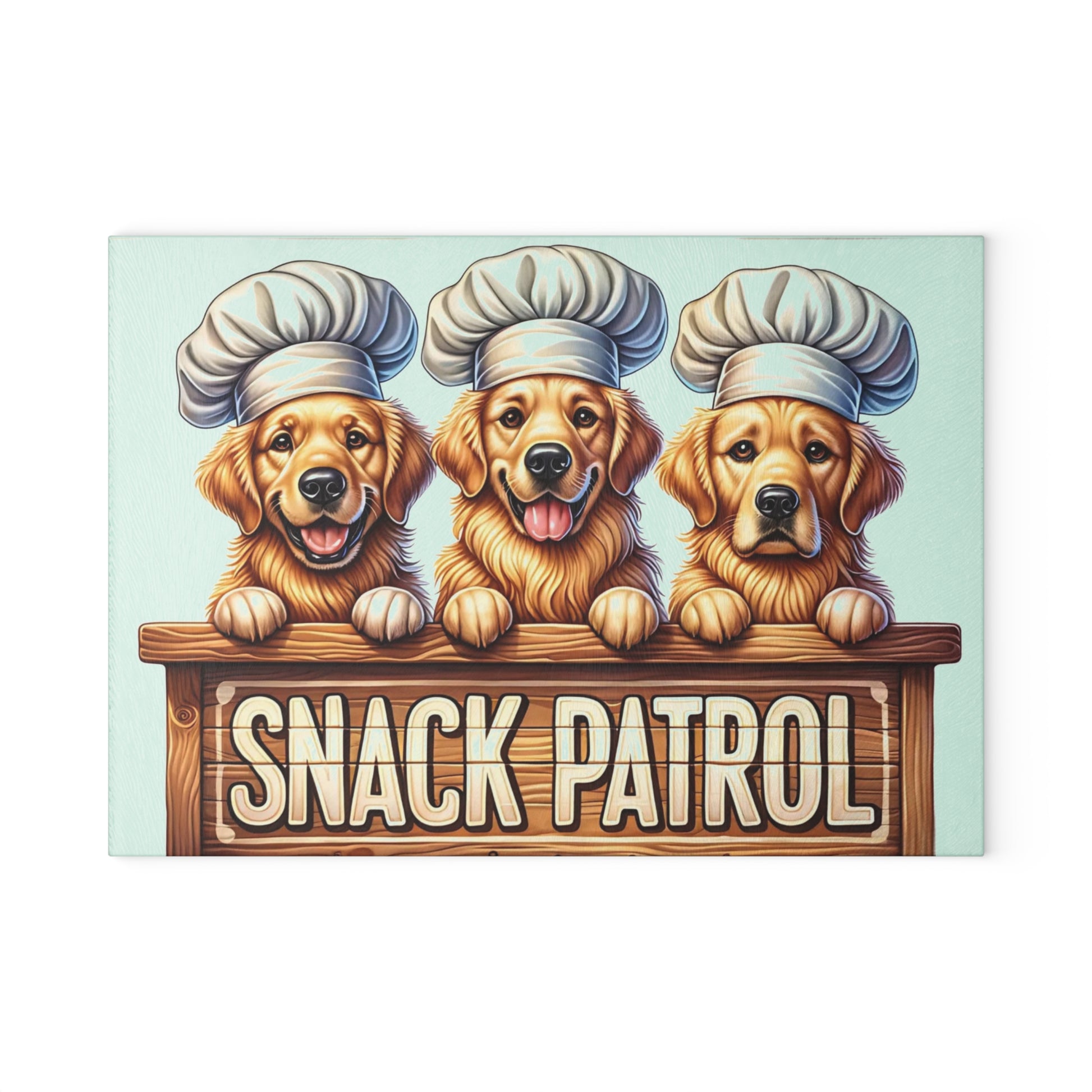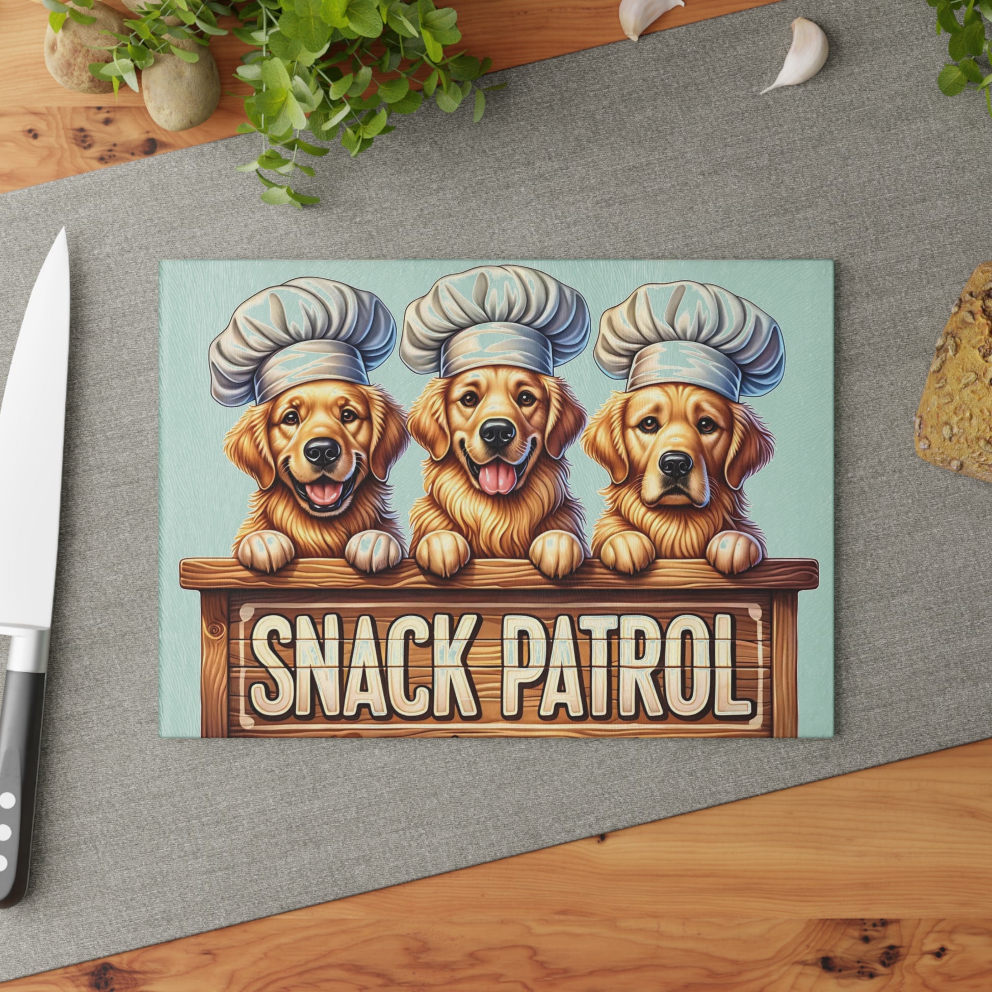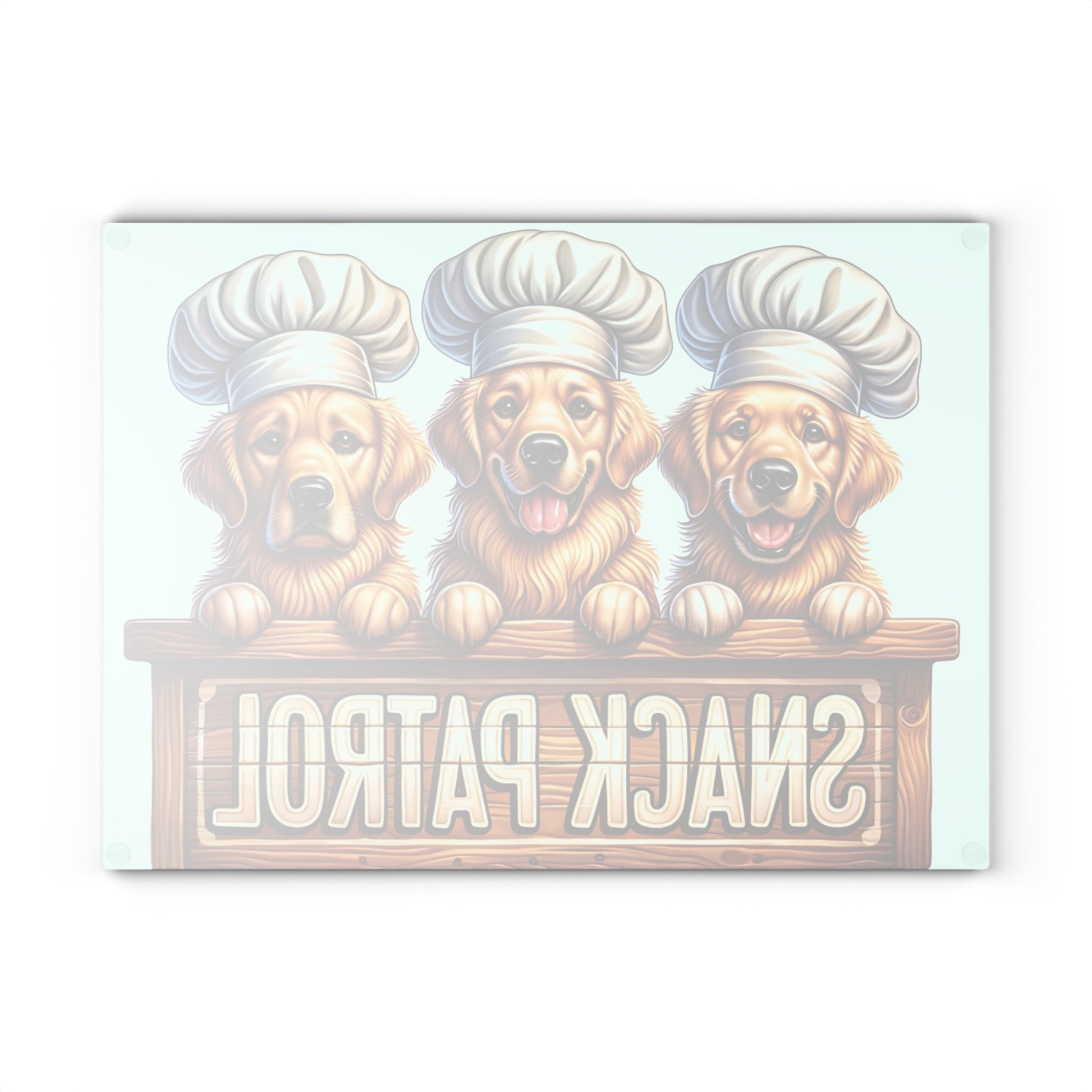 🐶🍪 “Snack Patrol” Glass Cutting Board – Golden Retrievers on Duty