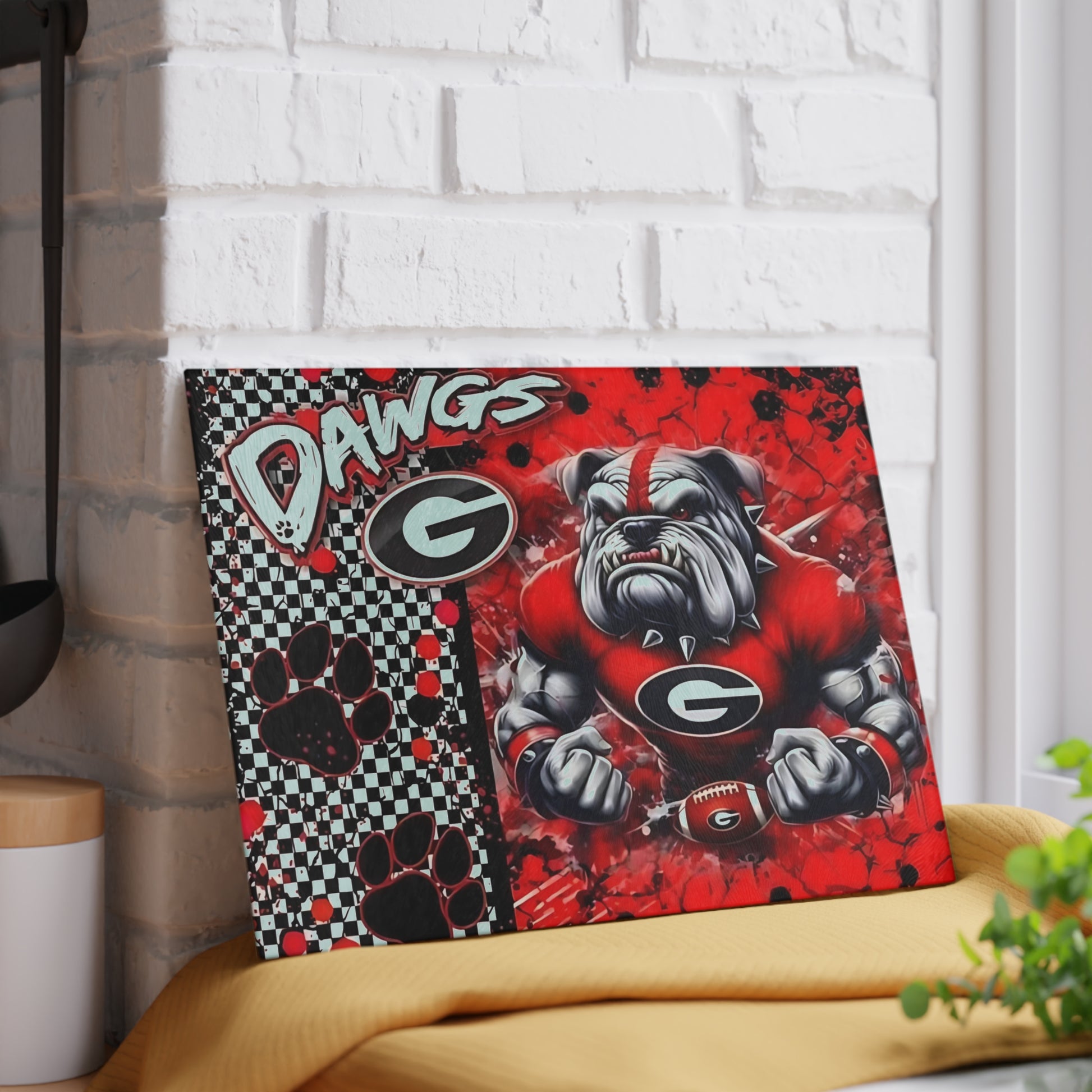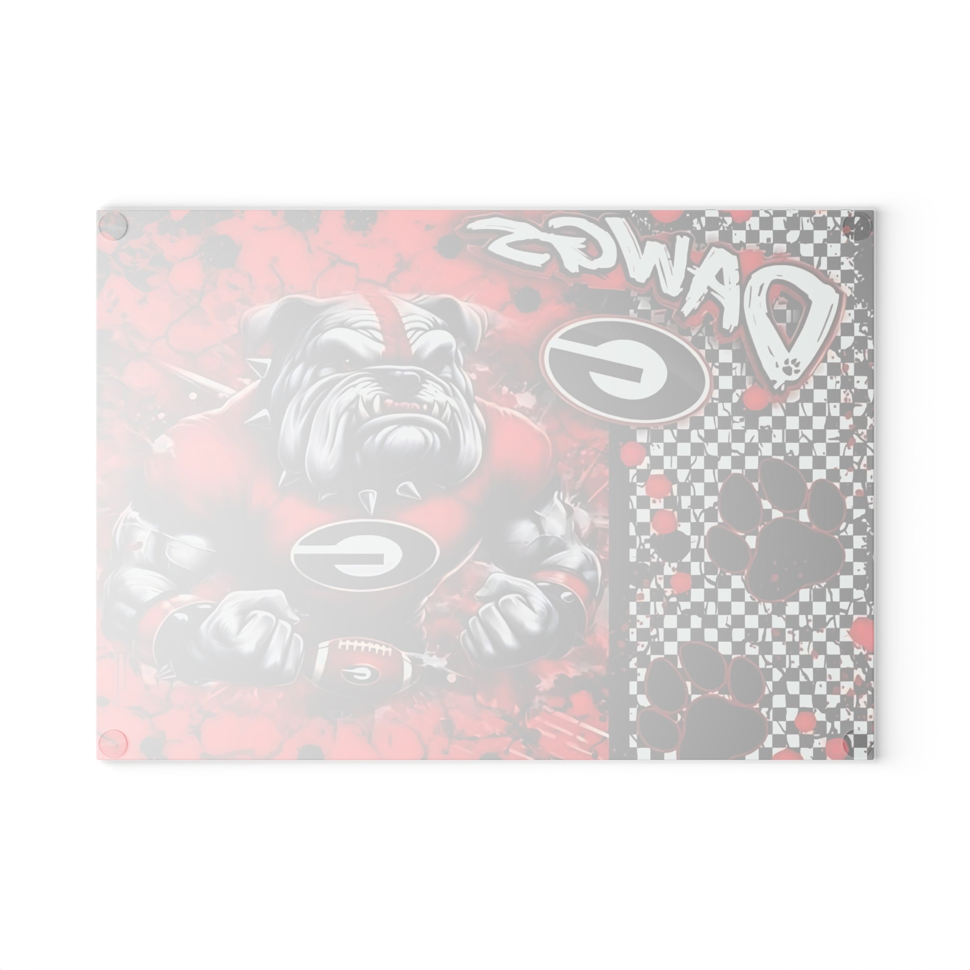 Turn up the energy in your kitchen with this Bulldog Cutting Board! Featuring a powerful bulldog mascot against a bold red and black background with paw prints and checkerboard accents, this tempered glass board brings fierce spirit to every meal. Perfect for prepping, serving, or displaying, it’s a must-have for fans of bold design, game day entertaining, or unique home décor.