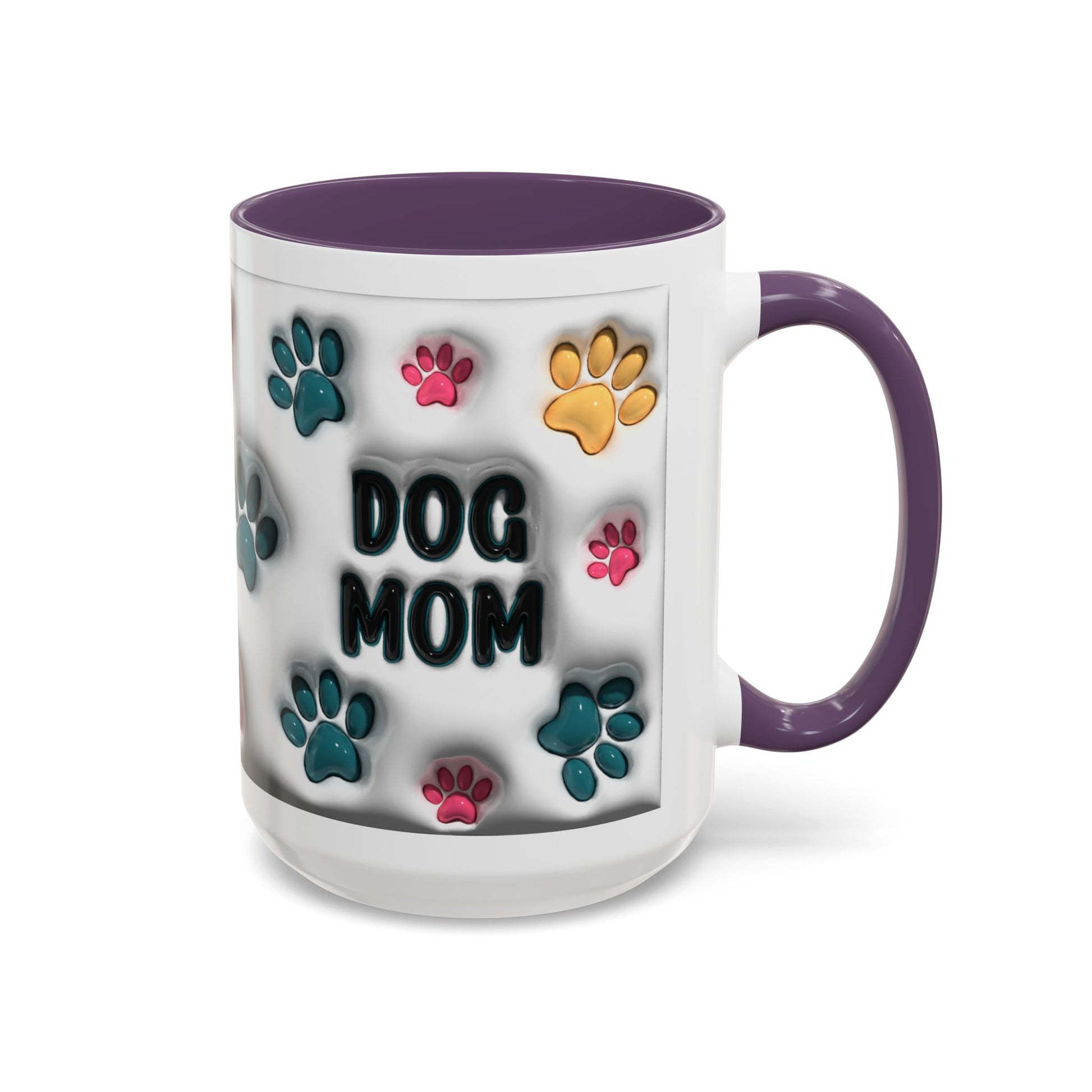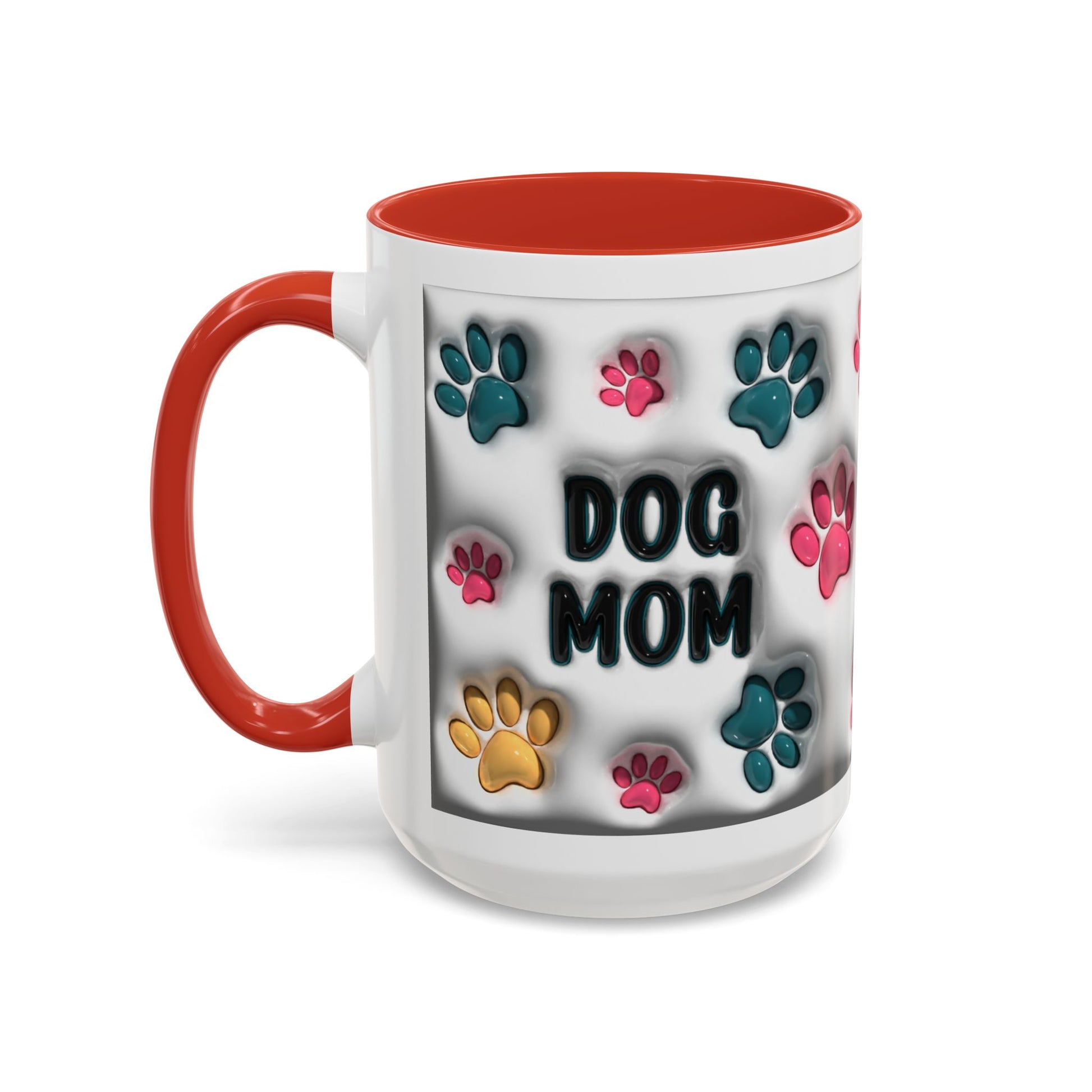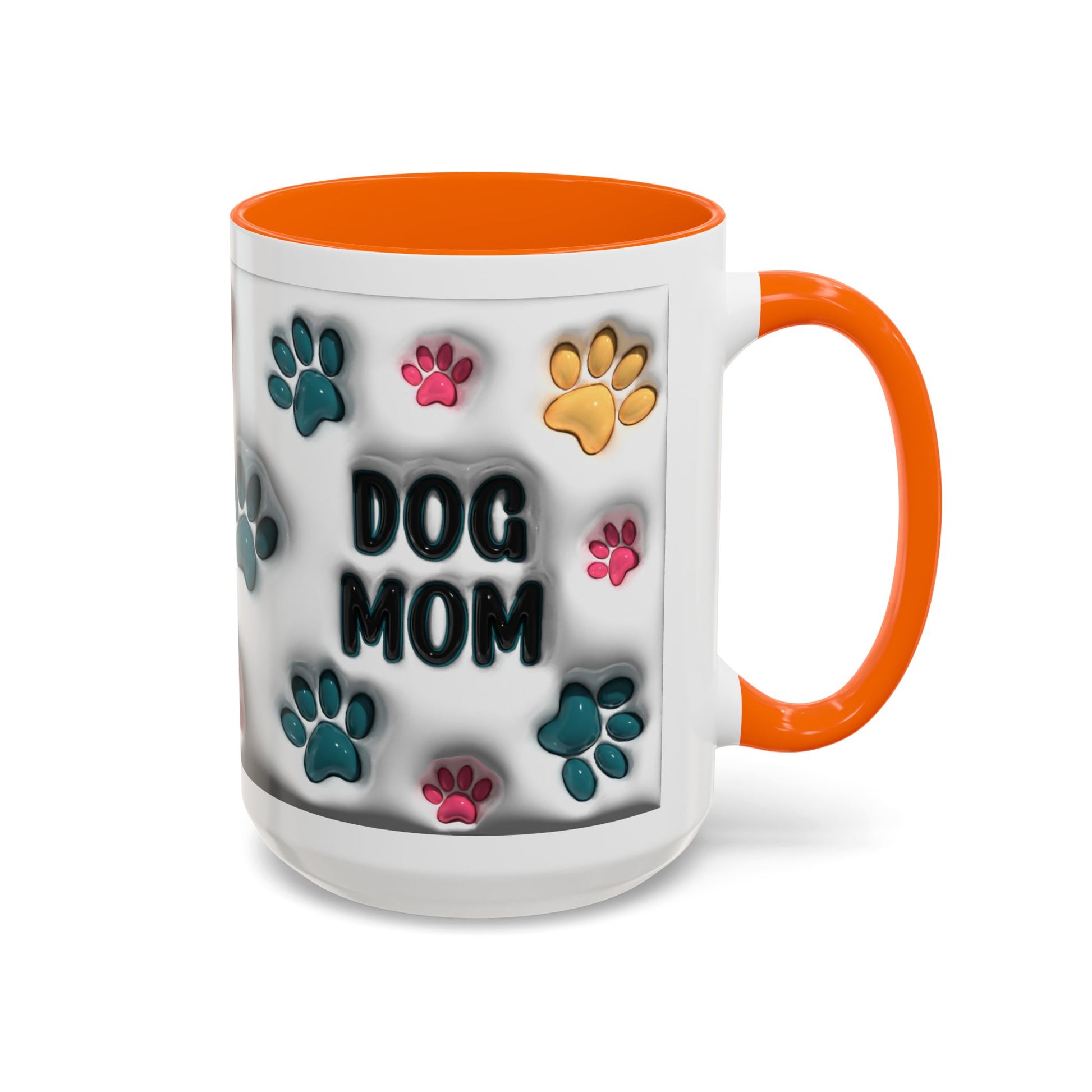 Celebrate your love for your furry best friend with this adorable Dog Mom accent mug! Featuring vibrant multicolor paw prints and bold lettering, this playful design is perfect for anyone who proudly claims the dog-mom title. The white ceramic exterior paired with a stylish colored interior and handle gives it a fun pop of personality—ideal for morning coffee, evening tea, or displaying on your counter as cute décor. Available in both 11oz and 15oz, this mug makes a thoughtful gift for every dog-loving heart.