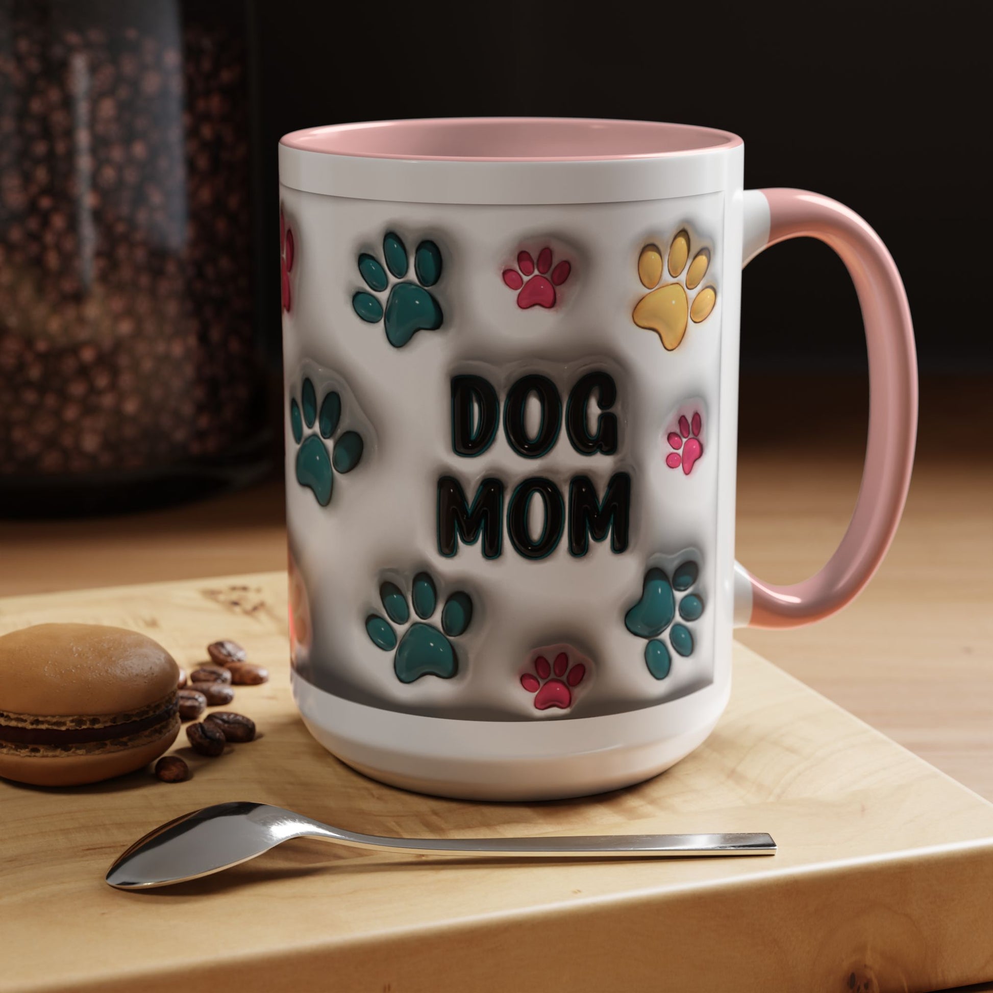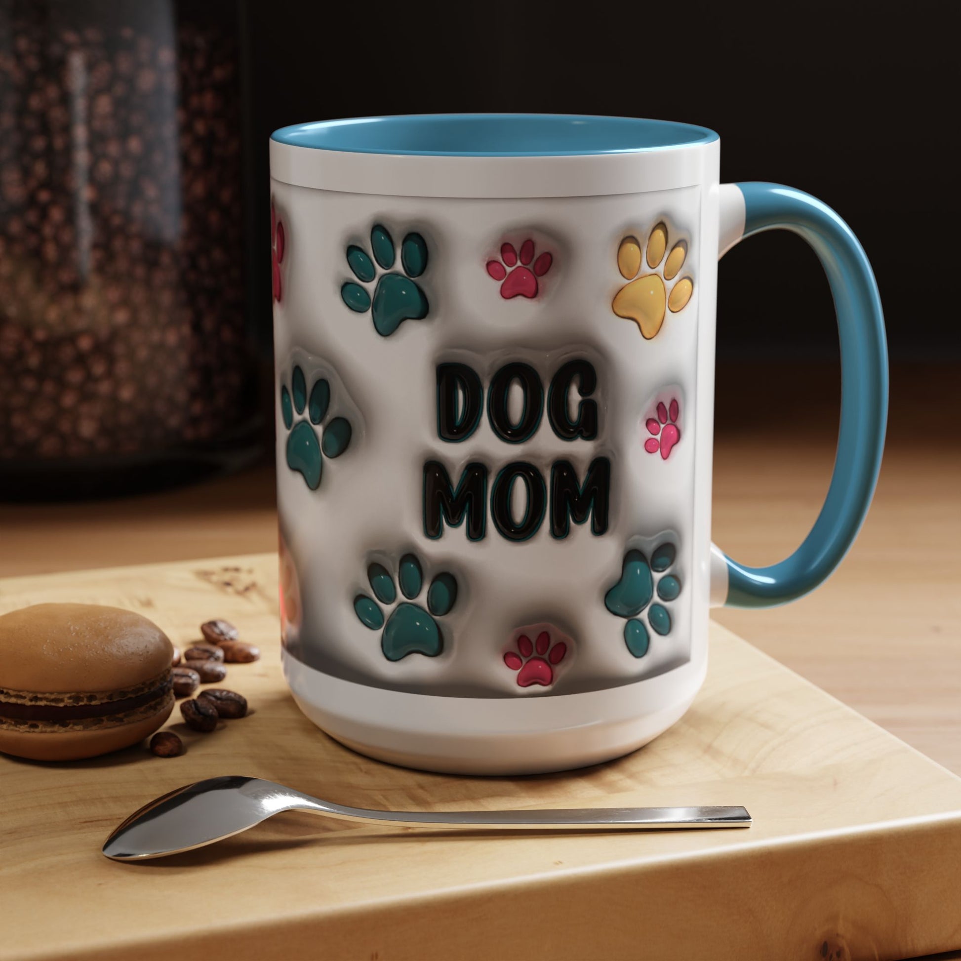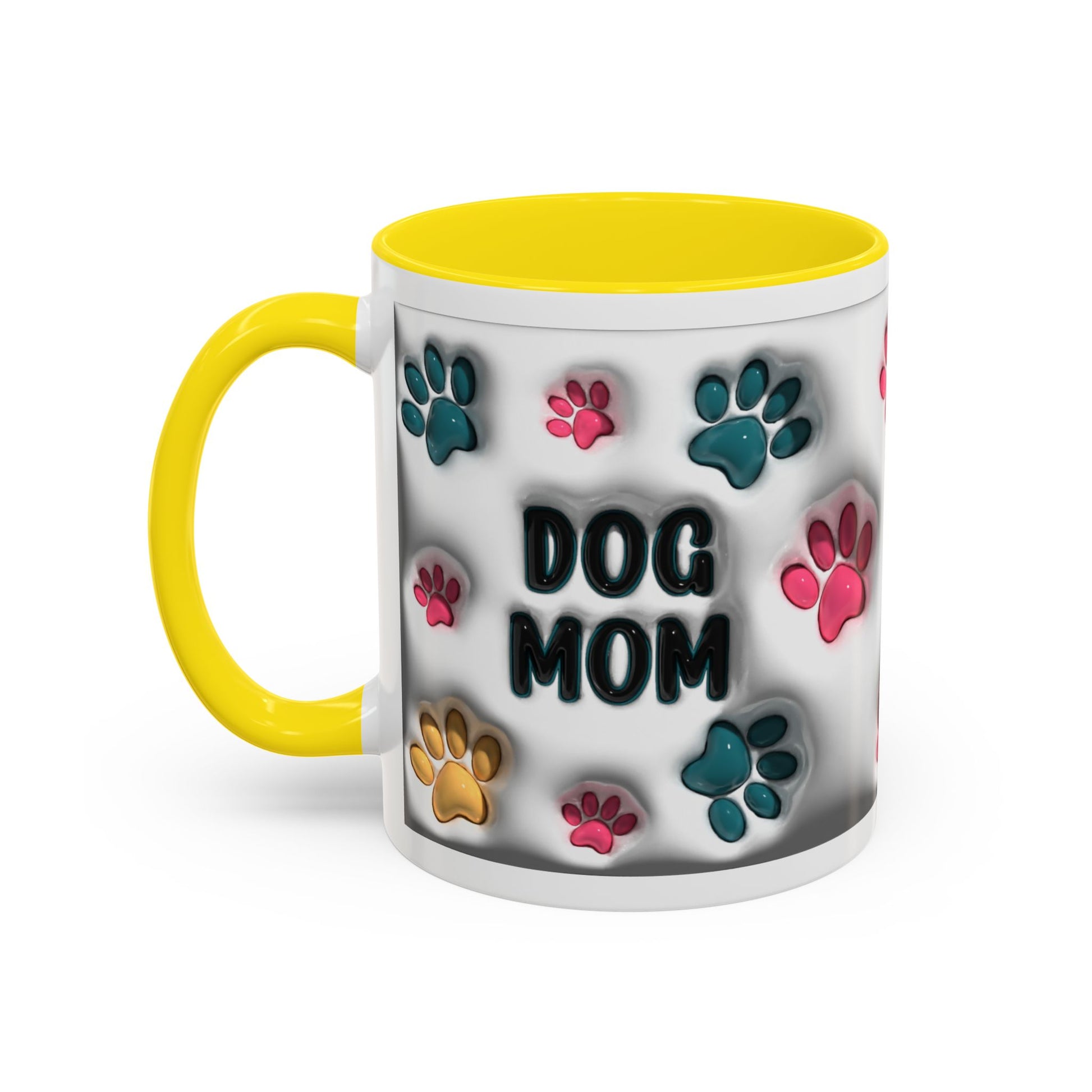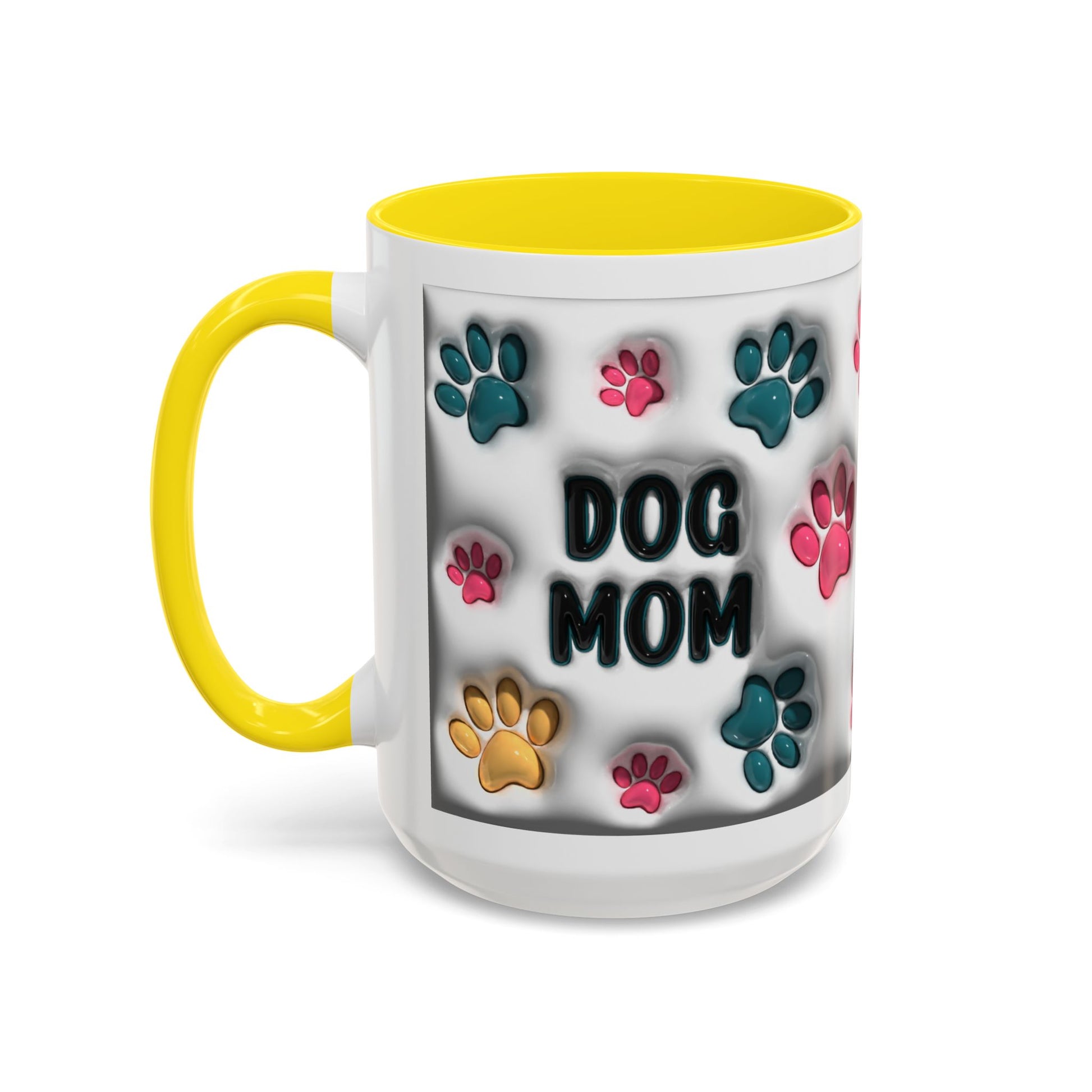 Celebrate your love for your furry best friend with this adorable Dog Mom accent mug! Featuring vibrant multicolor paw prints and bold lettering, this playful design is perfect for anyone who proudly claims the dog-mom title. The white ceramic exterior paired with a stylish colored interior and handle gives it a fun pop of personality—ideal for morning coffee, evening tea, or displaying on your counter as cute décor. Available in both 11oz and 15oz, this mug makes a thoughtful gift for every dog-loving heart.