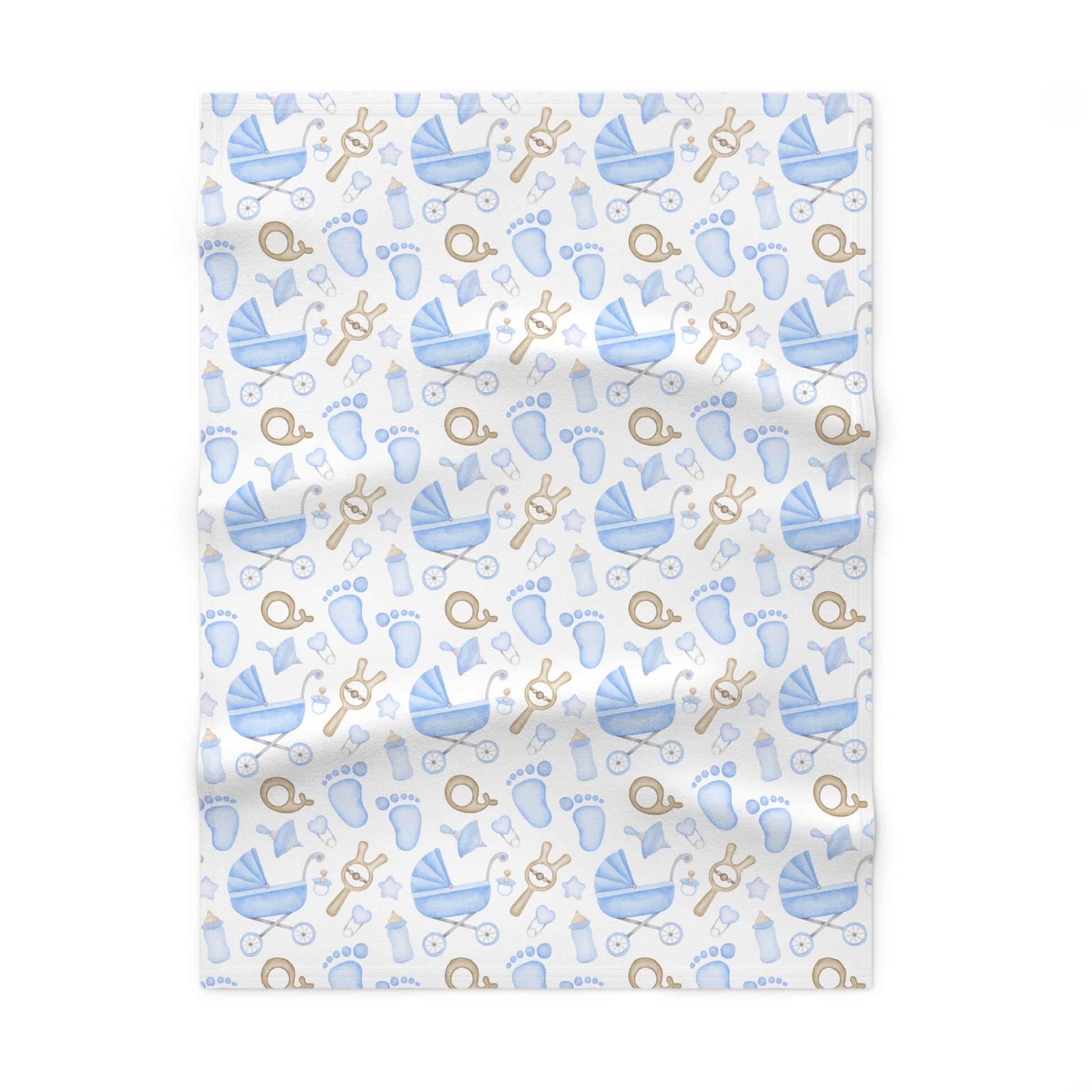 Clean, classic, and cuddle-soft—this velveteen plush blanket features watercolor baby icons in soft baby blue (stroller, booties, bottles, rattles, tiny footprints, and stars) on a crisp white background. The velvety handfeel is perfect for tummy time, stroller rides, and cozy naps, and the pastel palette photographs beautifully for newborn pictures and nursery reveals.