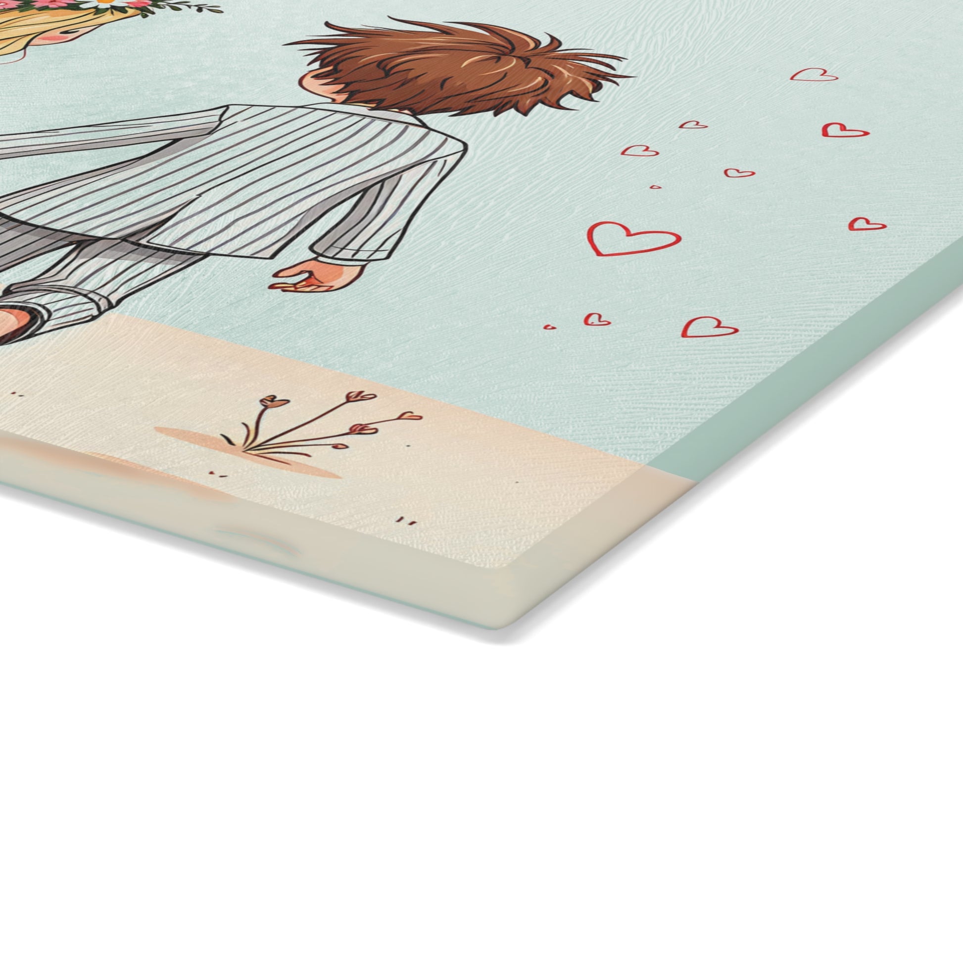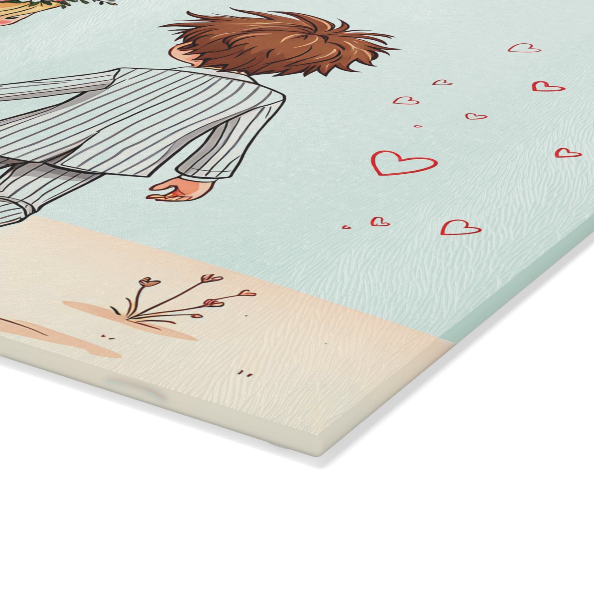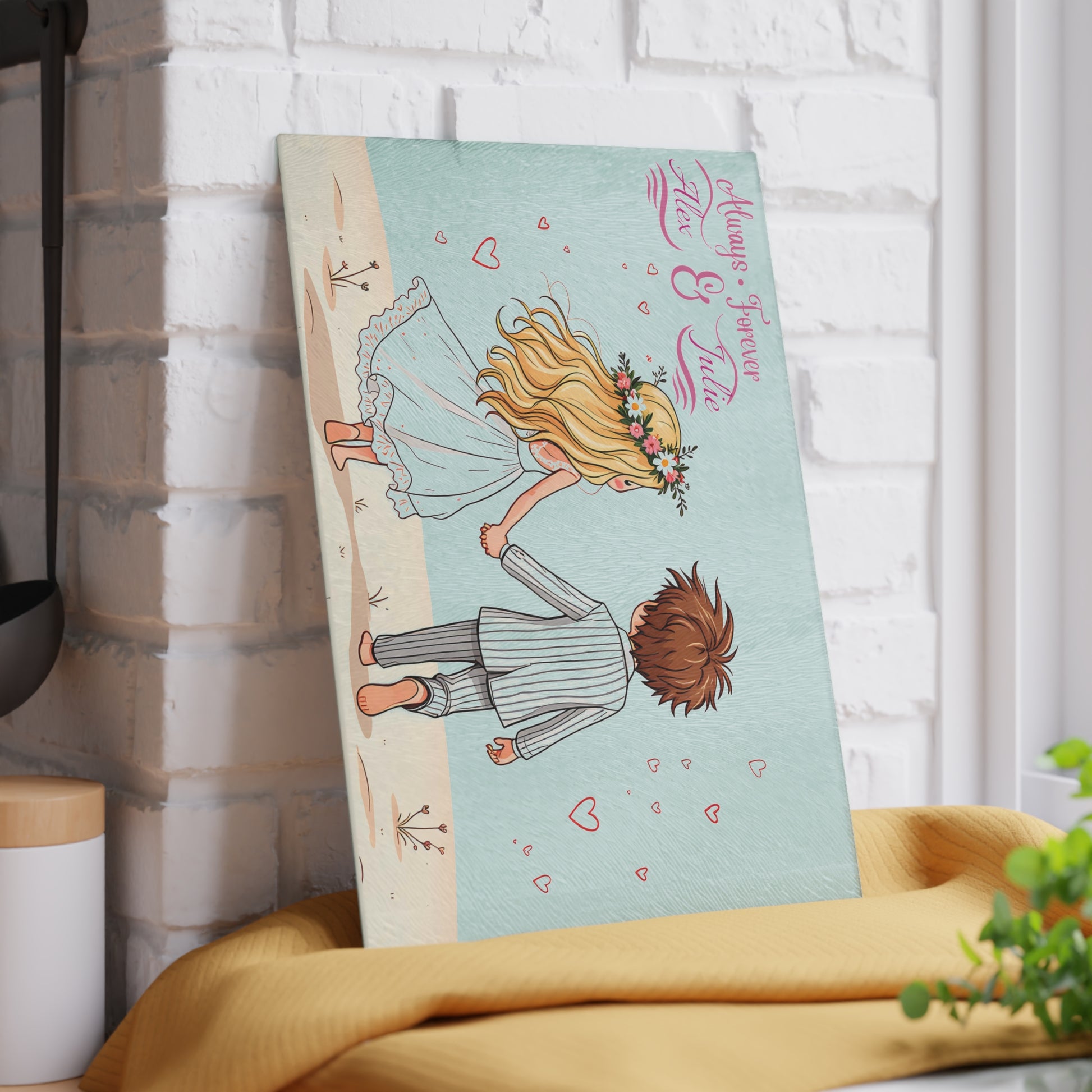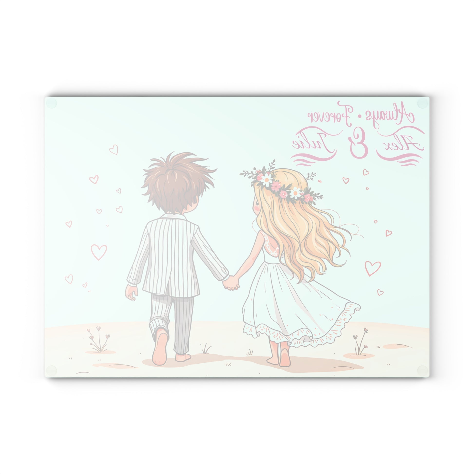 Celebrate love with this enchanting cutting board featuring a barefoot bride and groom holding hands on a pastel beach backdrop. Accented with soft hearts and floral details, this sweet and whimsical design can be personalized with your names for a meaningful wedding gift, anniversary surprise, or romantic kitchen accent. A heartfelt keepsake for couples who walk through life hand in hand.