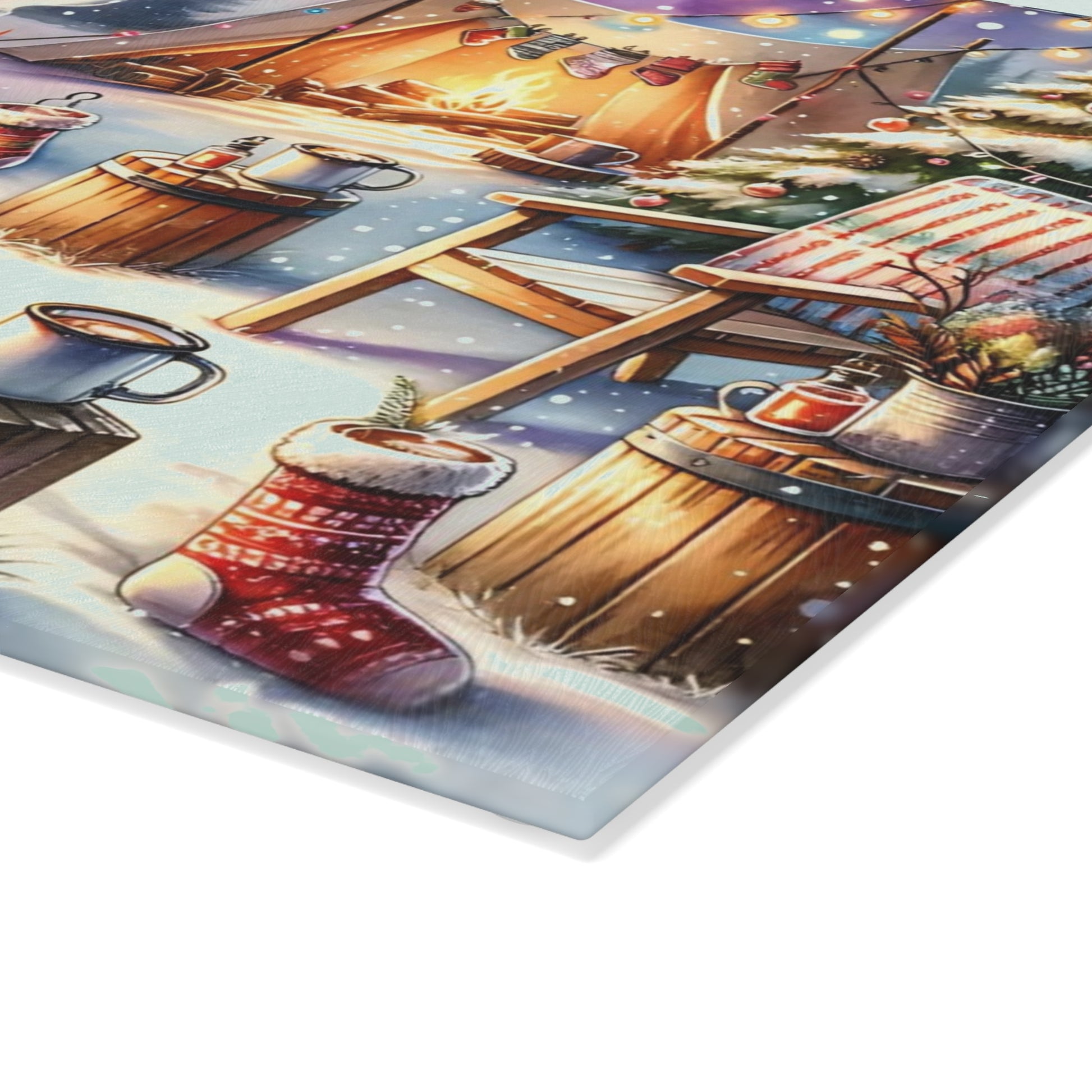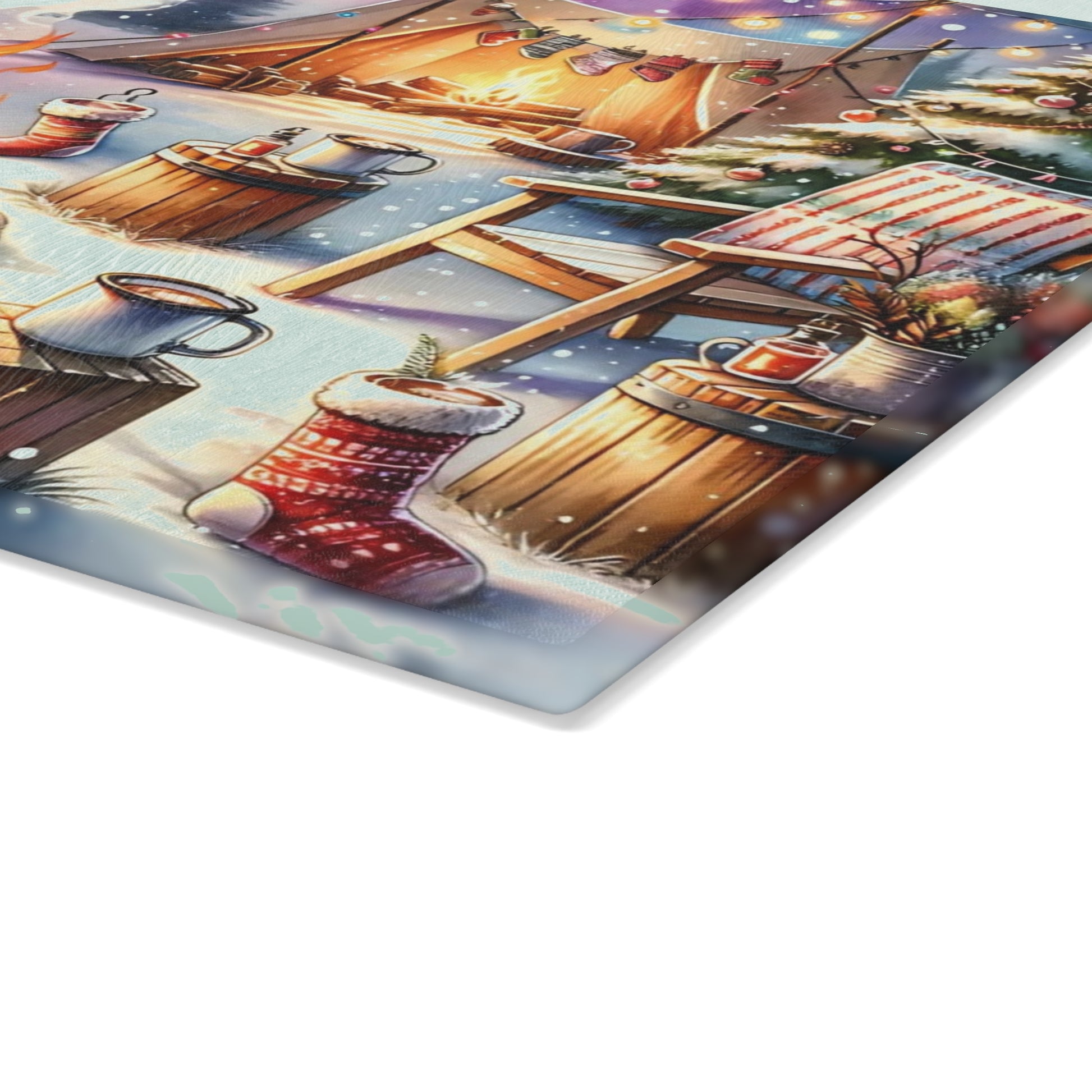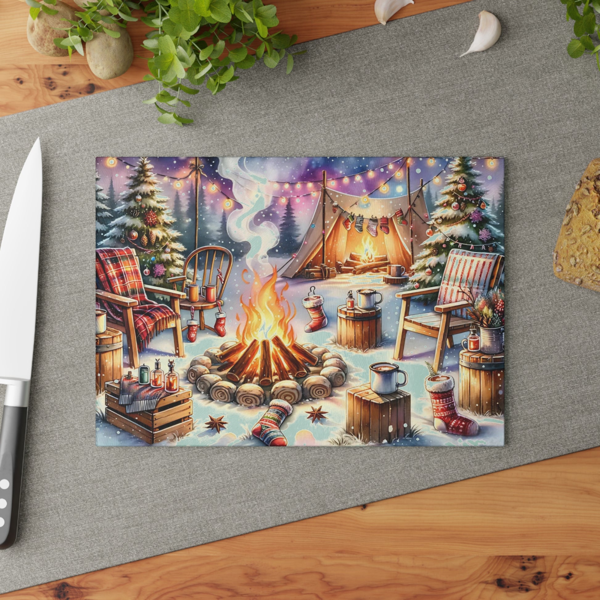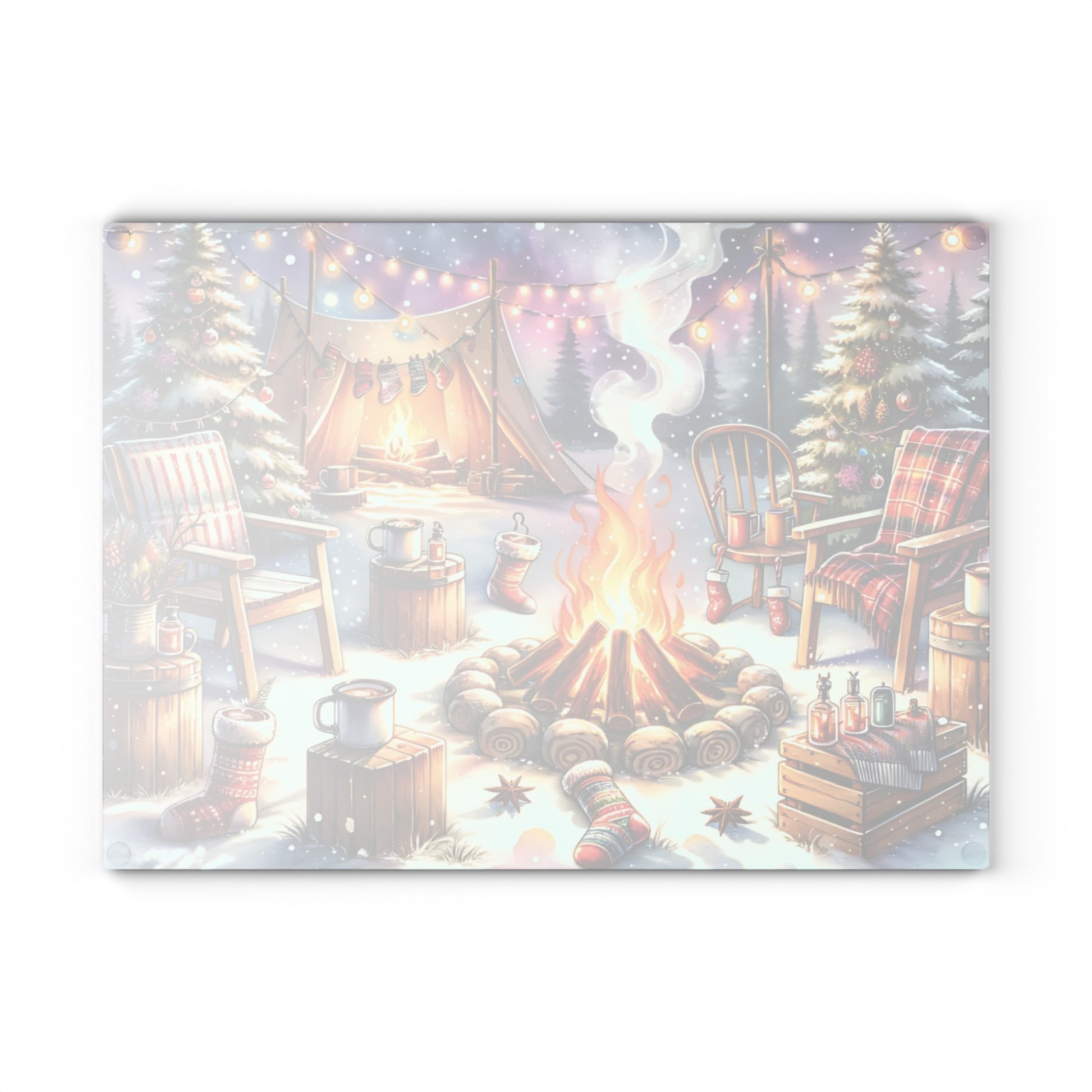 🔥🏕️ “Cozy Campfire Christmas” Glass Cutting Board – Winter Charm for Your Kitchen