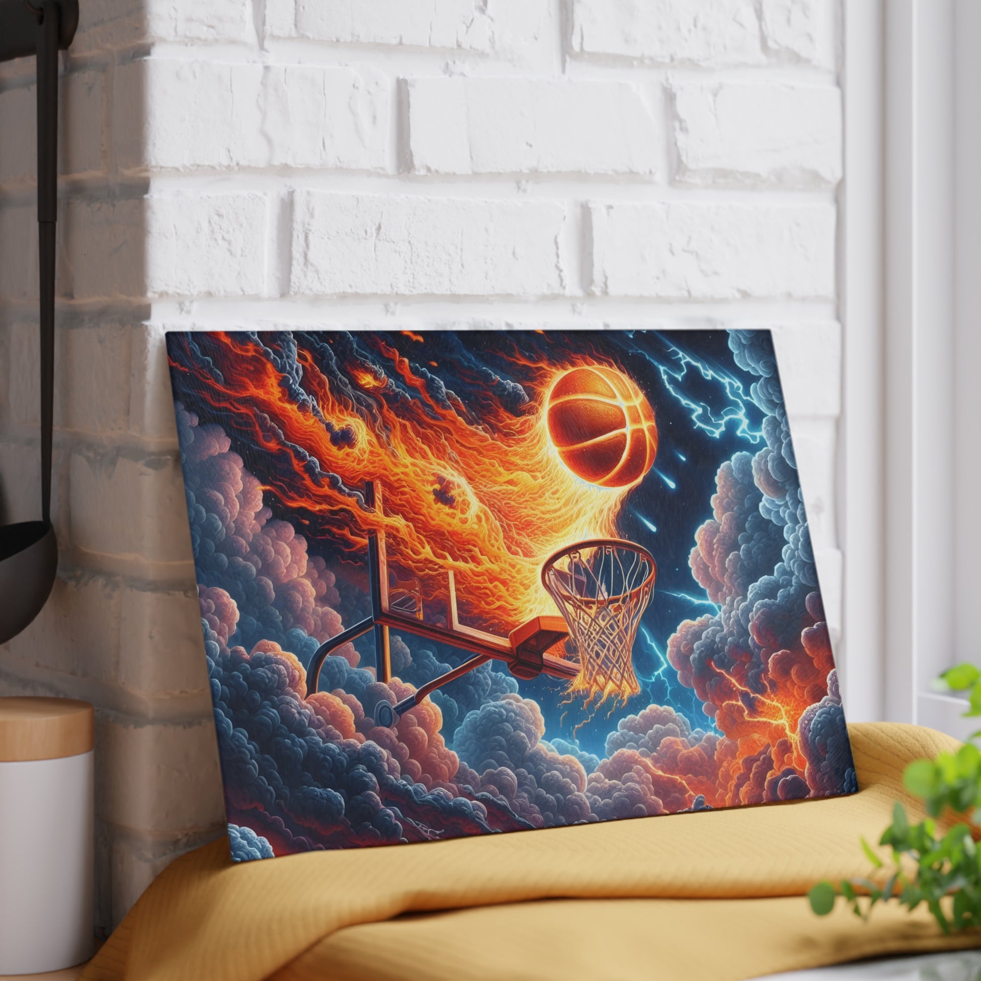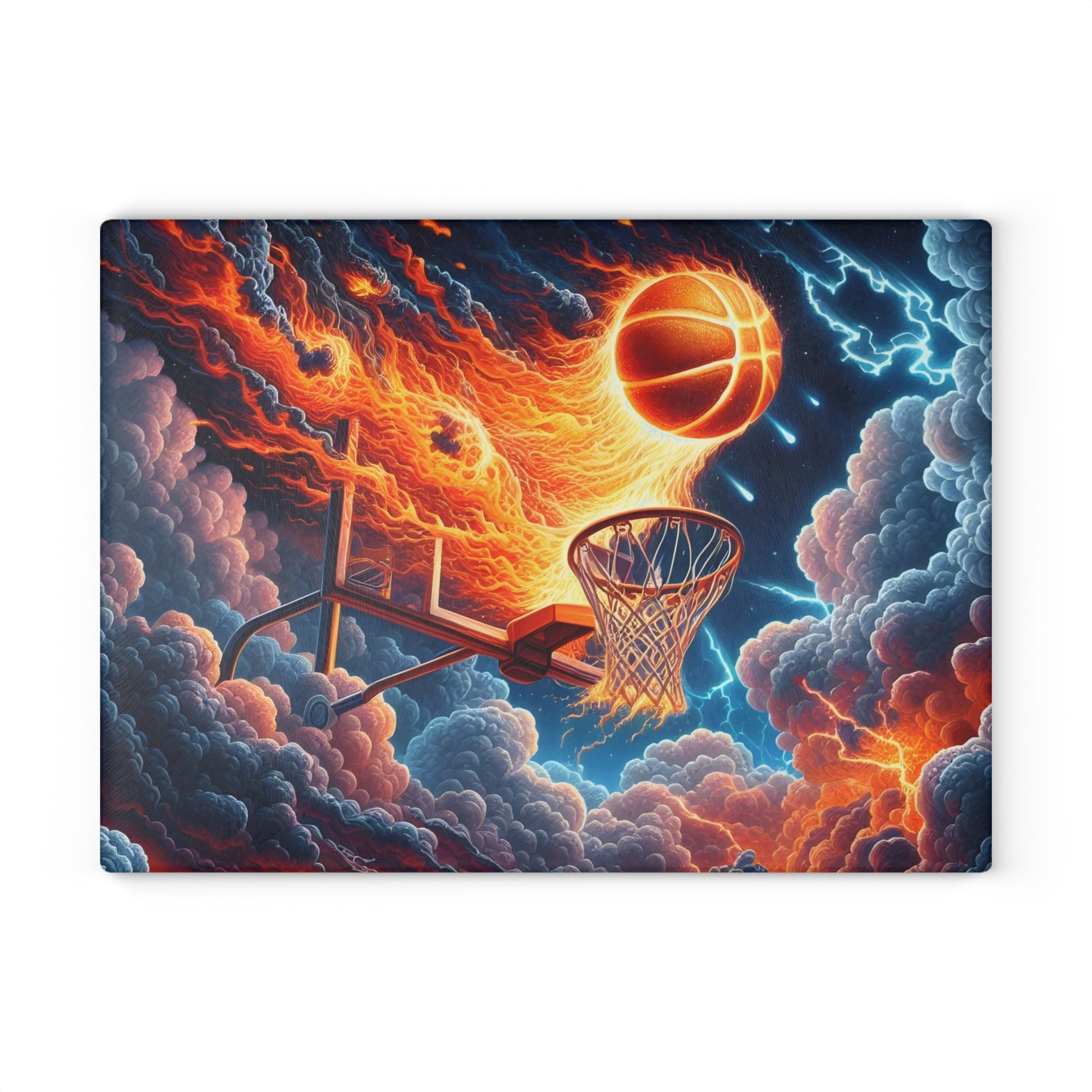 Turn up the intensity in your kitchen with this bold and fiery basketball cutting board. Featuring a blazing basketball streaking through the sky with electric energy, this design is perfect for sports lovers who want to show off their passion for the game.