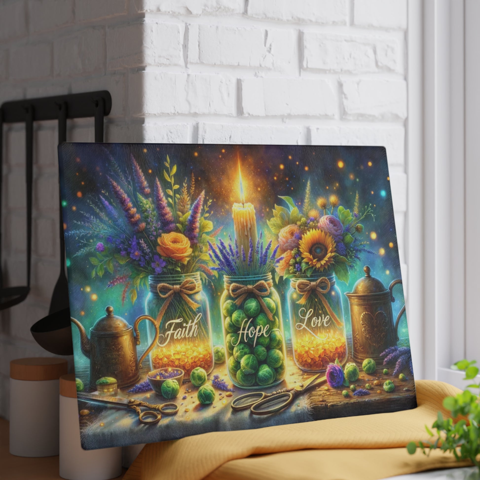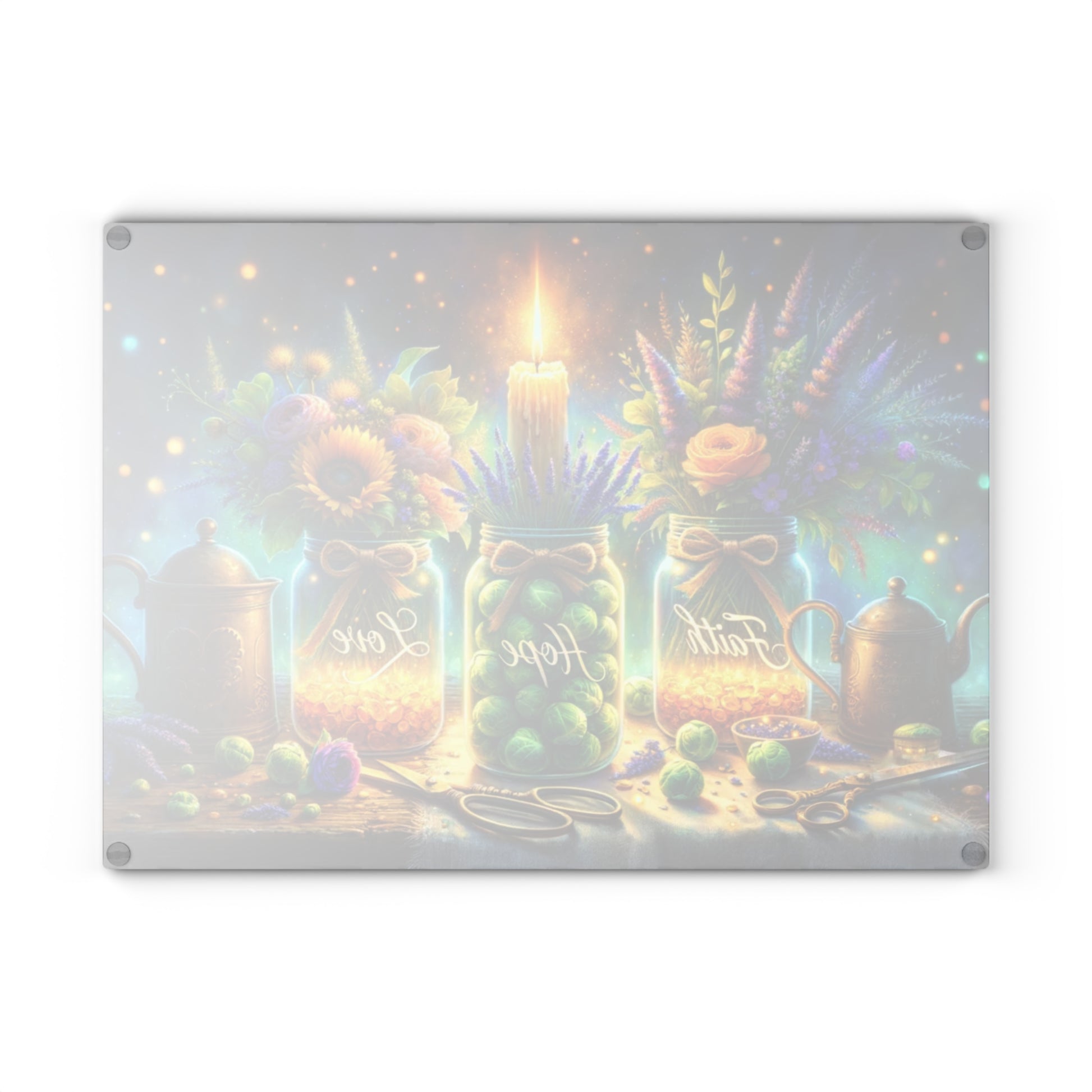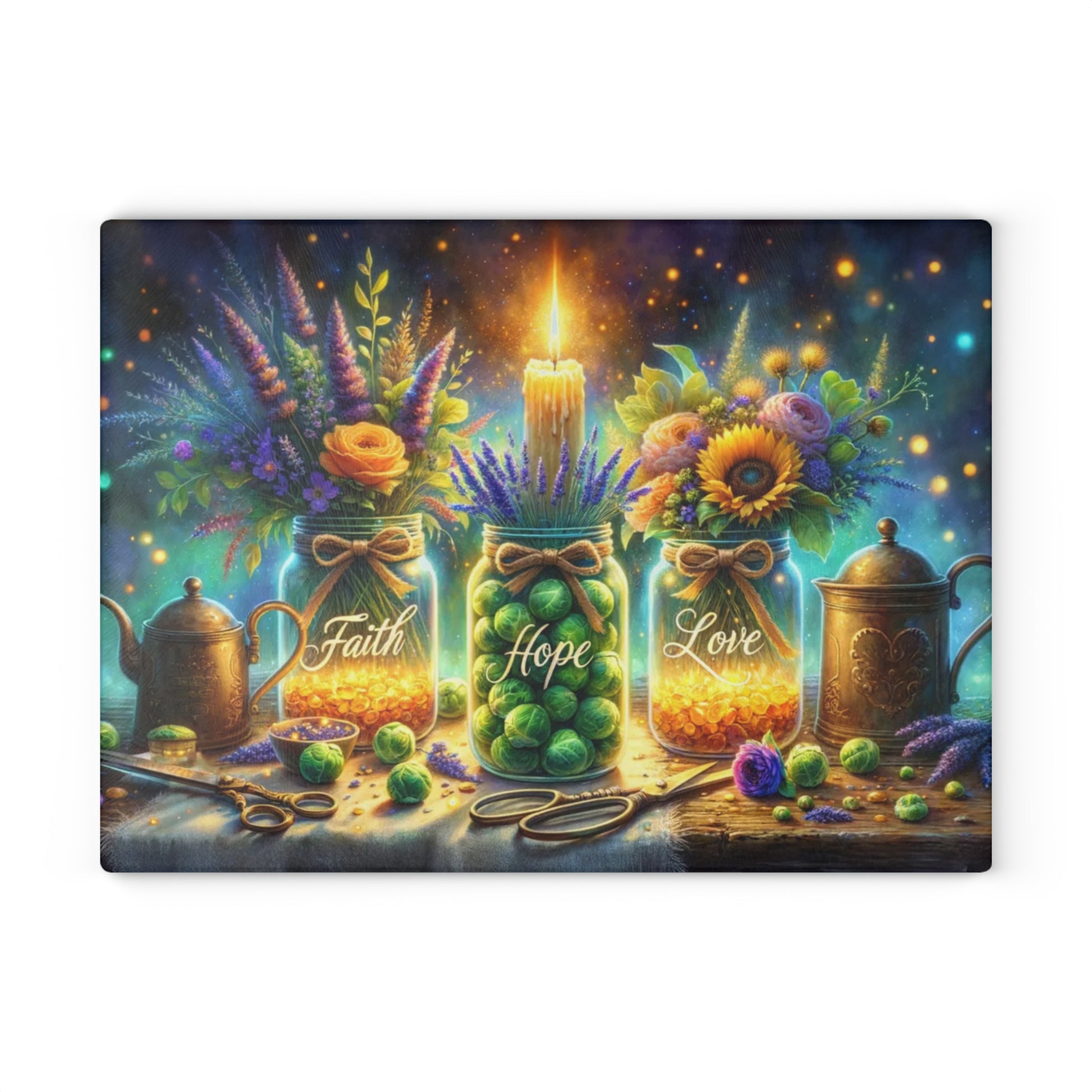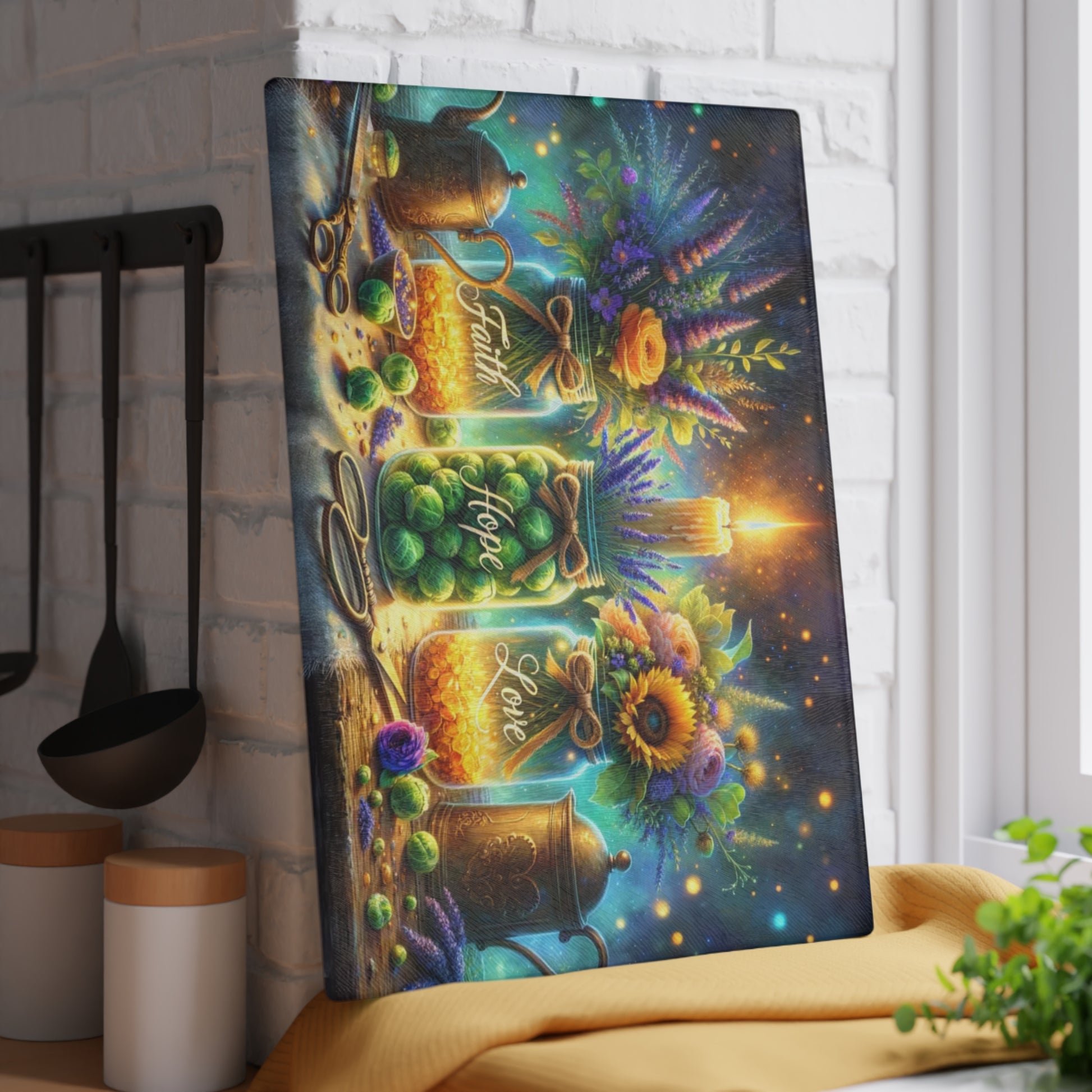 Bring comfort and charm to your counters with this luminous “Faith • Hope • Love” glass cutting board. Three glowing mason jars brimming with lavender, roses, and sunflowers surround a serene candlelight scene—perfect for anyone who loves inspirational décor with a cozy farmhouse touch.