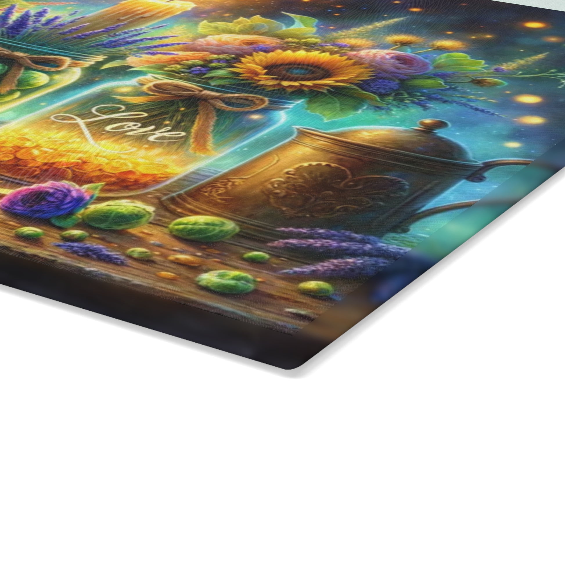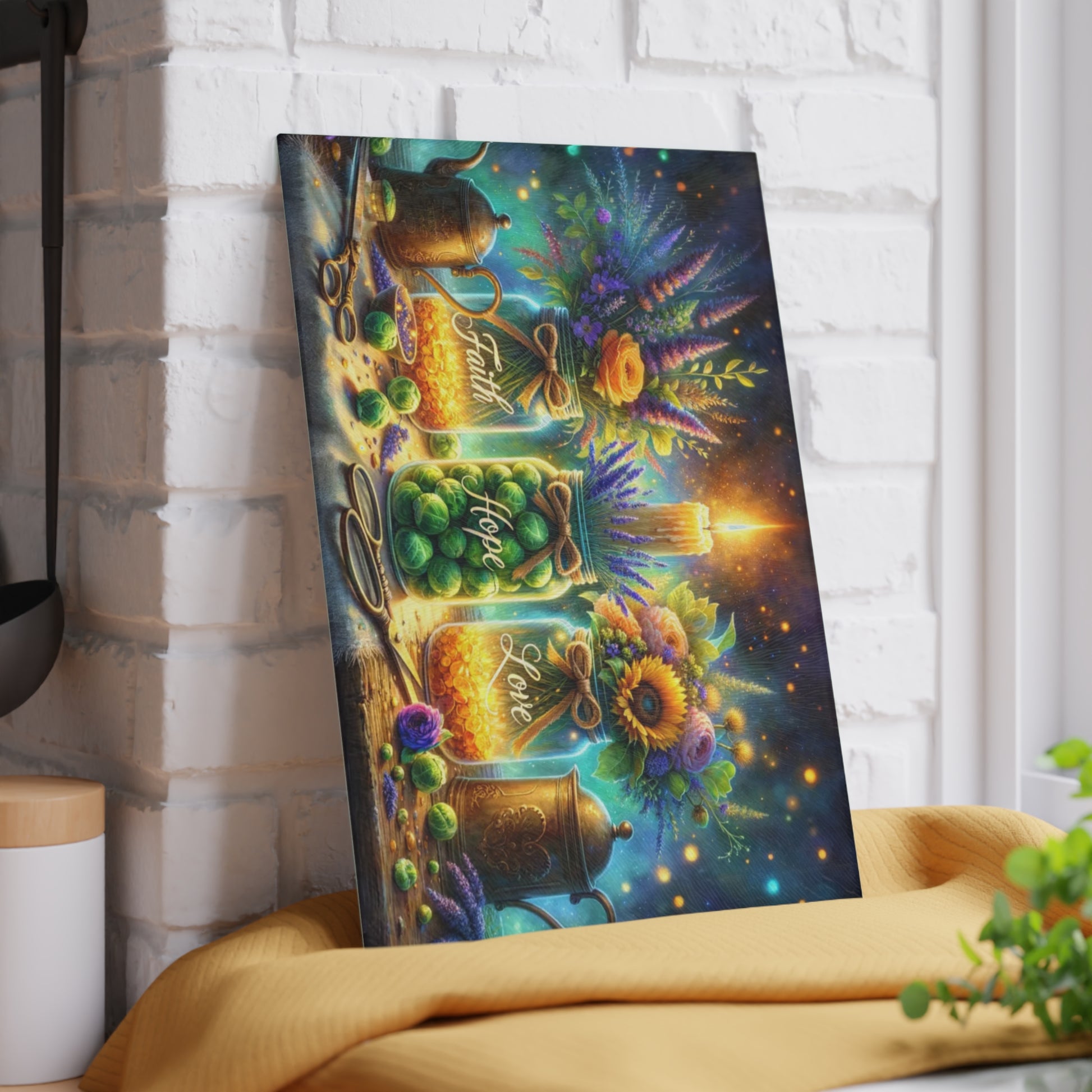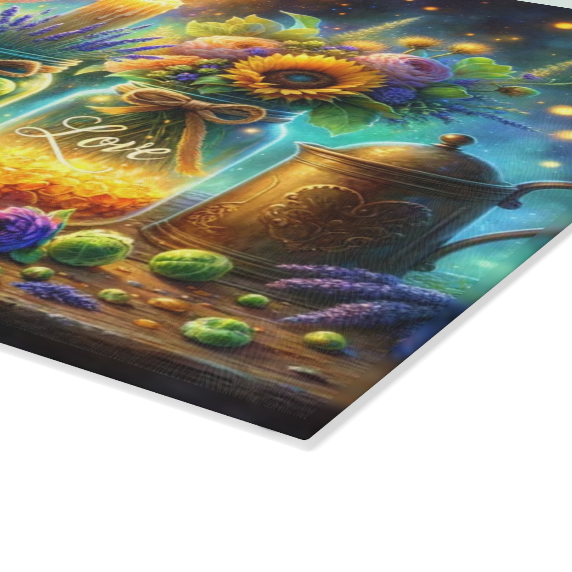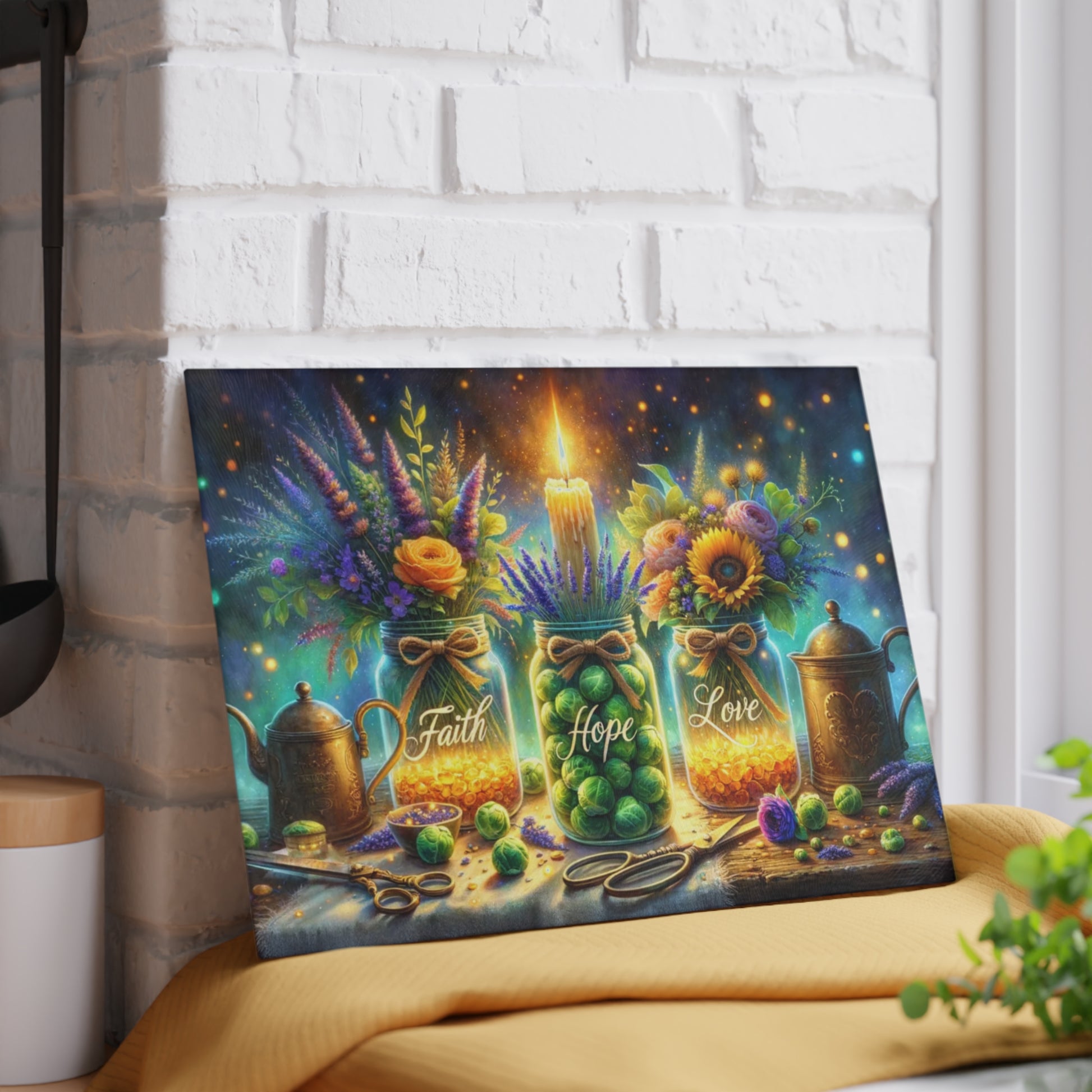 Bring comfort and charm to your counters with this luminous “Faith • Hope • Love” glass cutting board. Three glowing mason jars brimming with lavender, roses, and sunflowers surround a serene candlelight scene—perfect for anyone who loves inspirational décor with a cozy farmhouse touch.