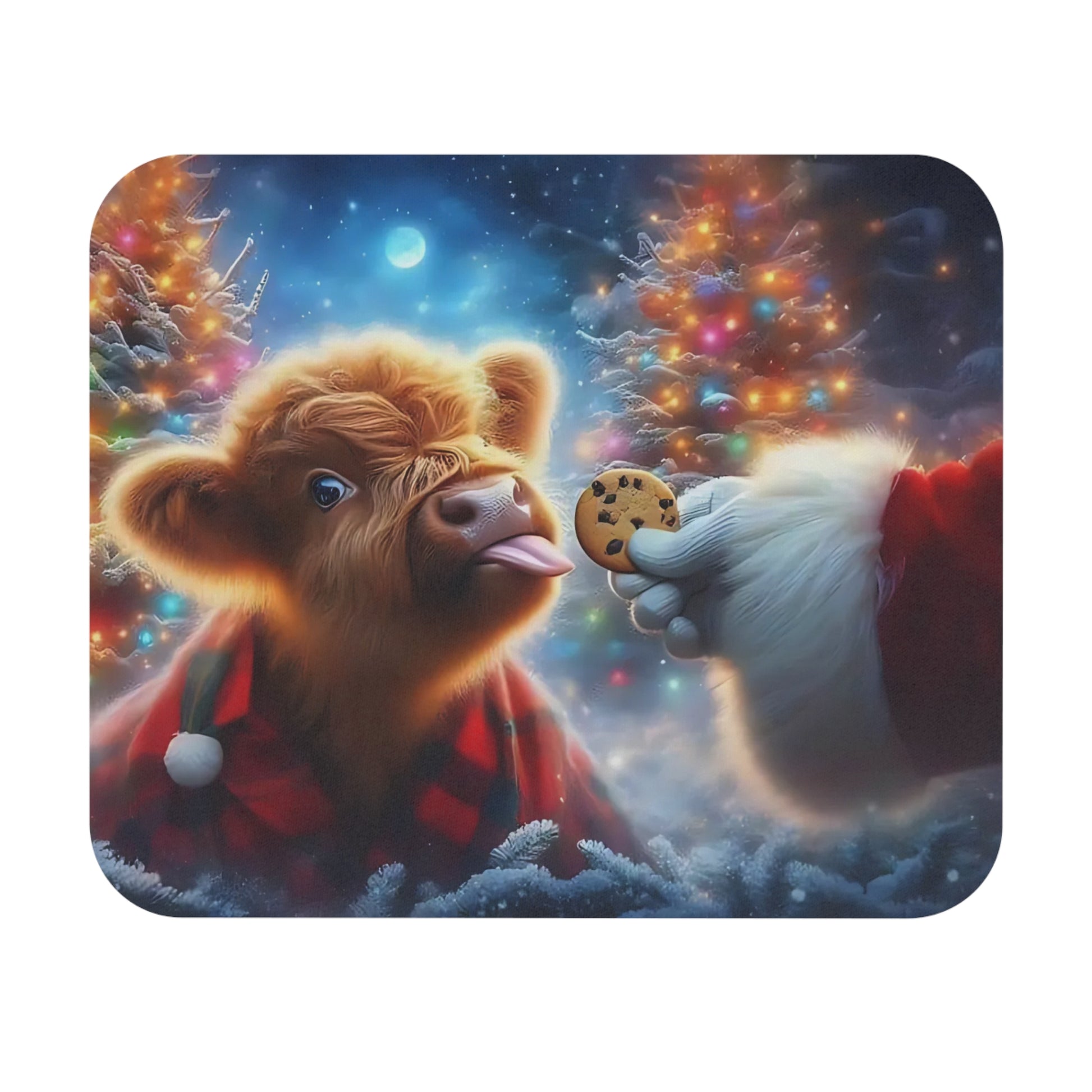 ๐Ÿ–ฑ๏ธ๐ŸŽ„๐Ÿฎ Christmas Highland Calf Mouse Pad โ€“ Santa Cookie & Holiday Lights