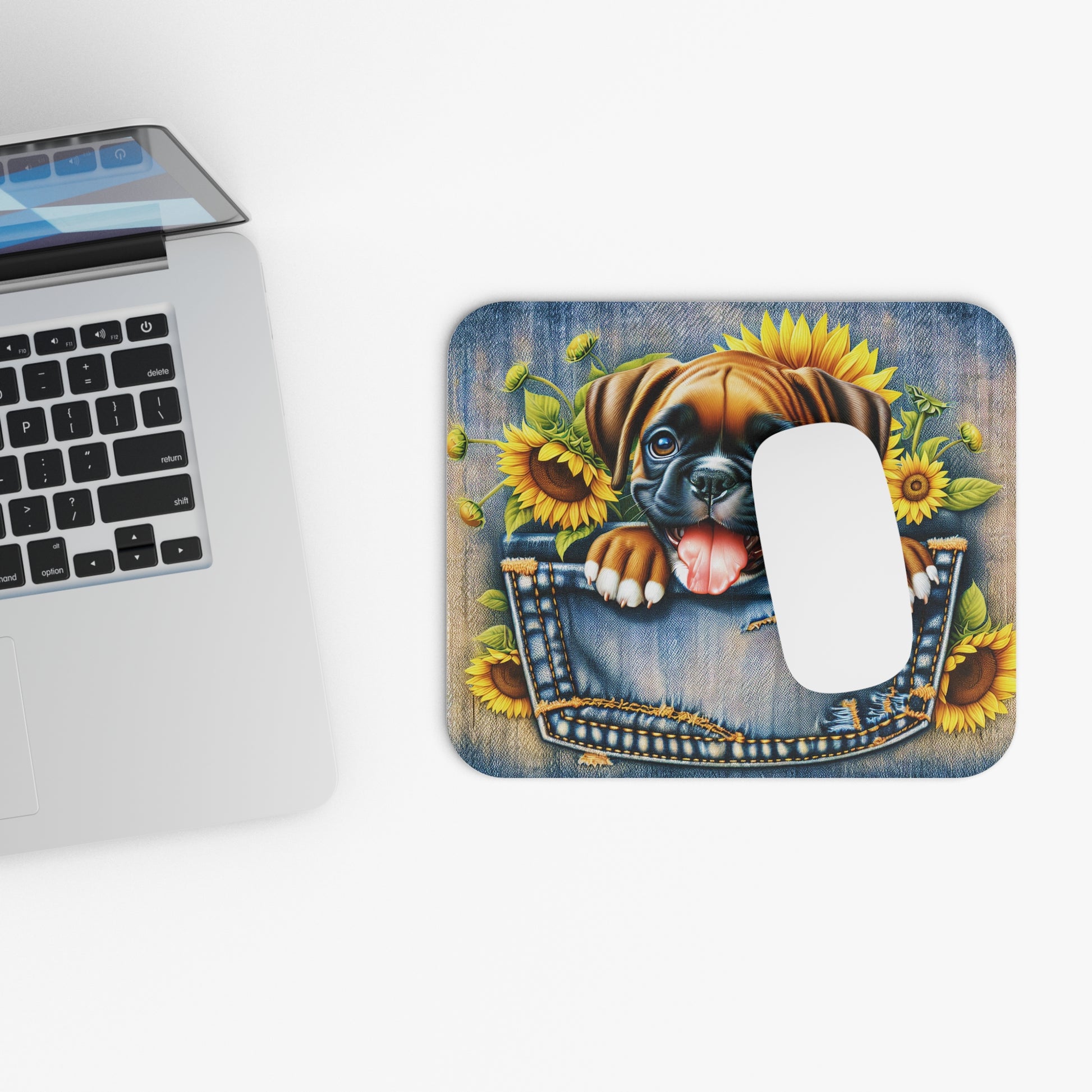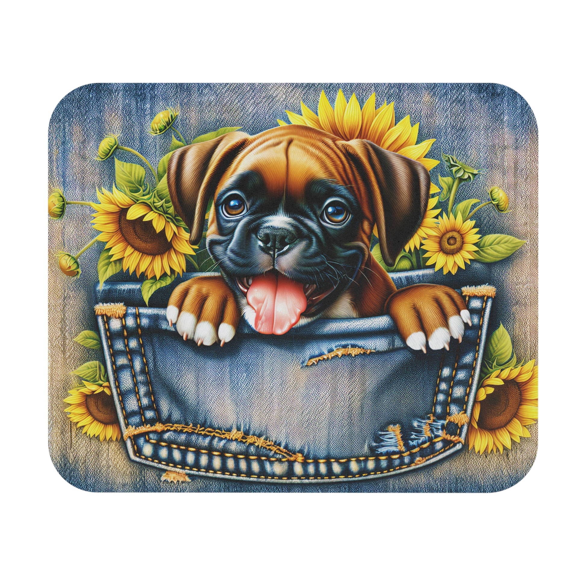 🖱️🐶🌻 Denim Pocket Puppy Mouse Pad – Cute Boxer Pup with Sunflowers