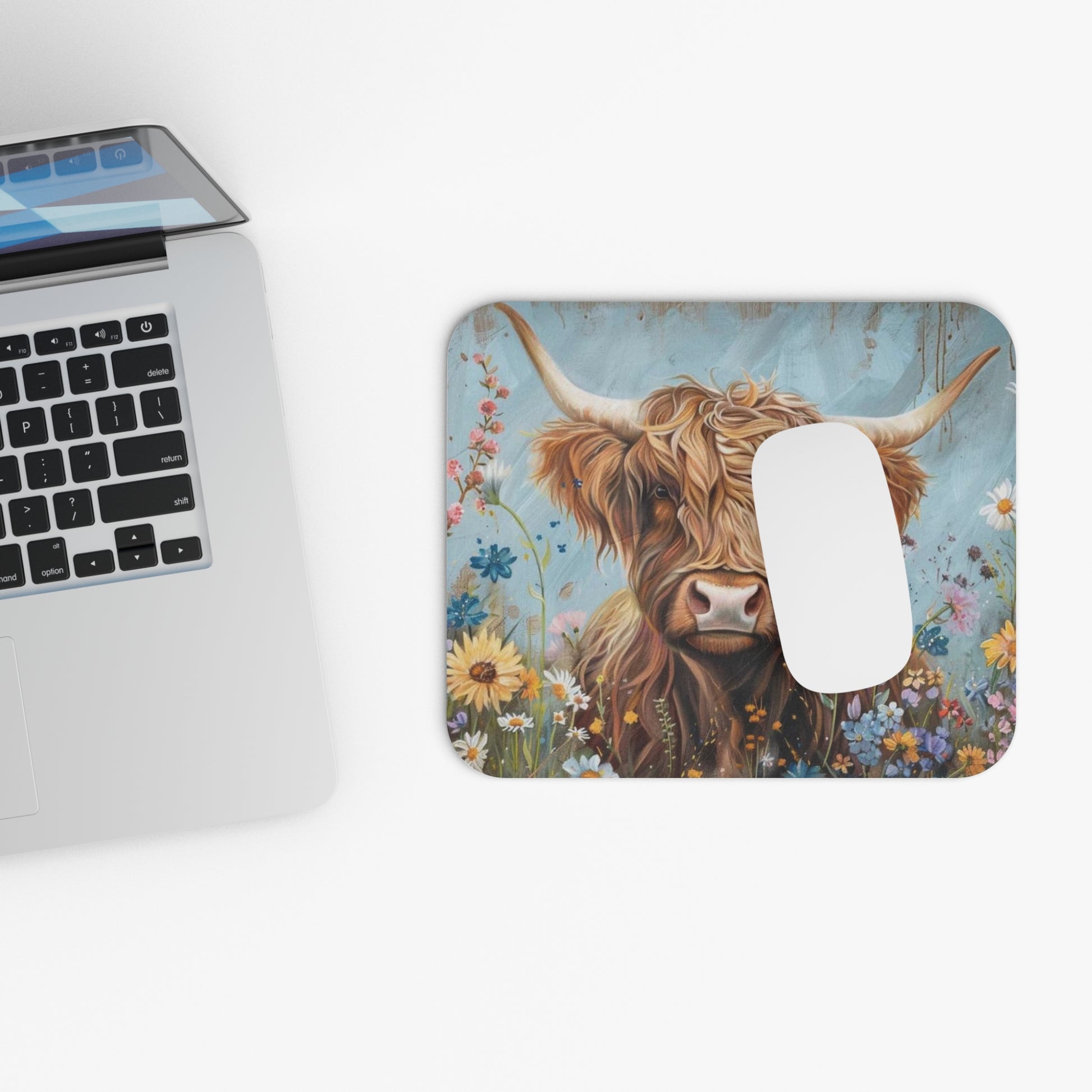 🖱️🐮 Highland Cow & Wildflowers Mouse Pad – Rustic Boho Desk Art
