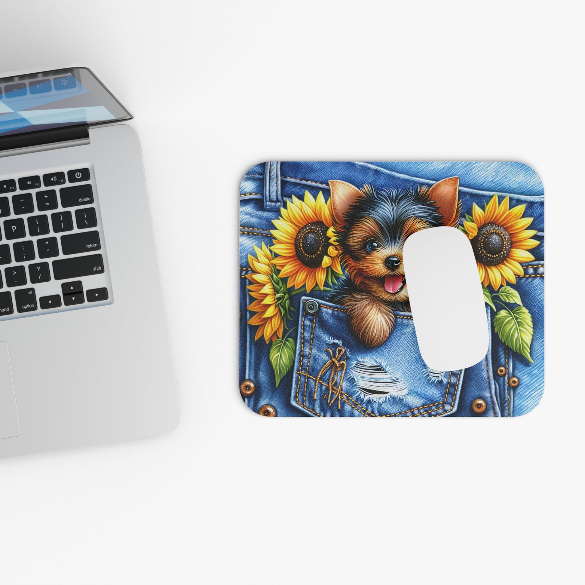Brighten your workspace with a happy little Yorkie peeking from a stitched denim pocket, framed by sunny sunflowers. Built for everyday comfort and performance—smooth tracking, slim profile, and a dependable non-slip base.